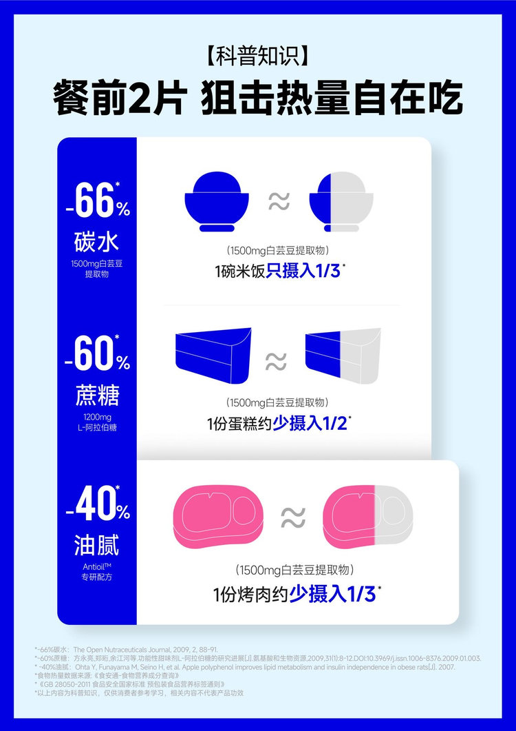 添加了1500mg白芸豆提取物+1200mg阿拉伯糖+独家ATO阻油配方阻断66%的碳水+60%的糖分+40%的油脂真人实证饭后不反弹!不节食