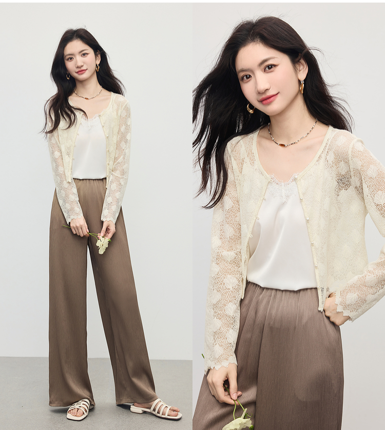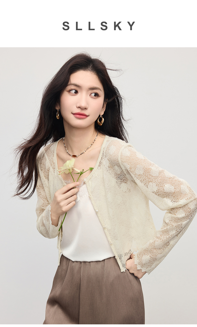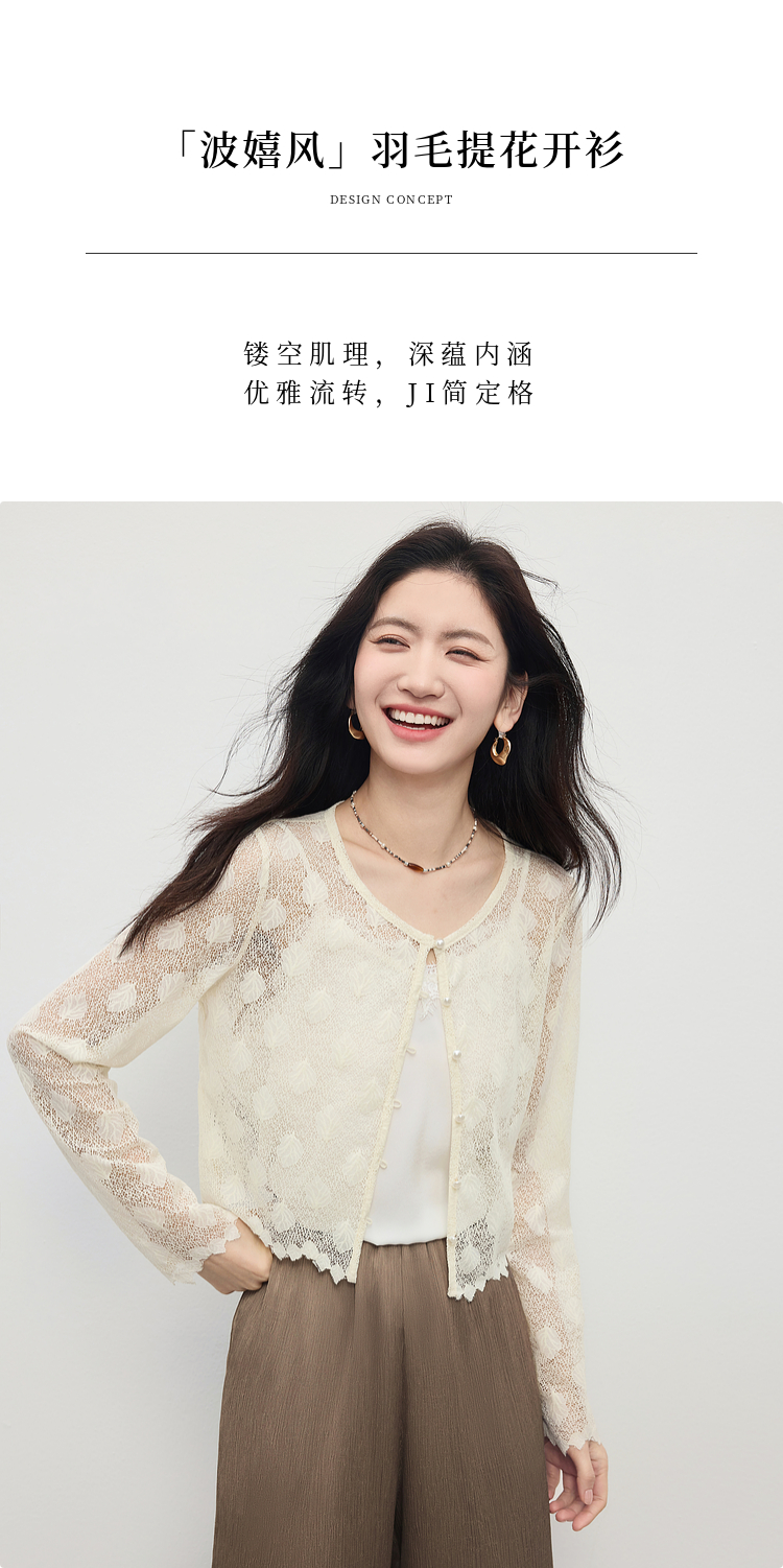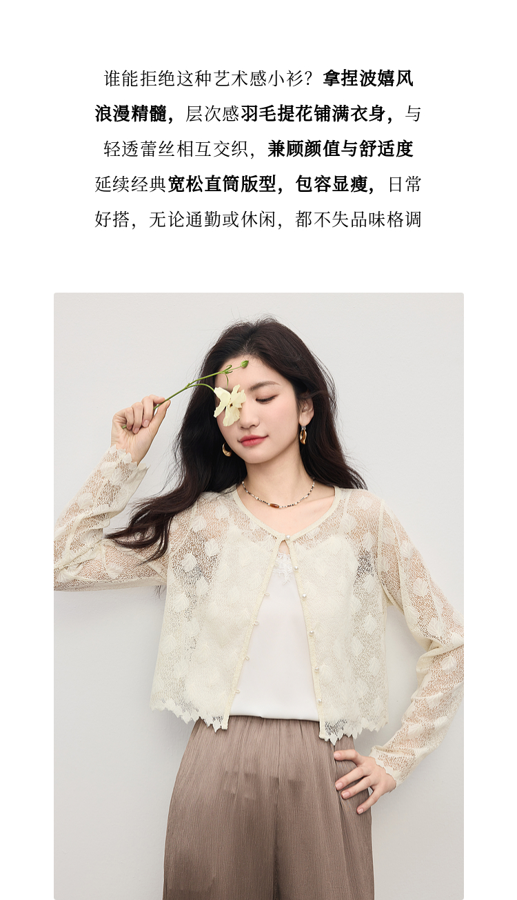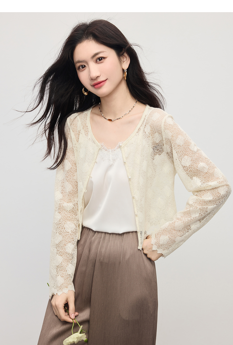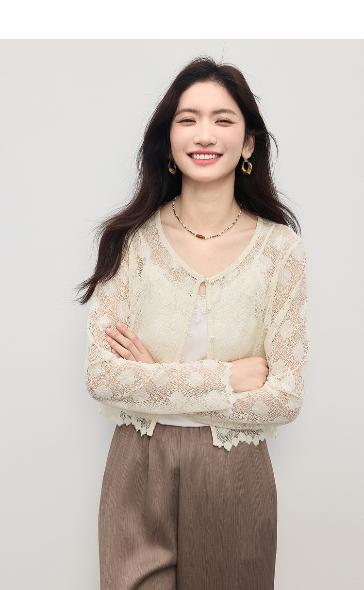熙世界轻薄透气镂空蕾丝小衫女高级感夏新款提花外搭短款开衫上衣