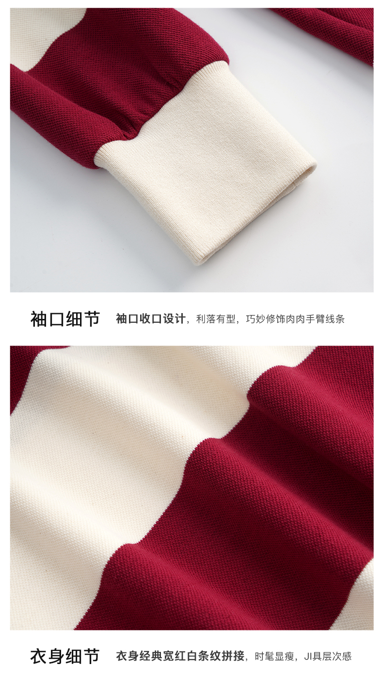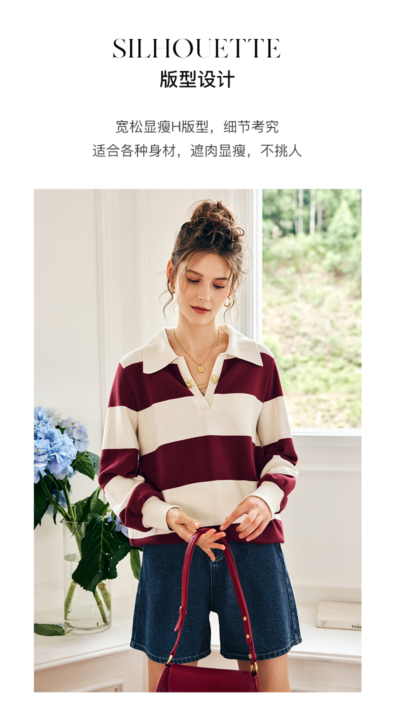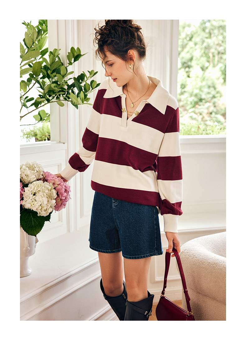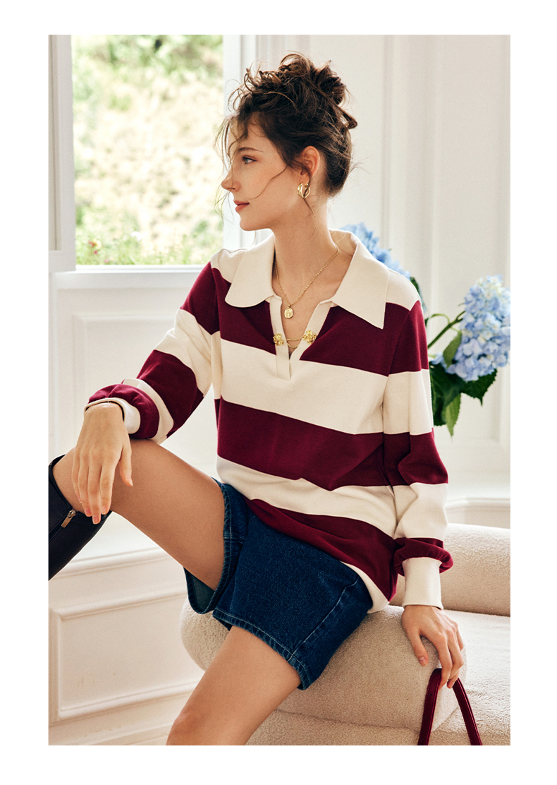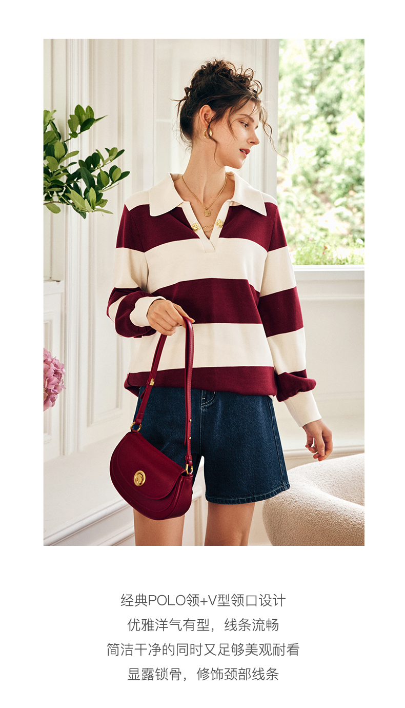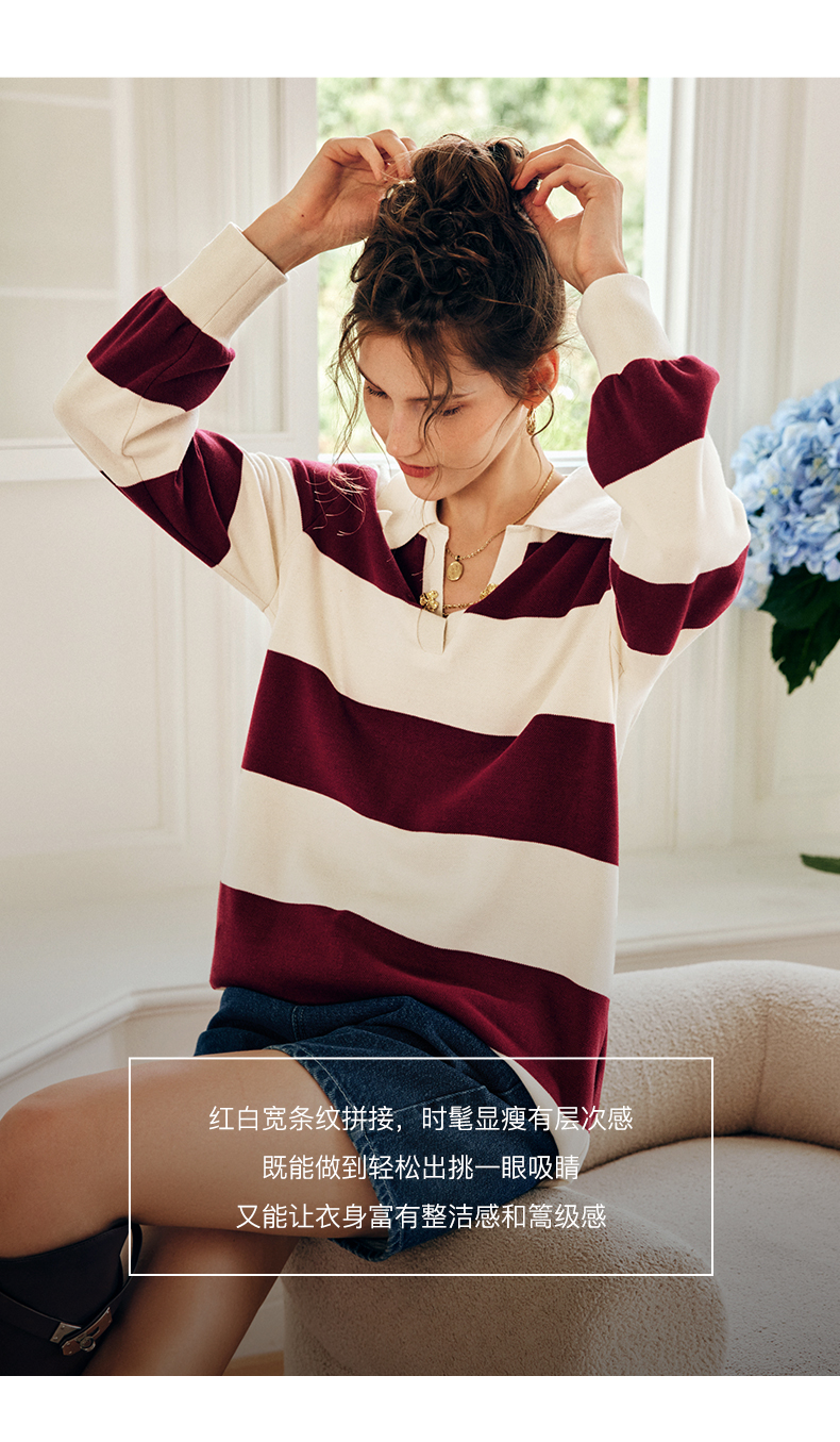OLrain欧芮儿法式条纹卫衣女秋季2022新款宽松复古polo领长袖上衣