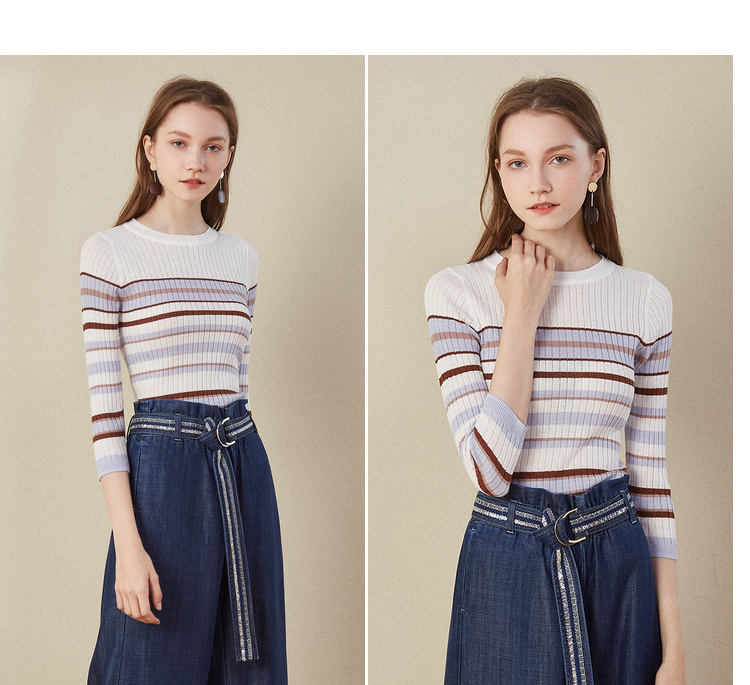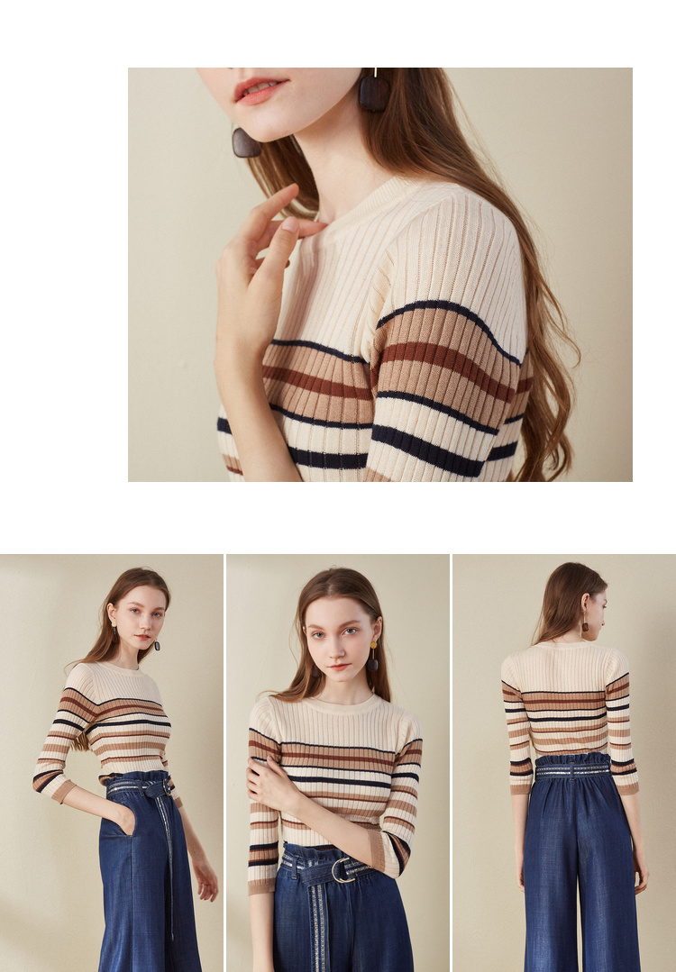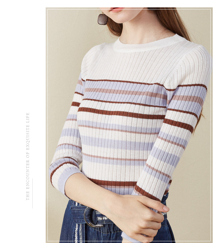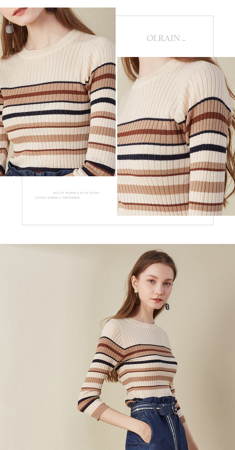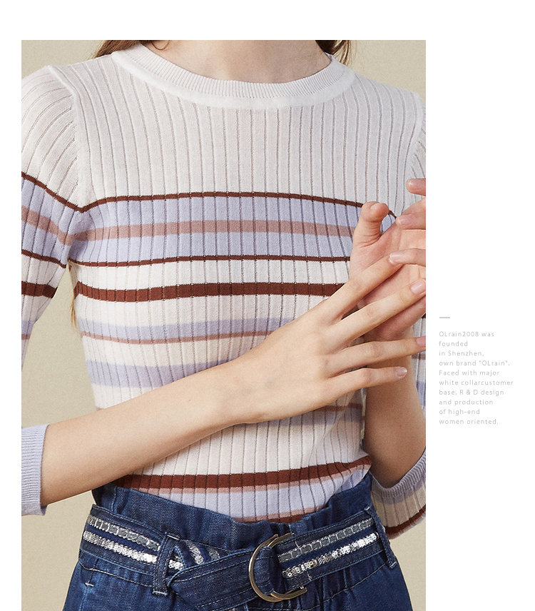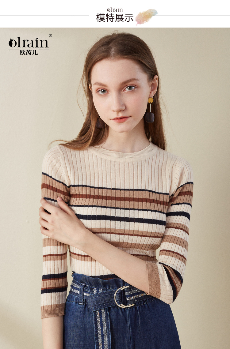 欧芮儿2018早秋新款条纹针织衫薄上衣韩版七分袖套头圆领毛衣