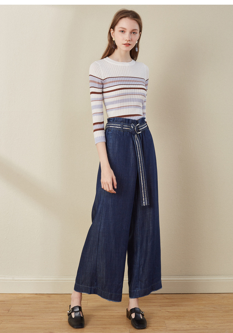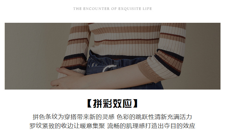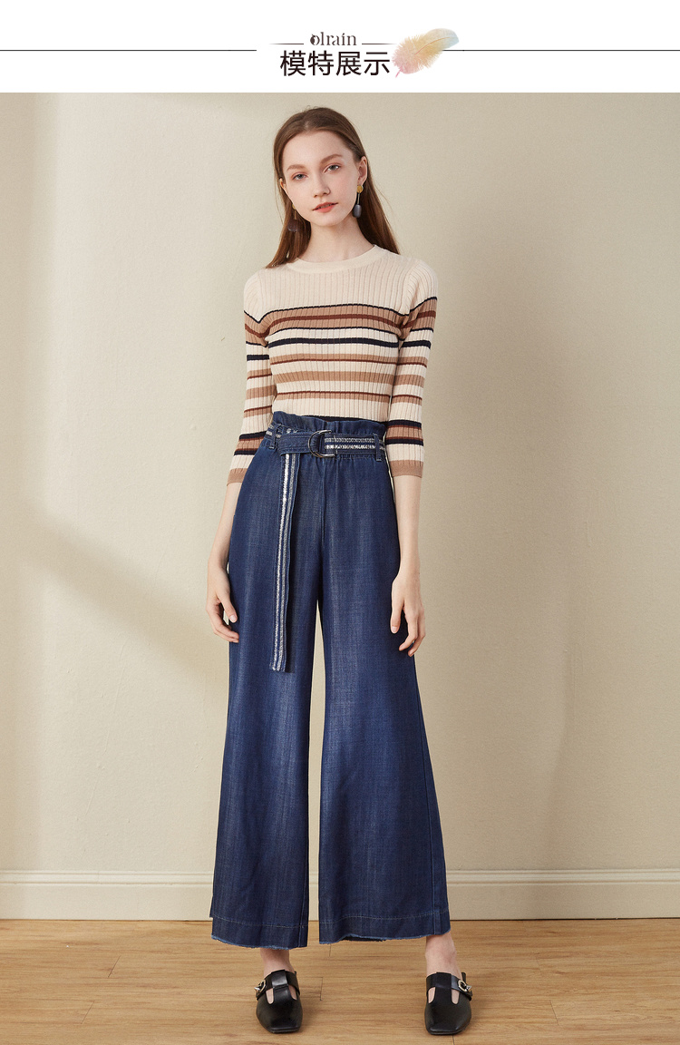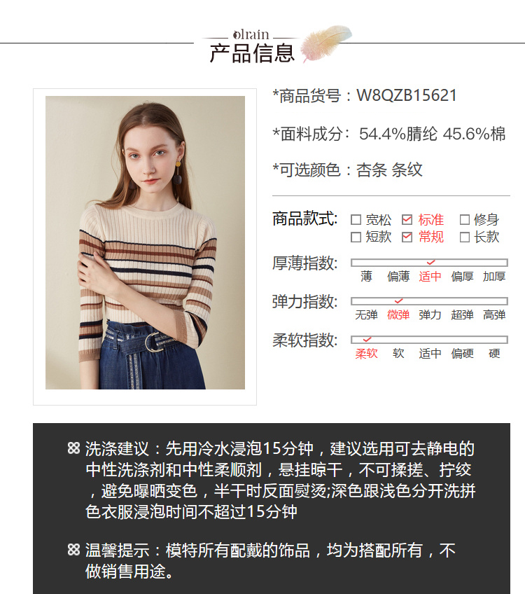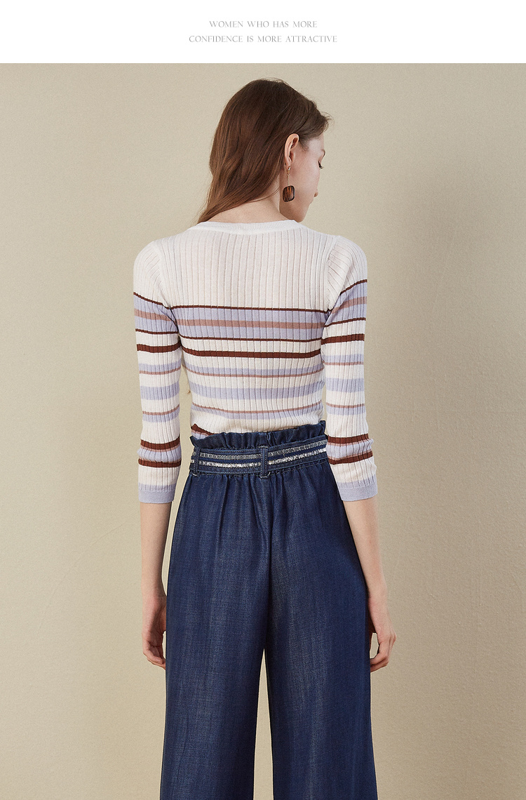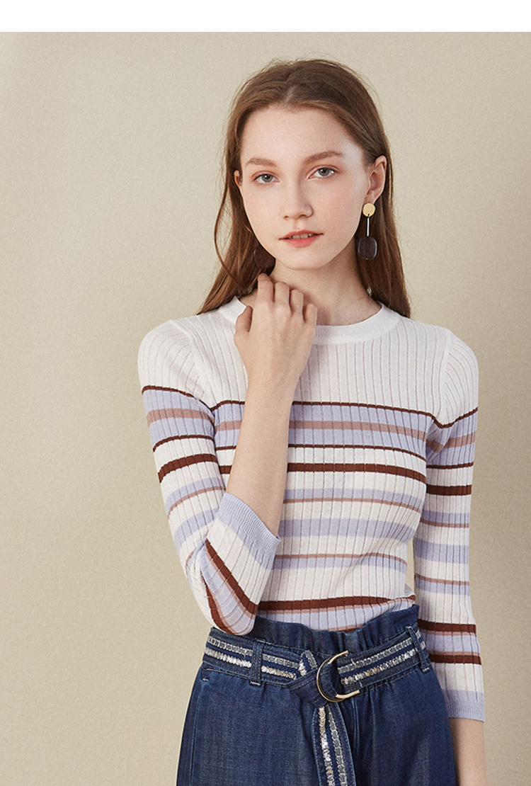 欧芮儿2018早秋新款条纹针织衫薄上衣韩版七分袖套头圆领毛衣