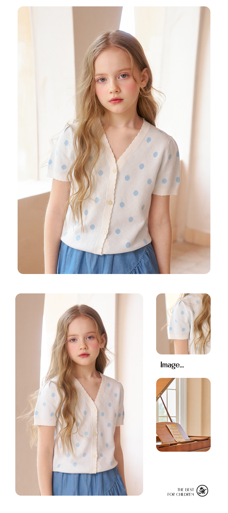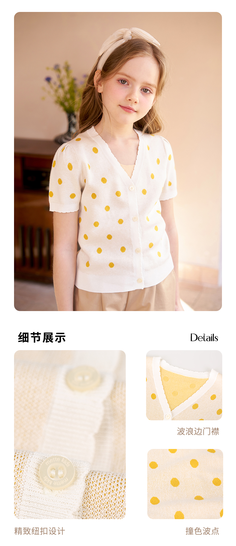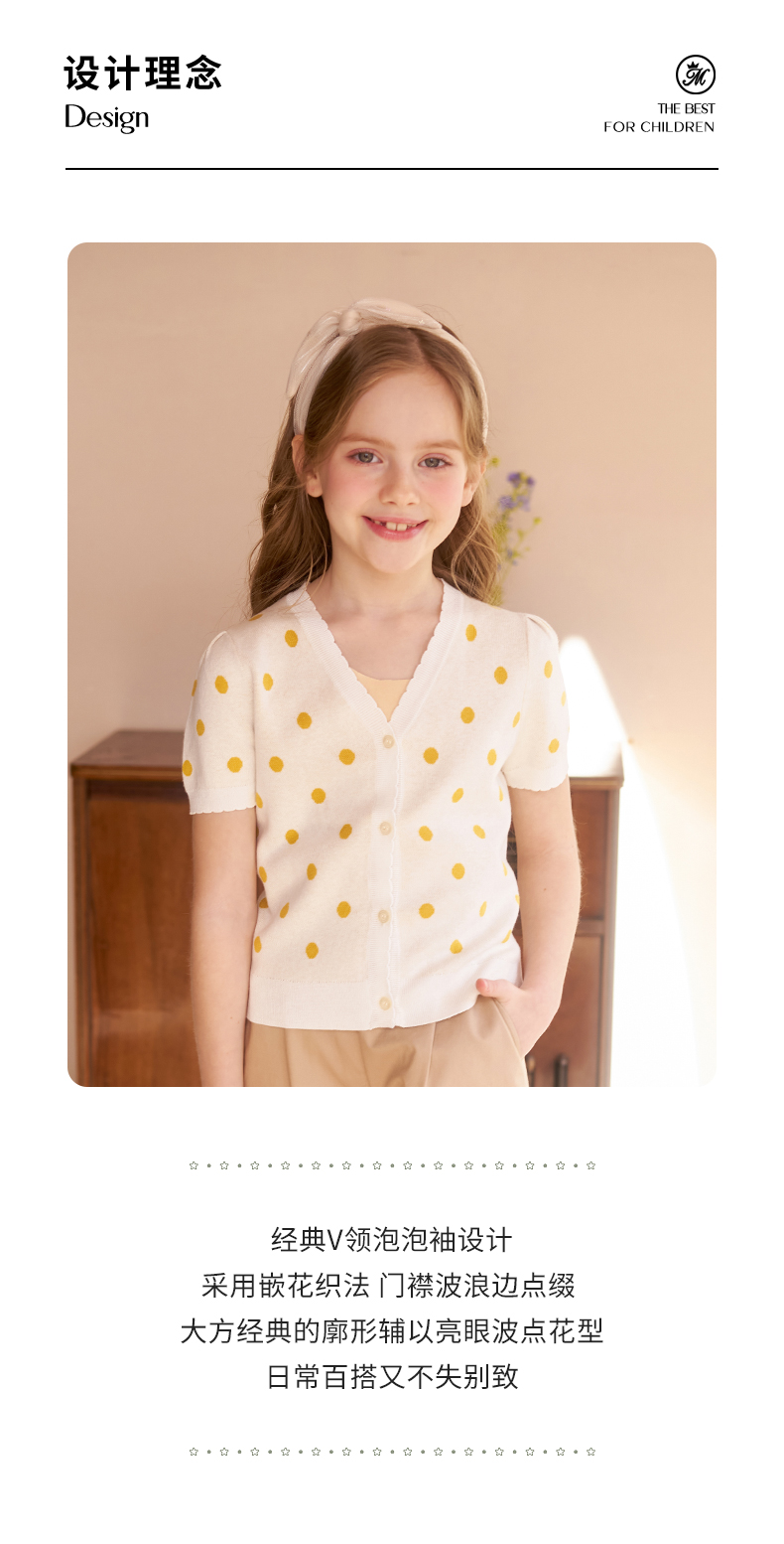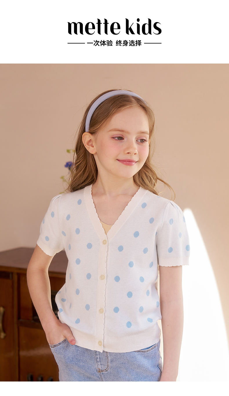 mettekids女童短袖t恤儿童新款圆点针织衫童装中大童V领洋气上衣
