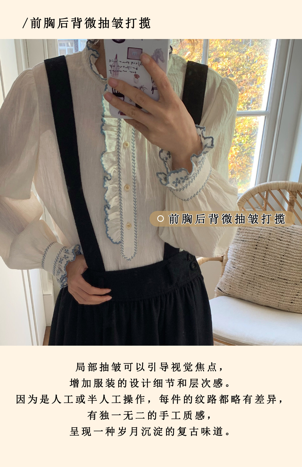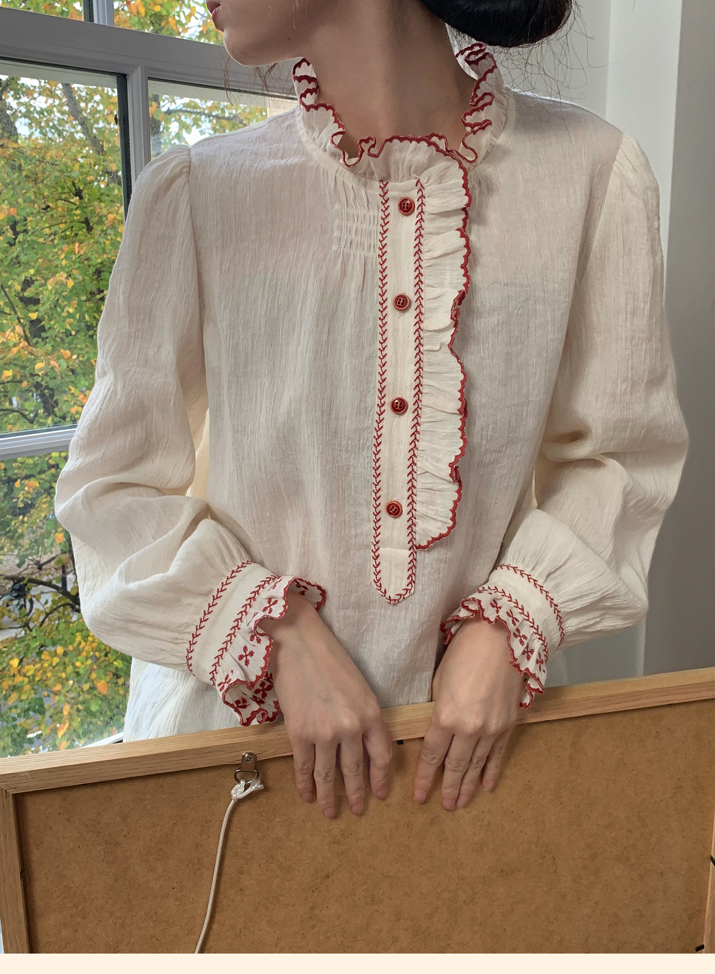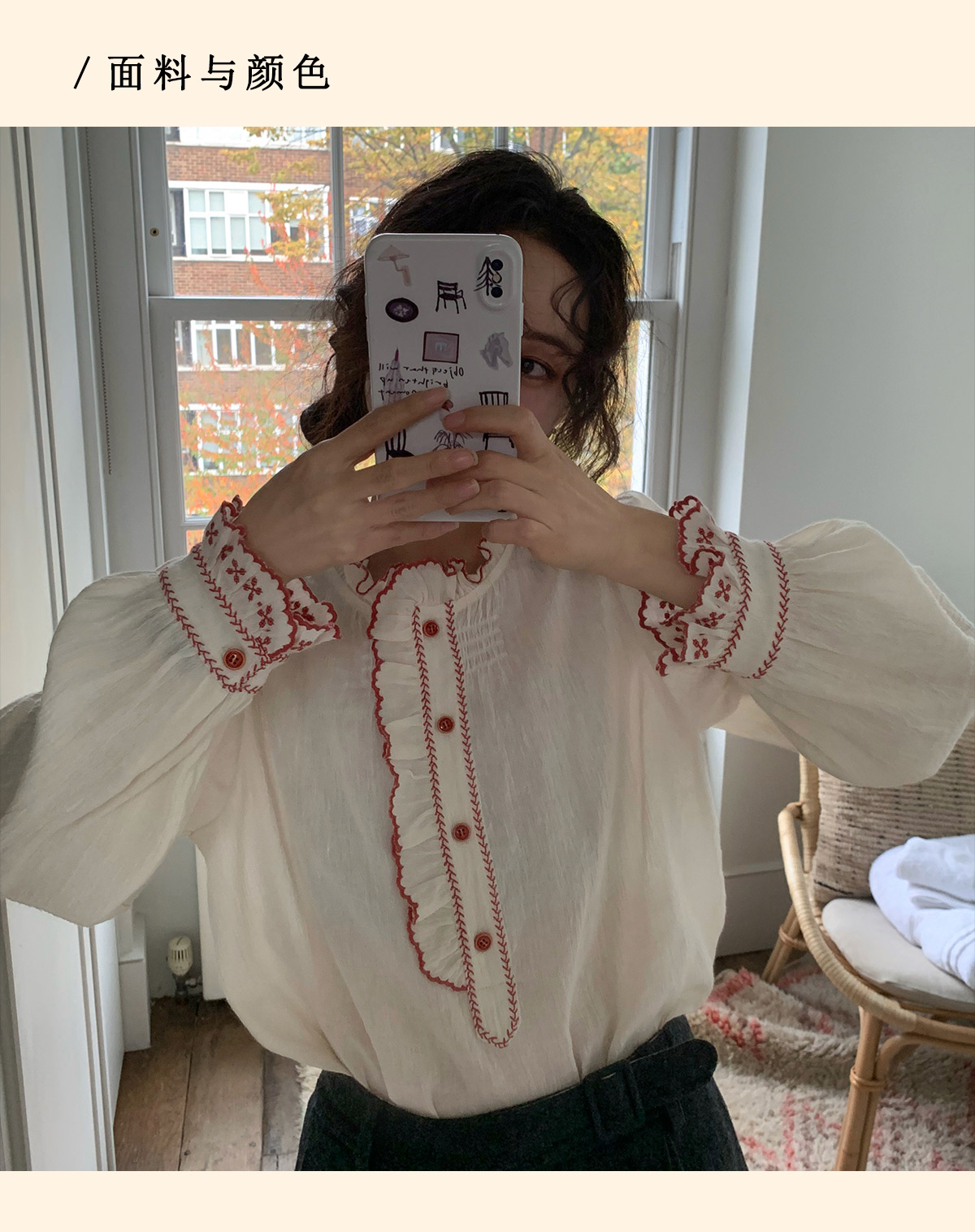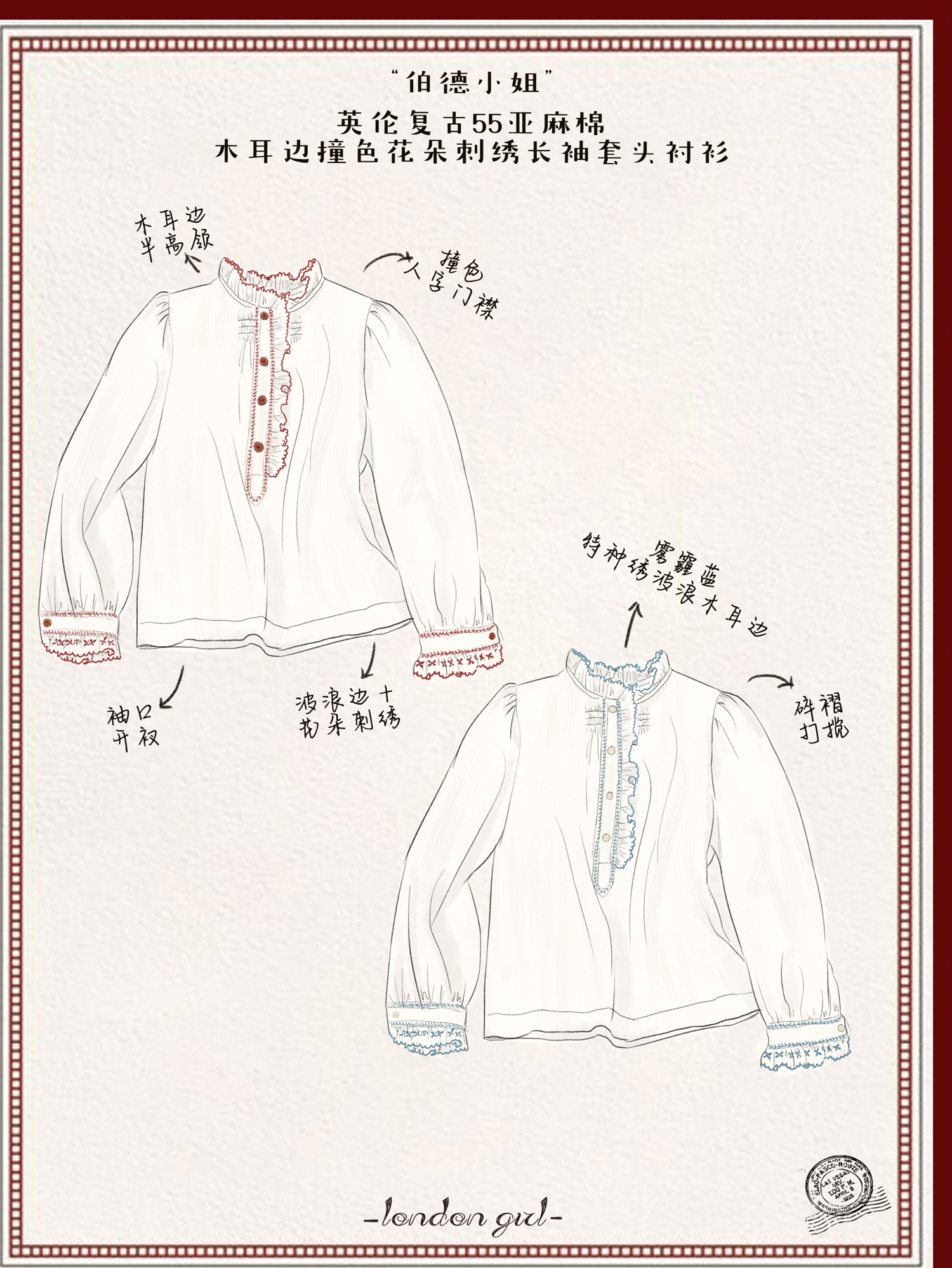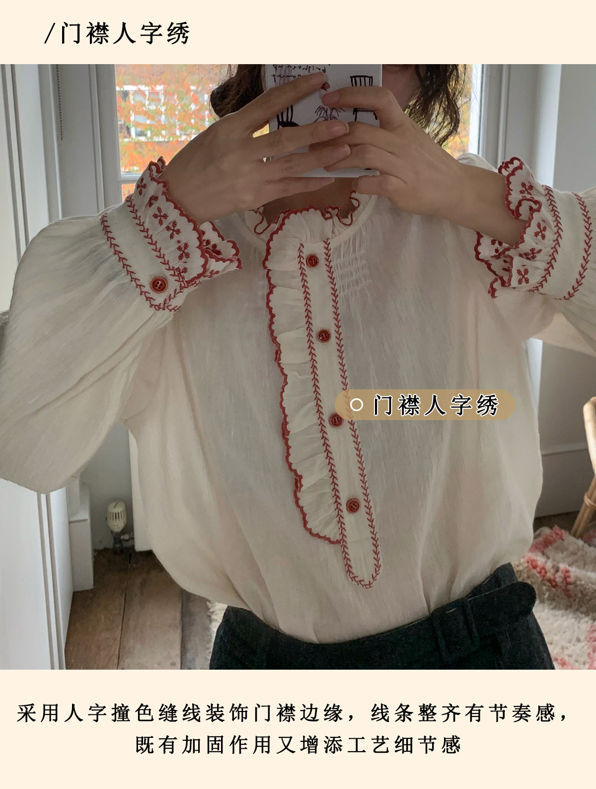 浮生八记/25C195/亚麻棉木耳边撞色花朵刺绣衬衫