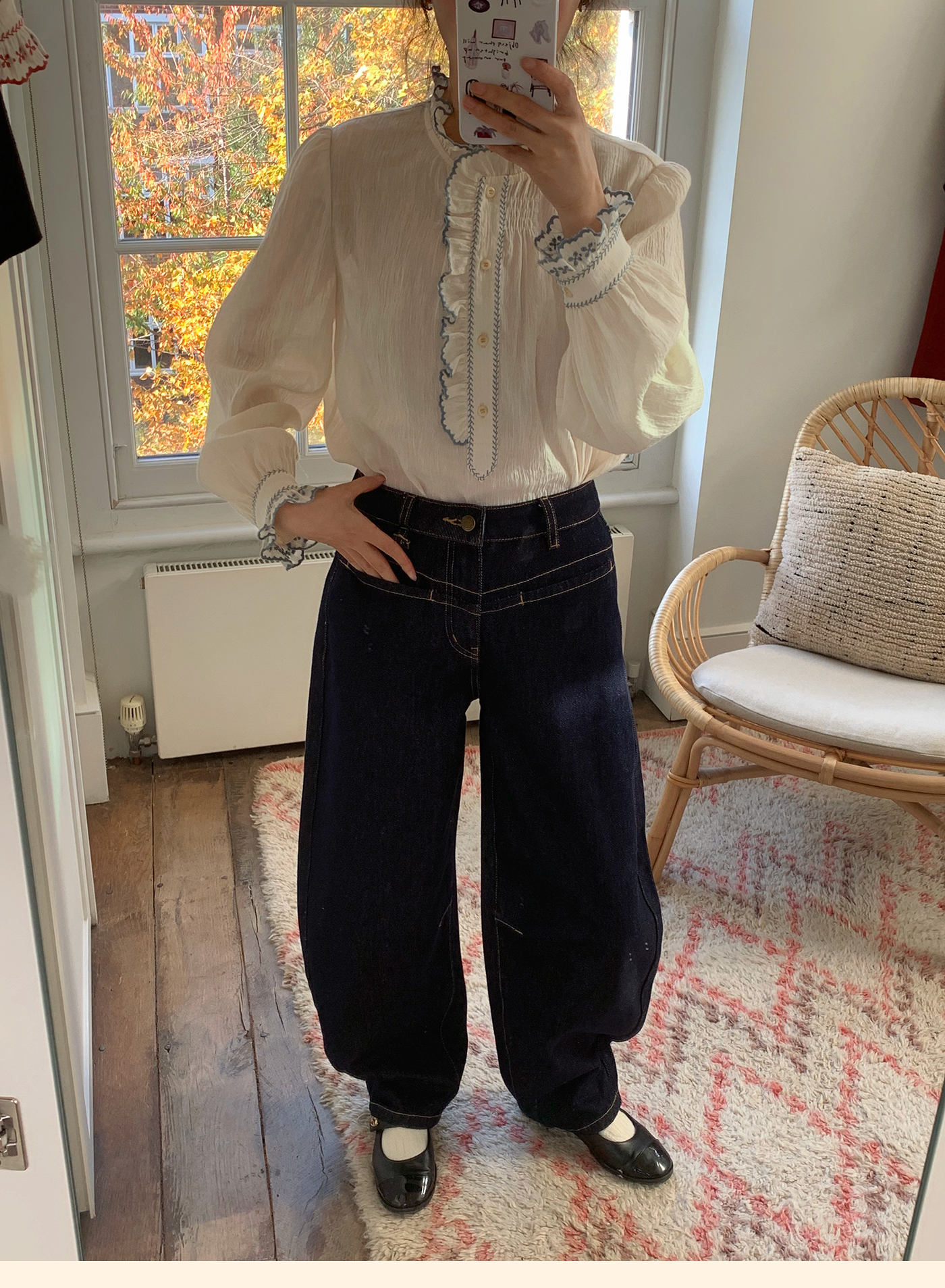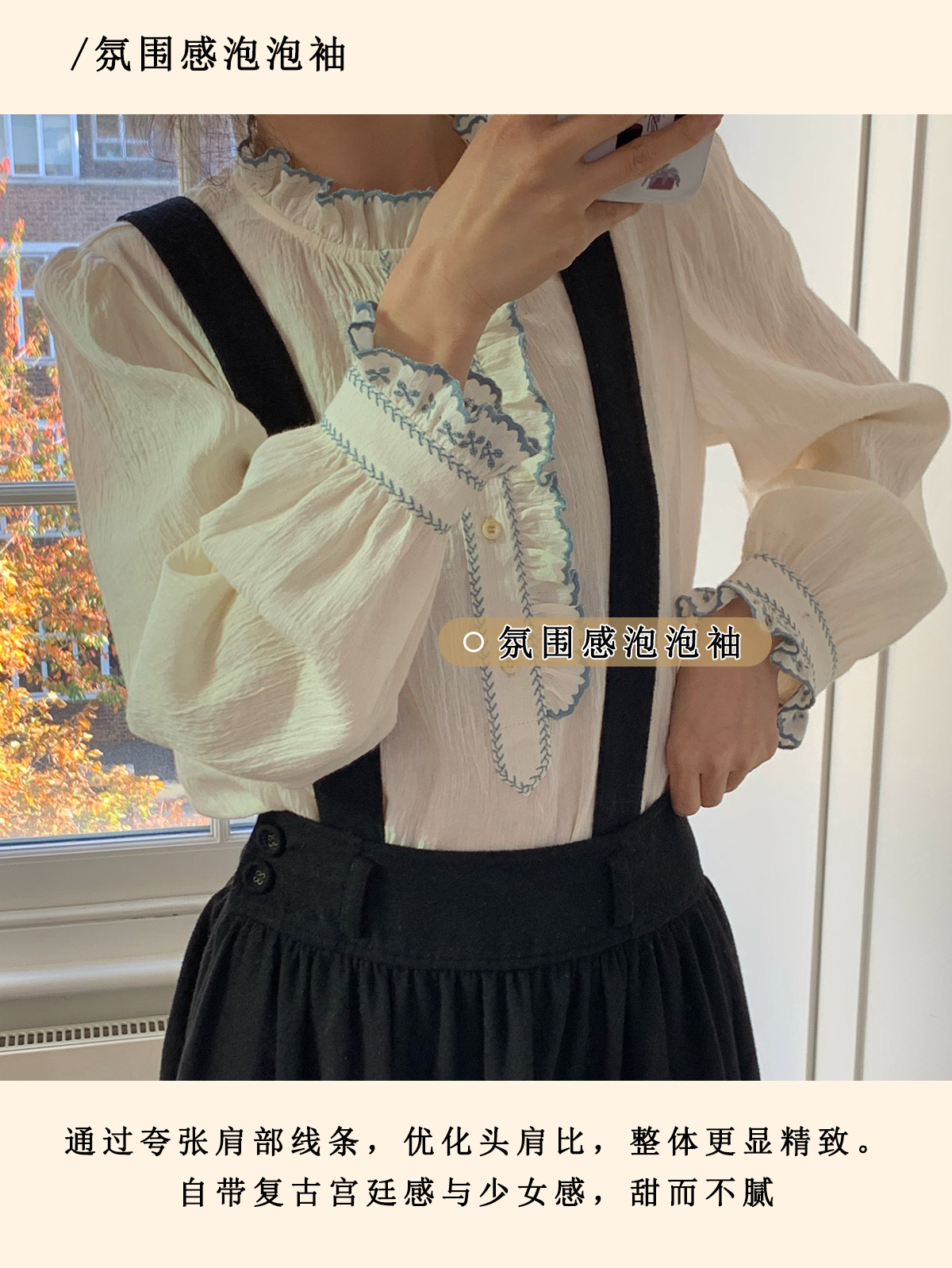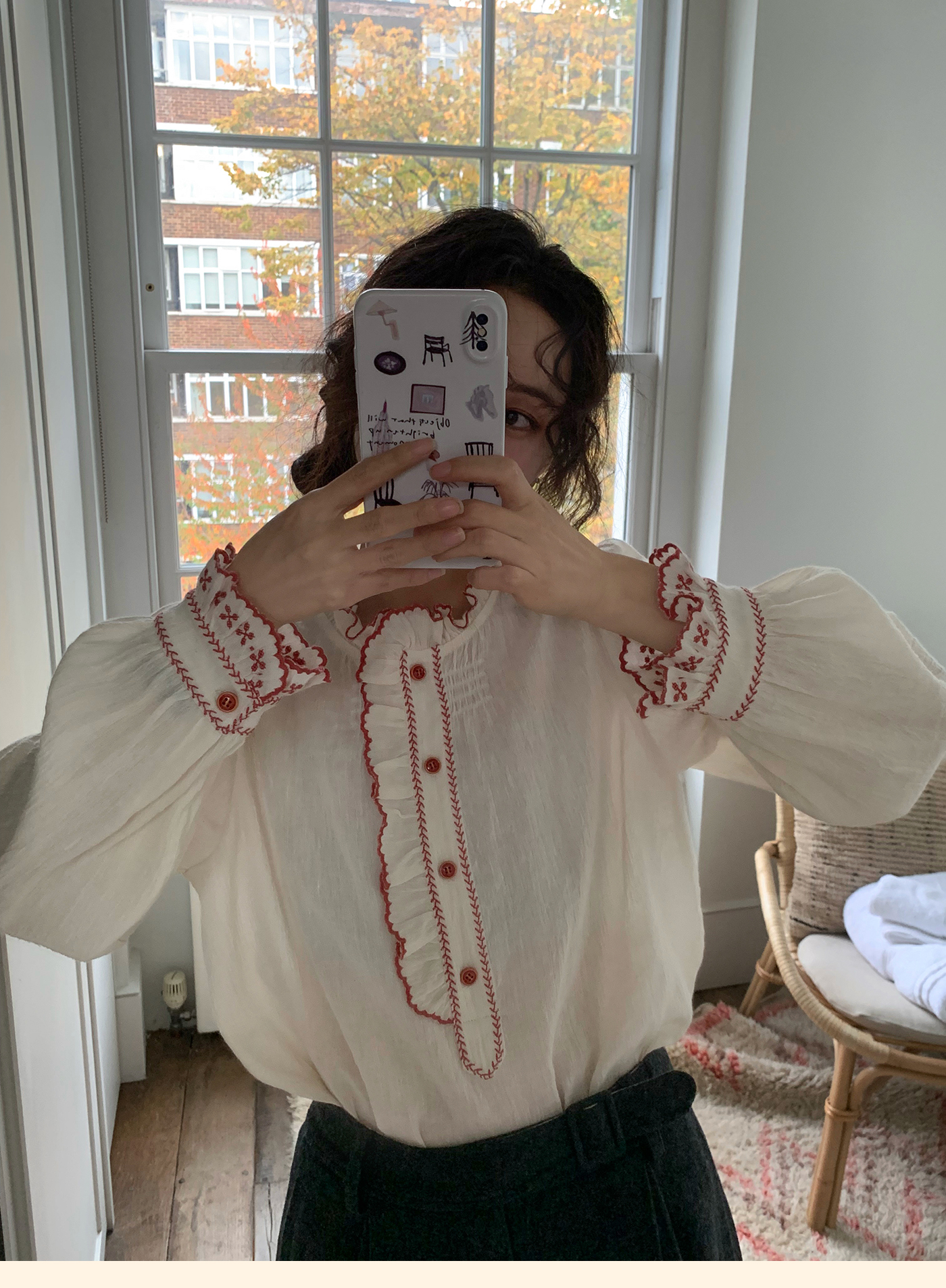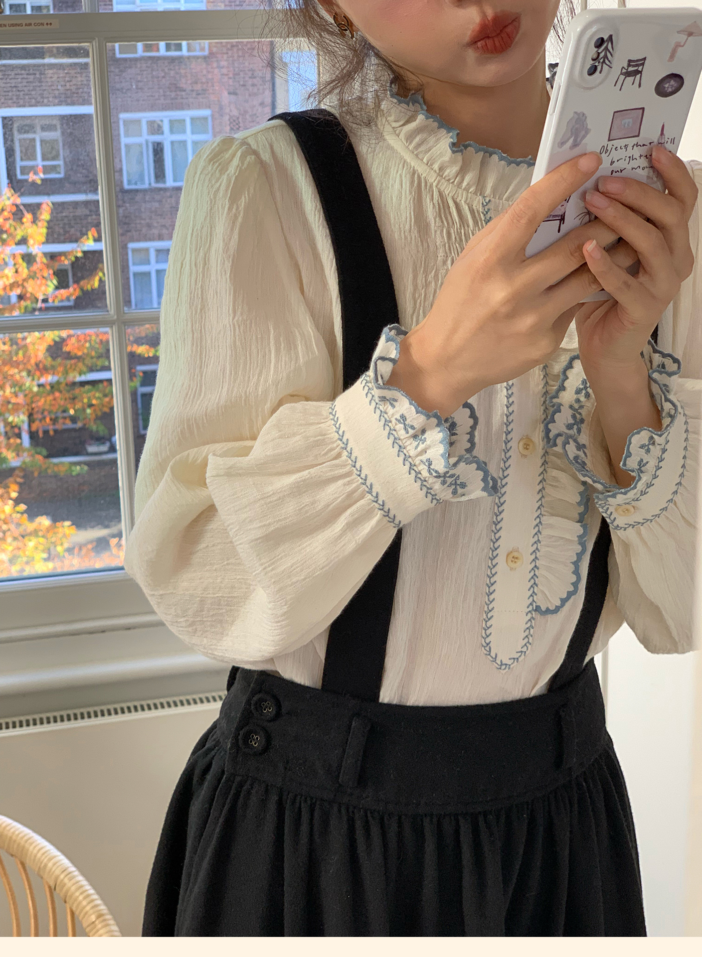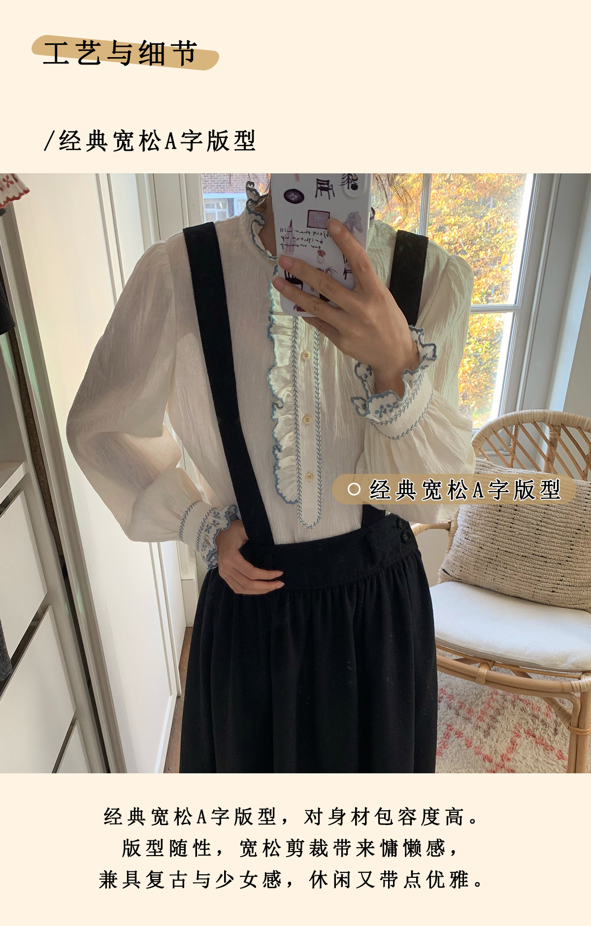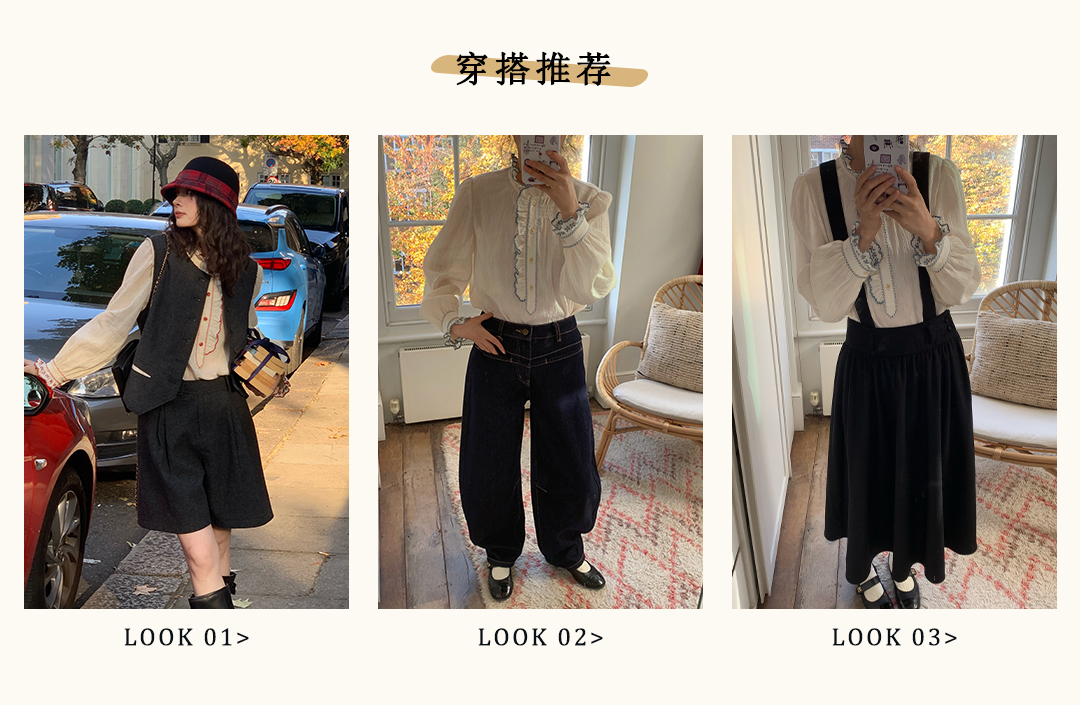 浮生八记/25C195/亚麻棉木耳边撞色花朵刺绣衬衫