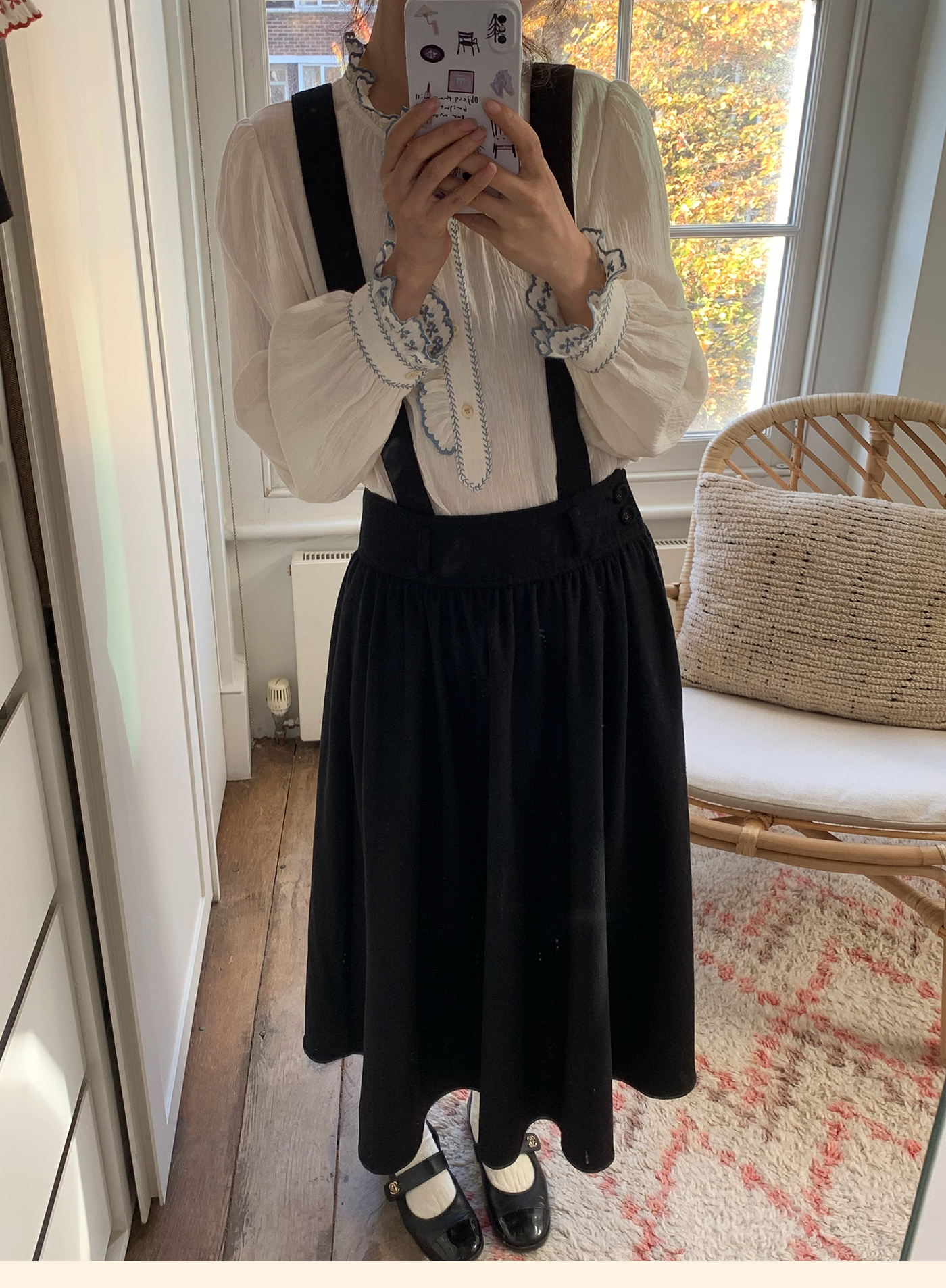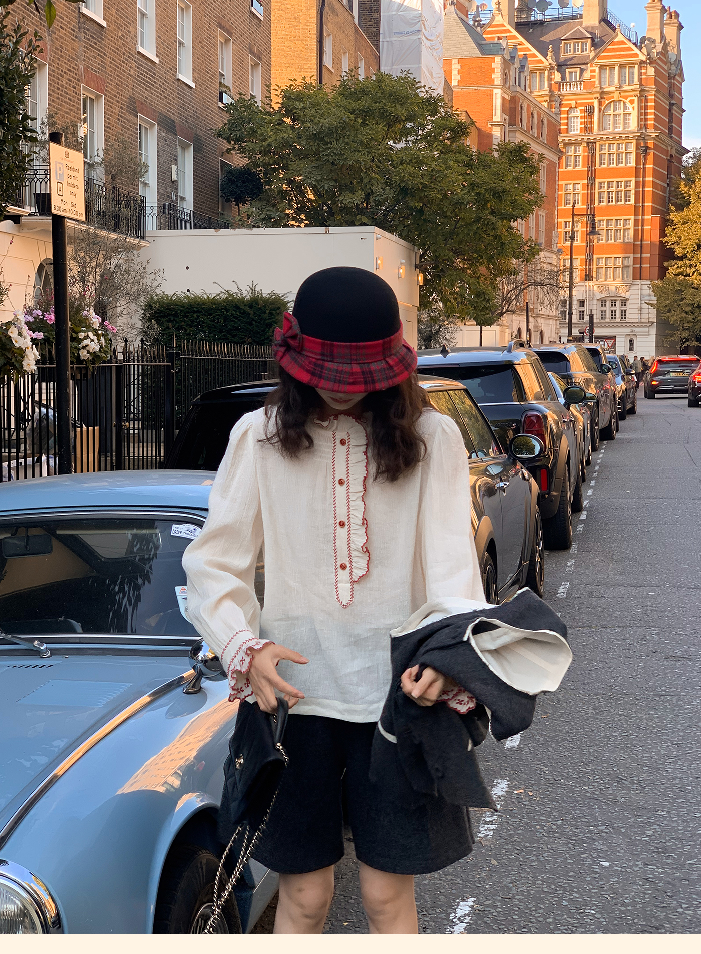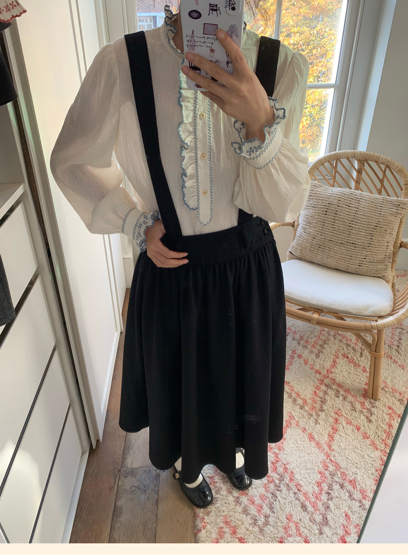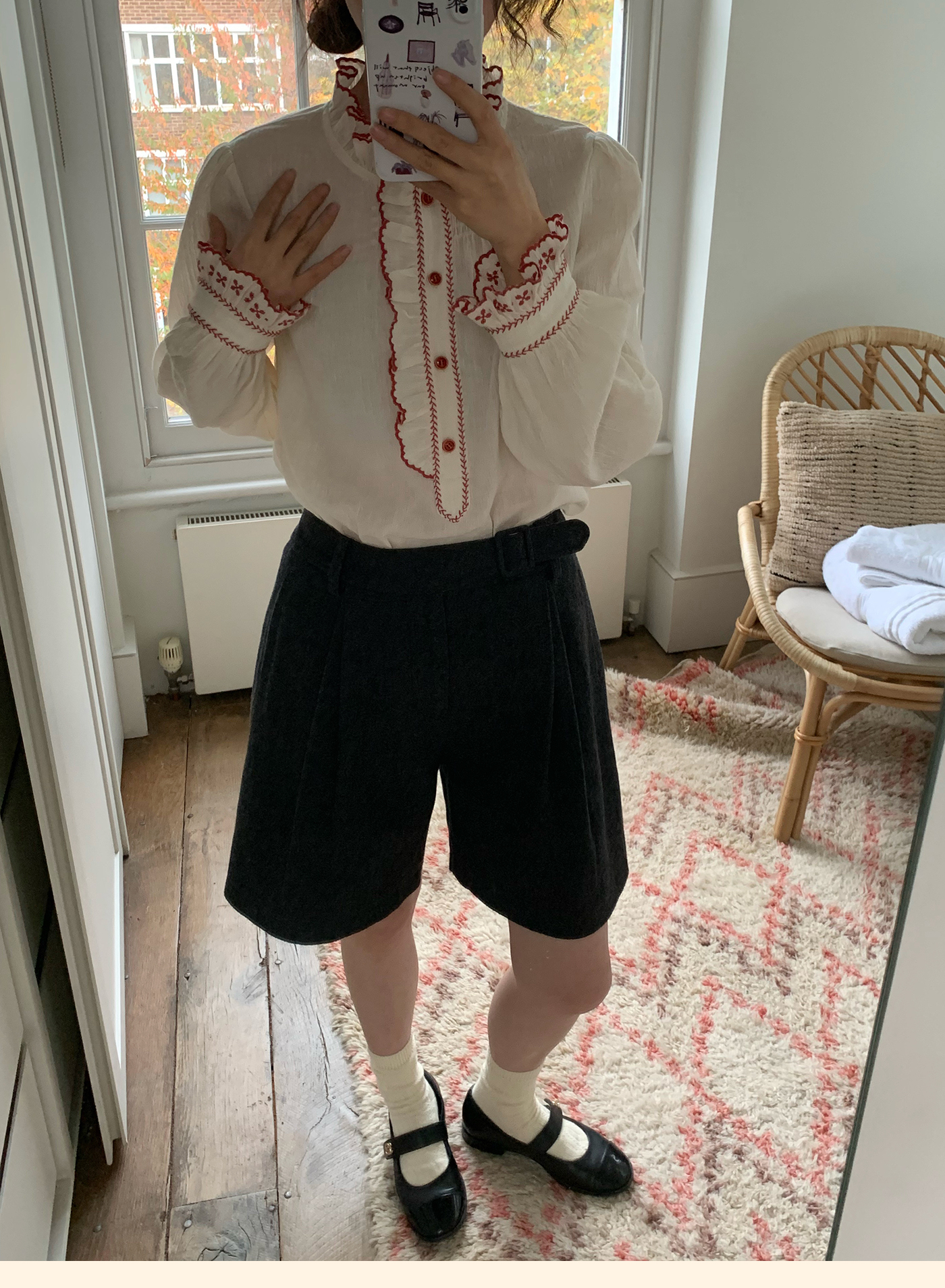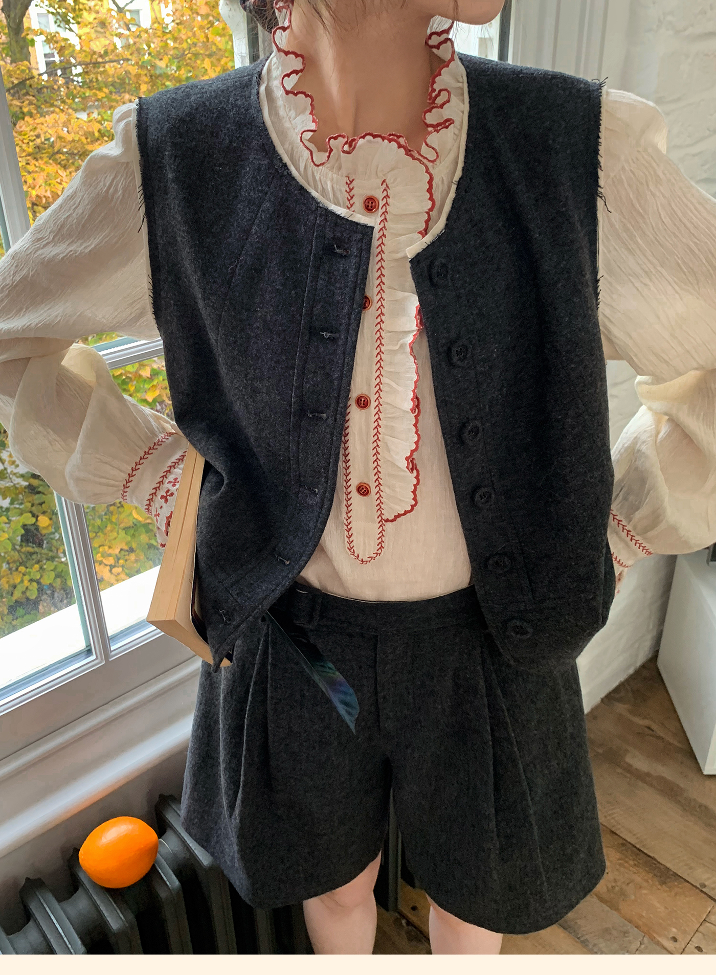 浮生八记/25C195/亚麻棉木耳边撞色花朵刺绣衬衫