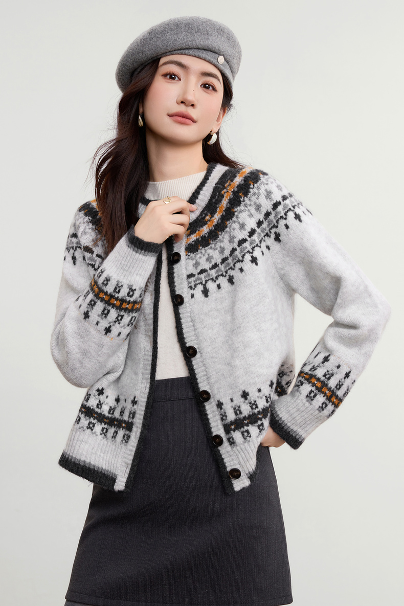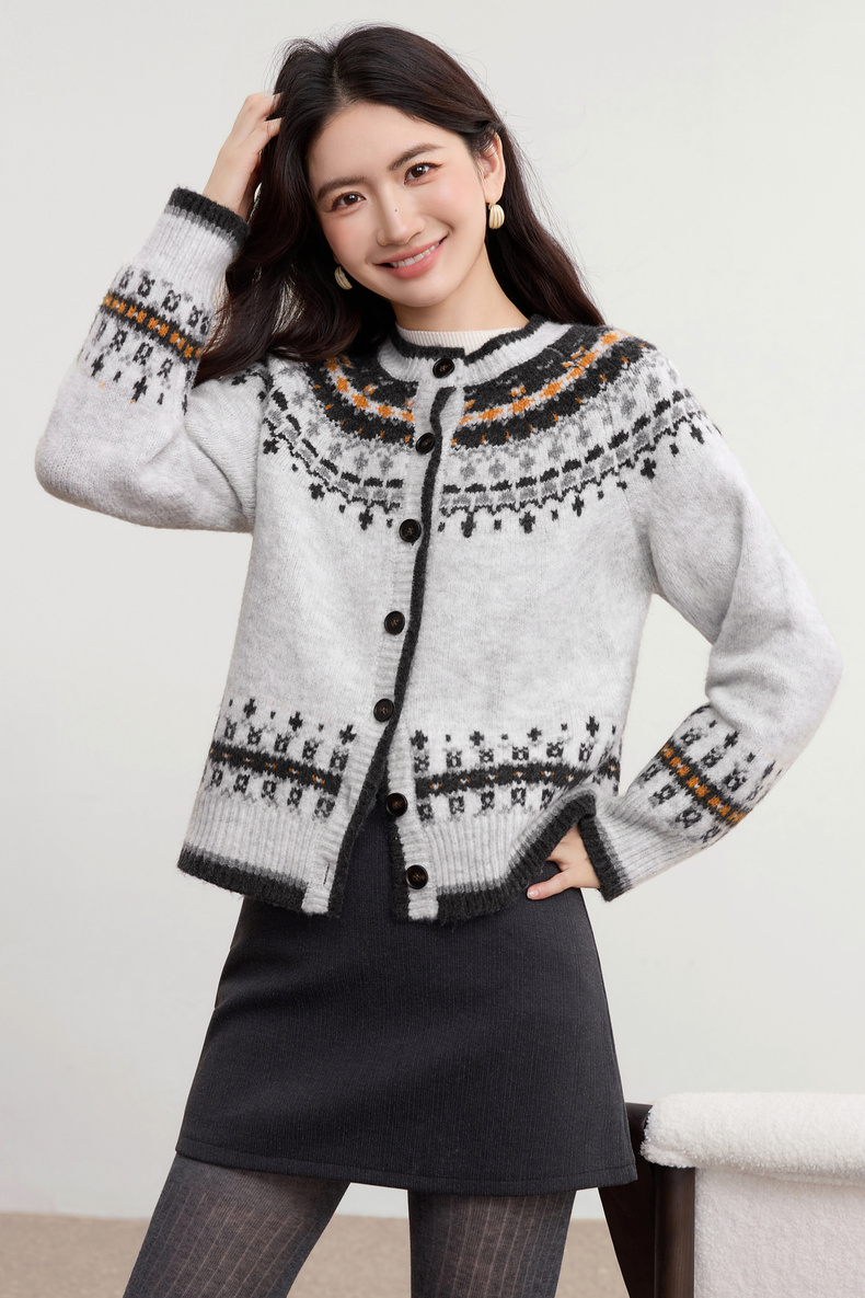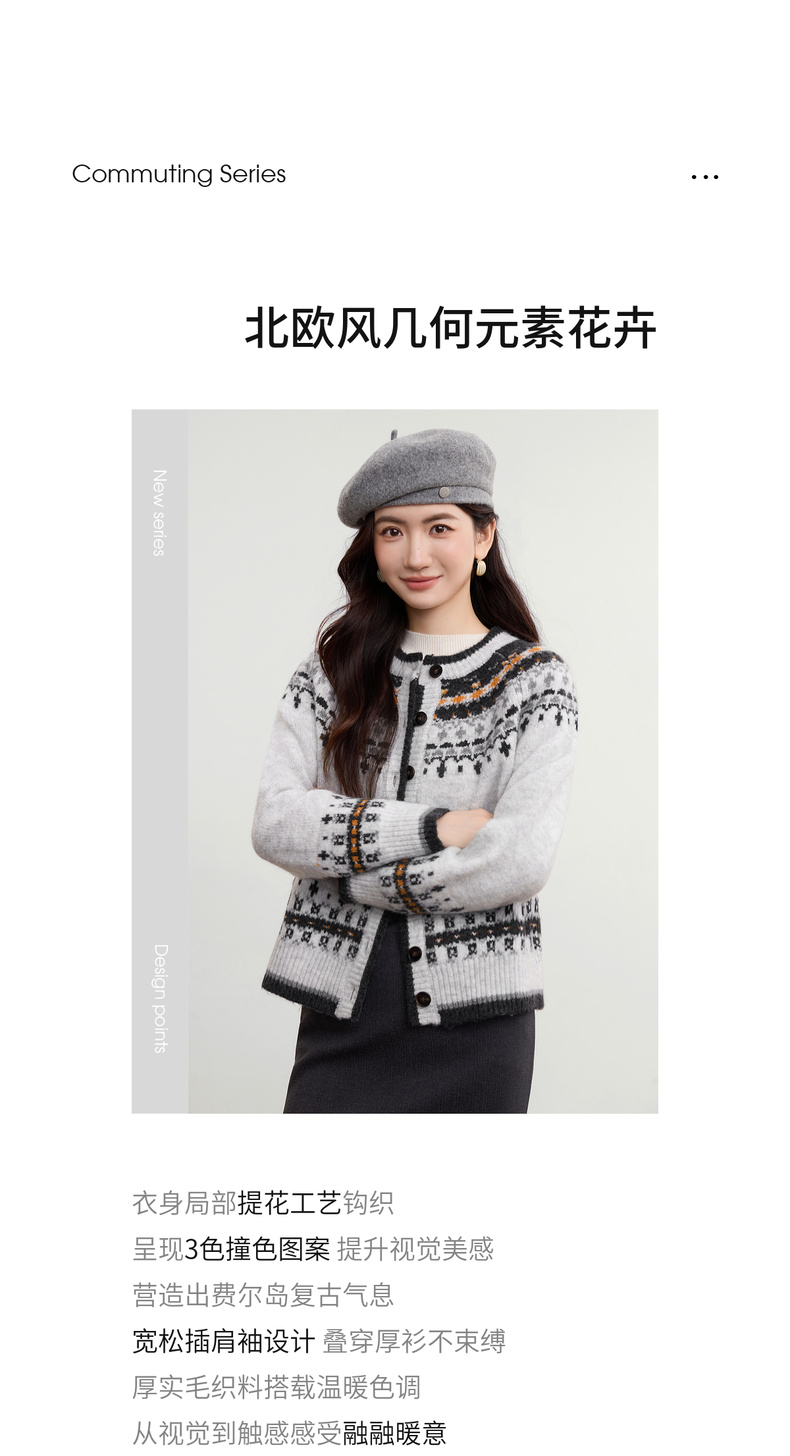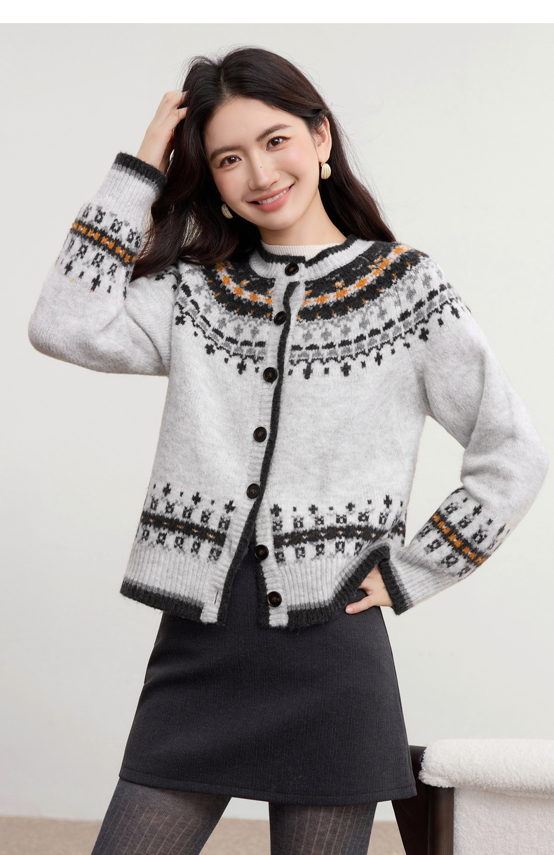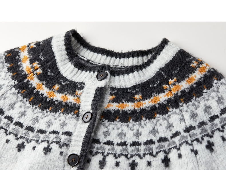 【内购】【费尔岛提花图案】复古圆领单排扣插肩袖软糯弹力厚保暖开衫毛衣-W54EB3140