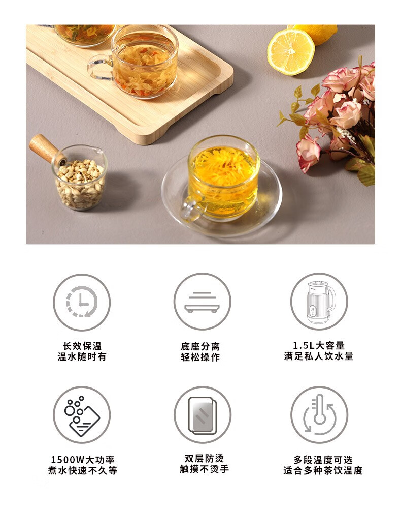 大宇(DAEWOO)电热水壶家用1.5L容量可视温度多段控温烧水壶 DYSH-15F26 1.5L