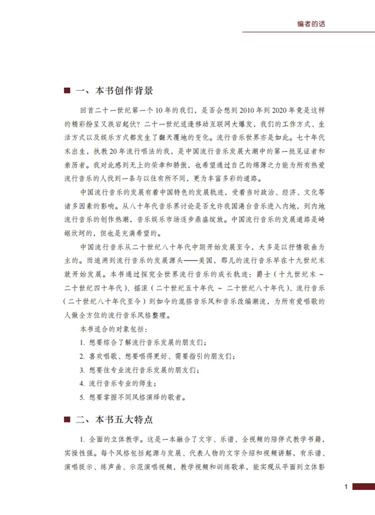 我们不打造千篇一律的声音,相信每一个人都有不同风格。这套教程是一本流行演唱入门实用的工具书,适合专业院校的音乐表演专业的学生们,也同样适合社会大众歌唱爱好者们。老师可带领学生们演绎和驾驭各风格歌曲,让所有爱唱歌的朋友轻松掌握每一种音乐风格并跟着视频模仿演唱。"