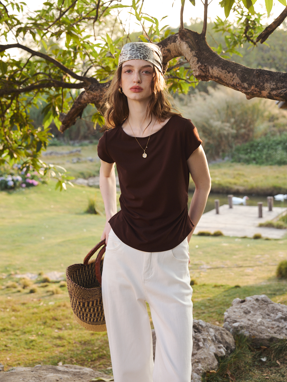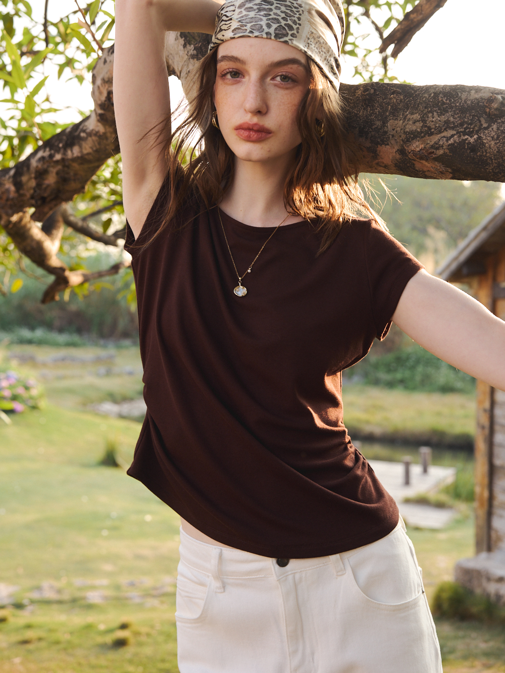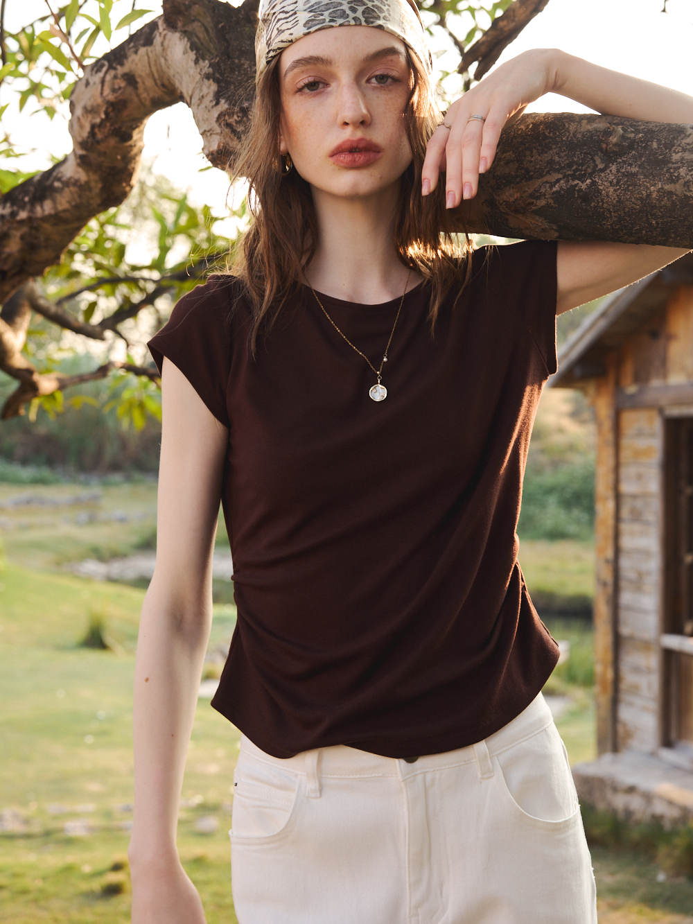 OLrain欧芮儿2026夏季咖色T恤修身收腰显瘦上衣