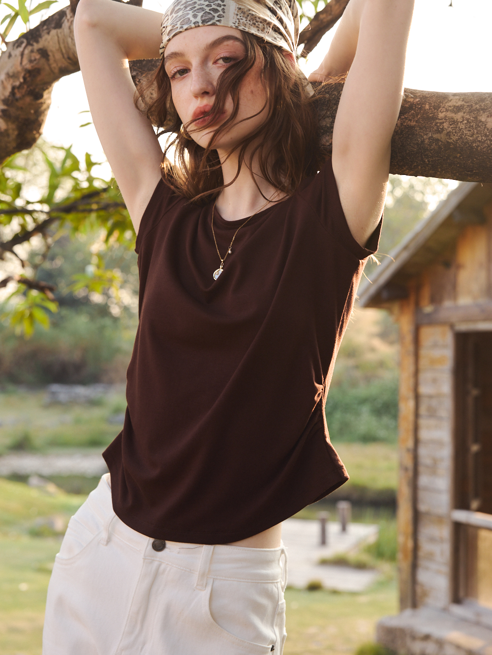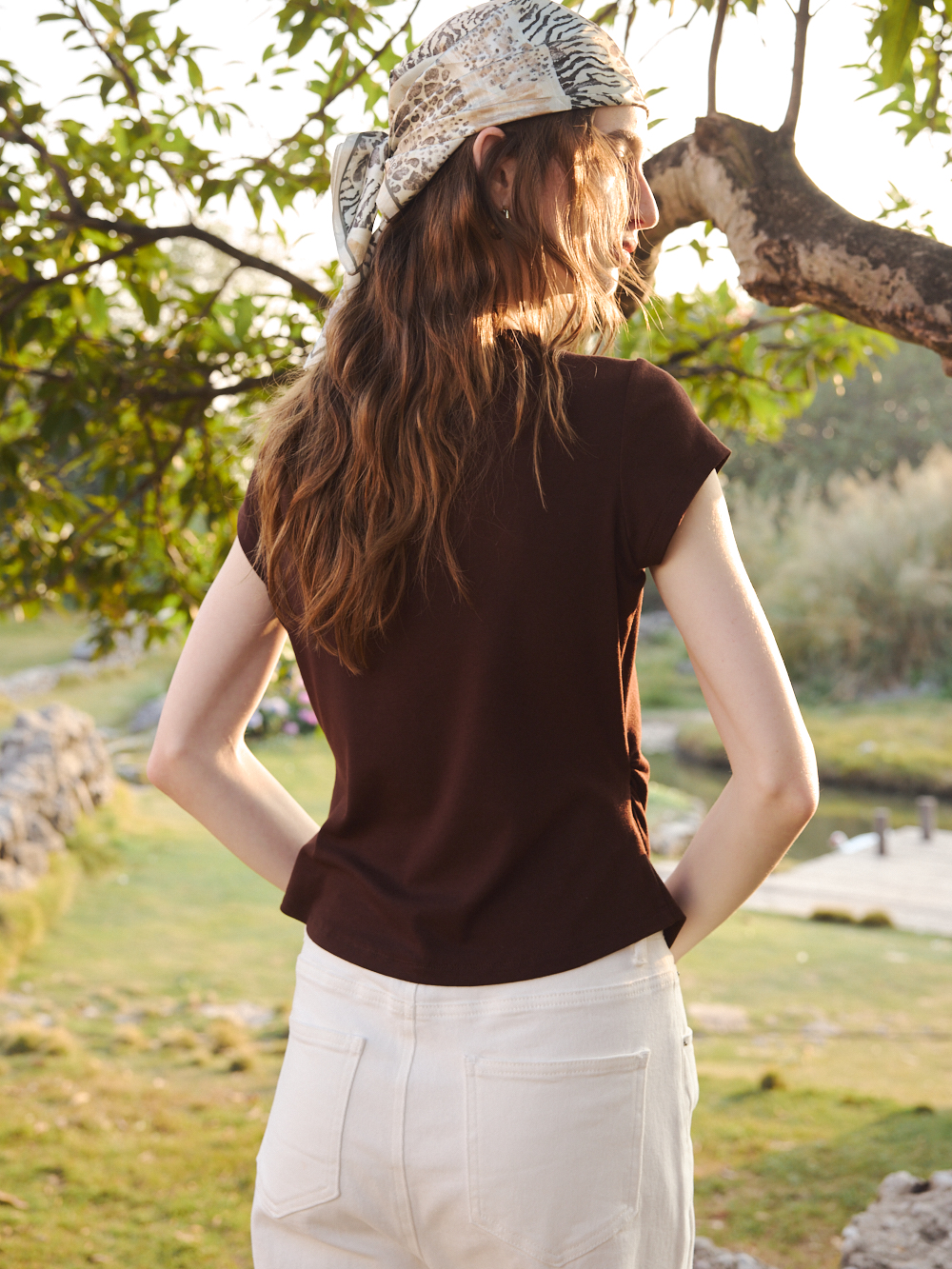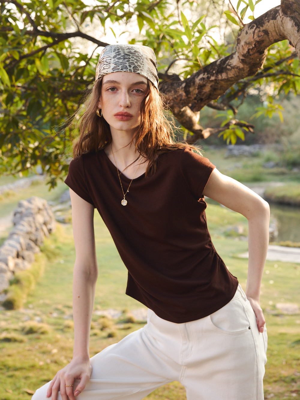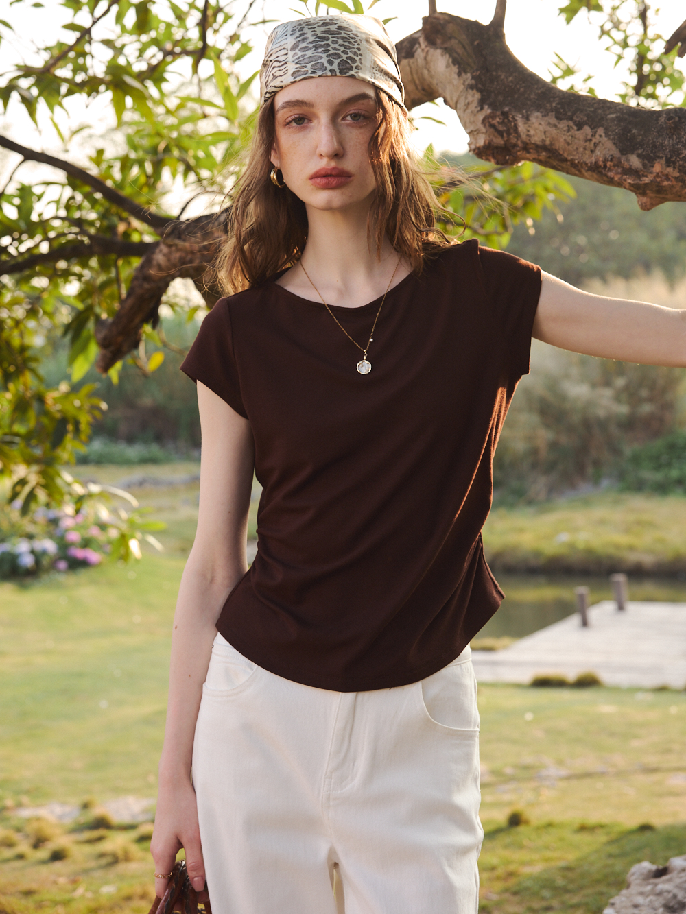 OLrain欧芮儿2026夏季咖色T恤修身收腰显瘦上衣
