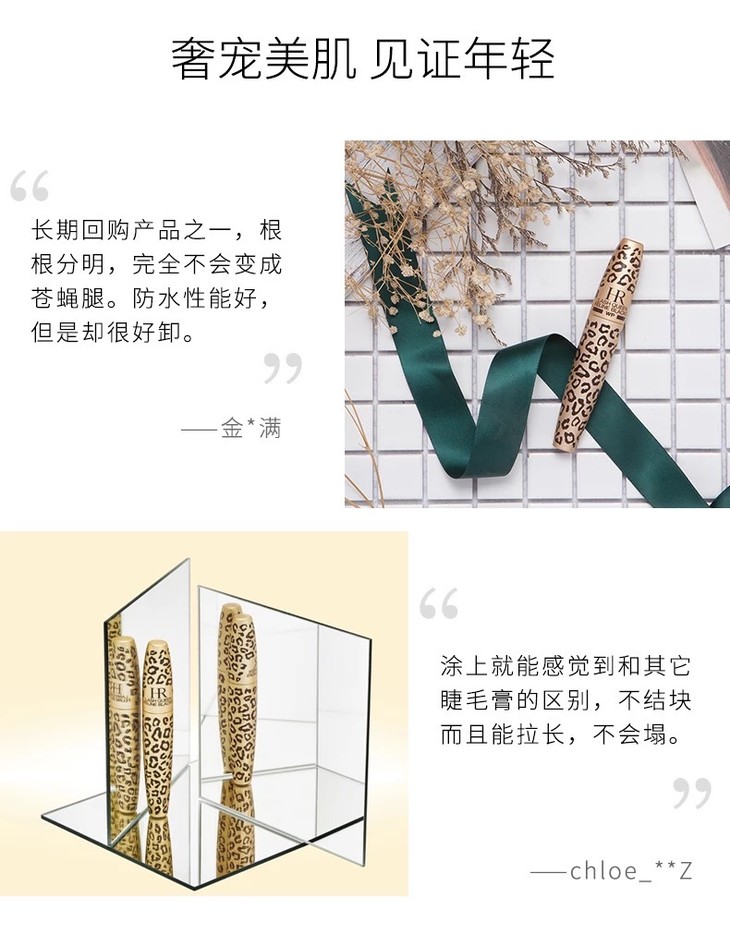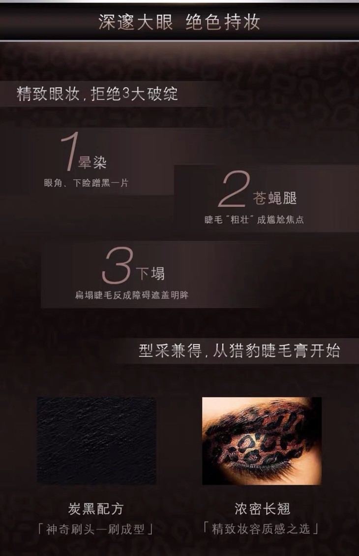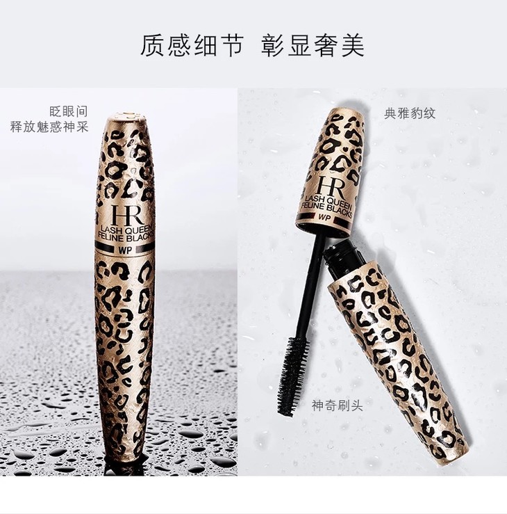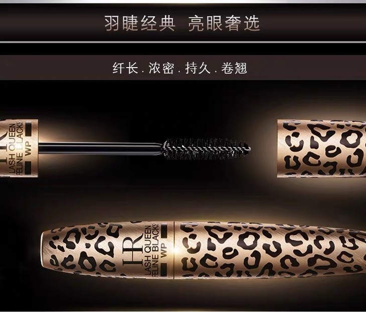 3、功效:猎豹睫毛膏(防水型)经典款HR赫莲娜猎豹防水睫毛膏,灵感来源于极具异国情调皮革,打造奢华魅力的永恒典范!创新超炫碳黑配方,配合神奇刷头,顷刻间诠释深邃浓密!