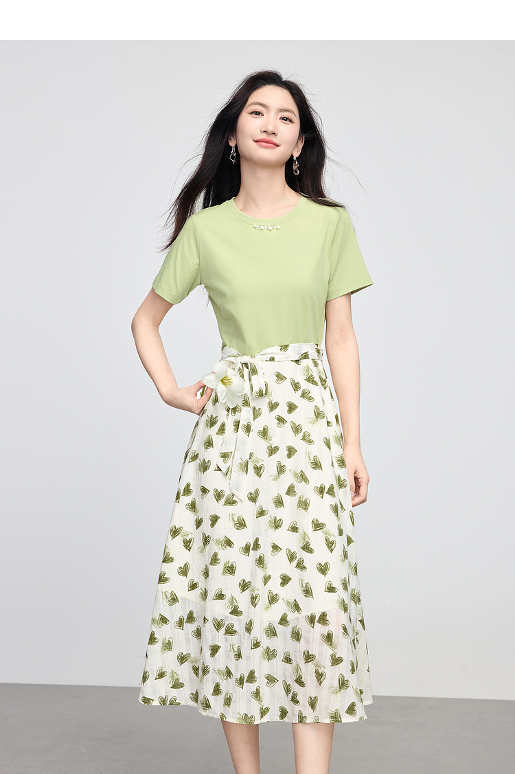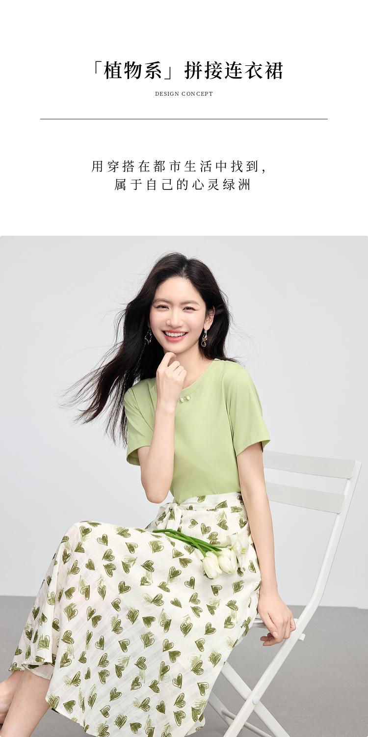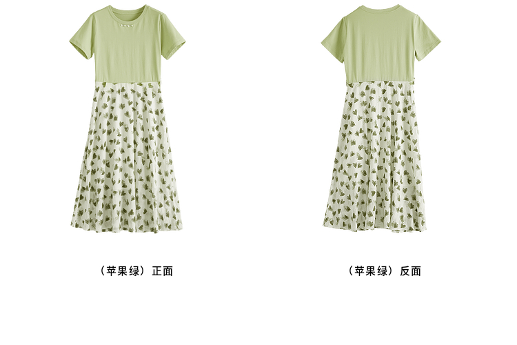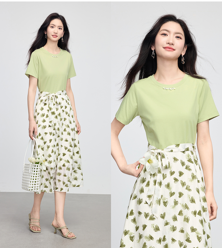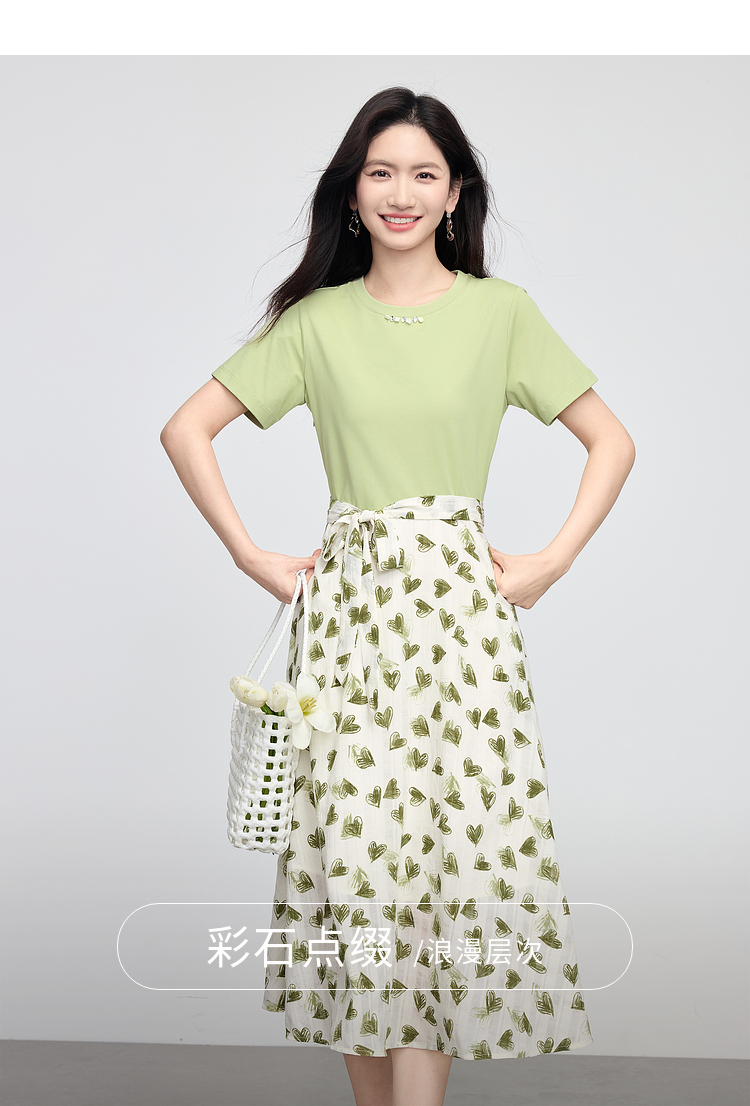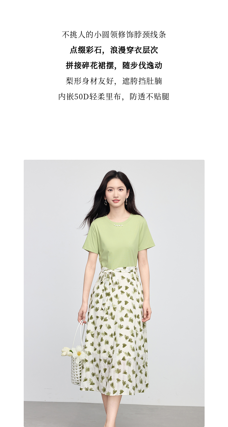 熙世界短袖T恤拼接碎花连衣裙女假两件收腰显瘦裙子2025夏季新款