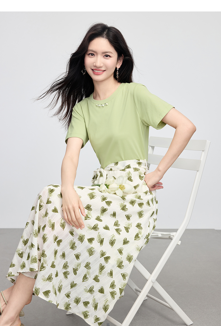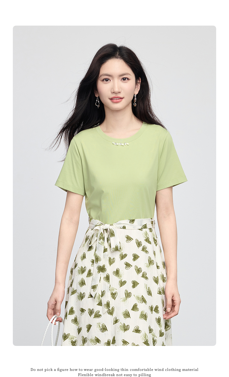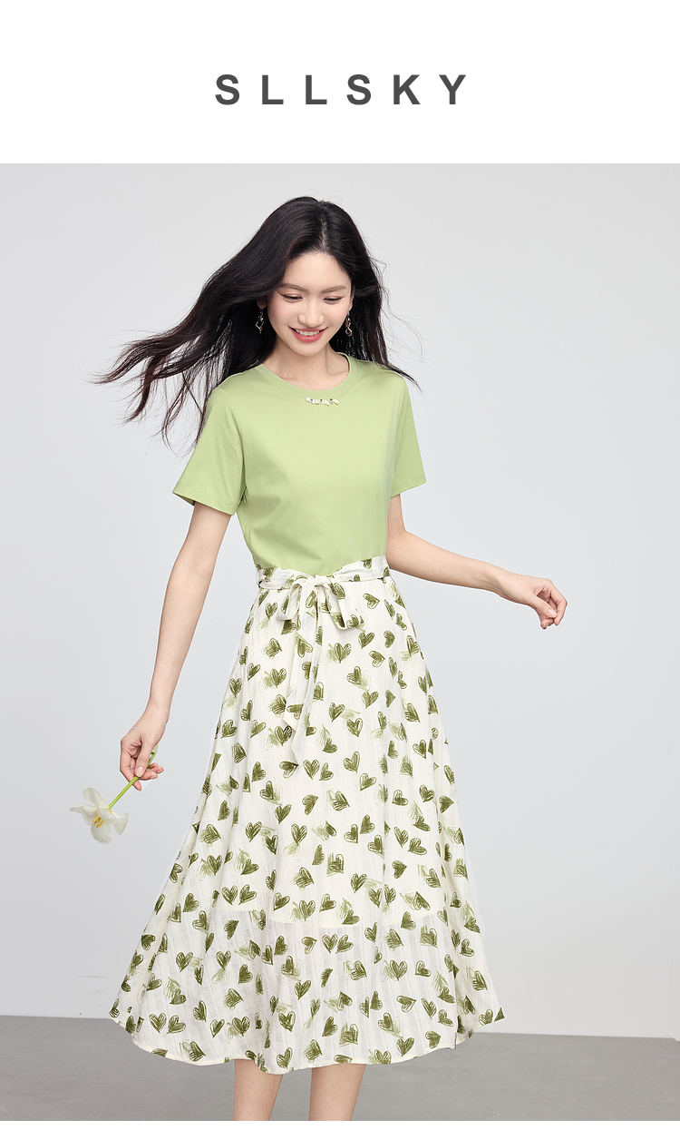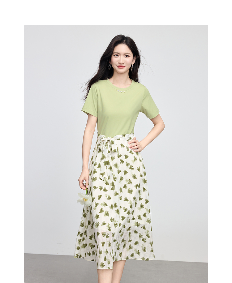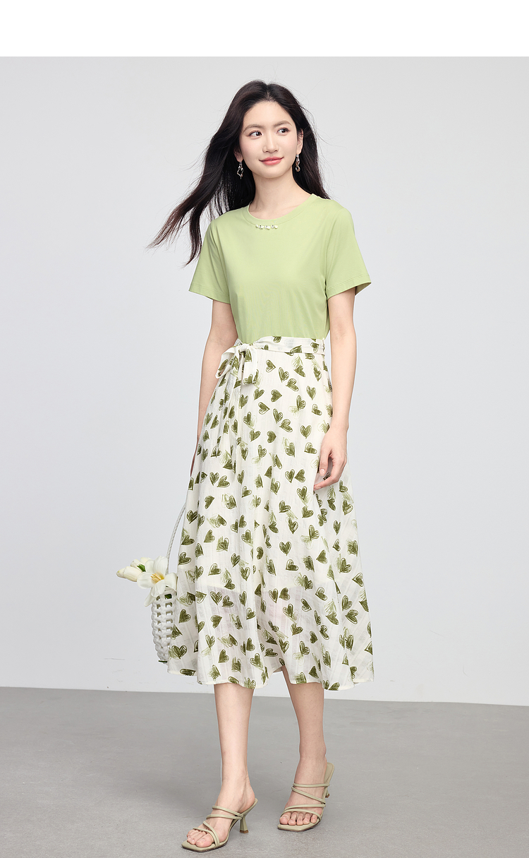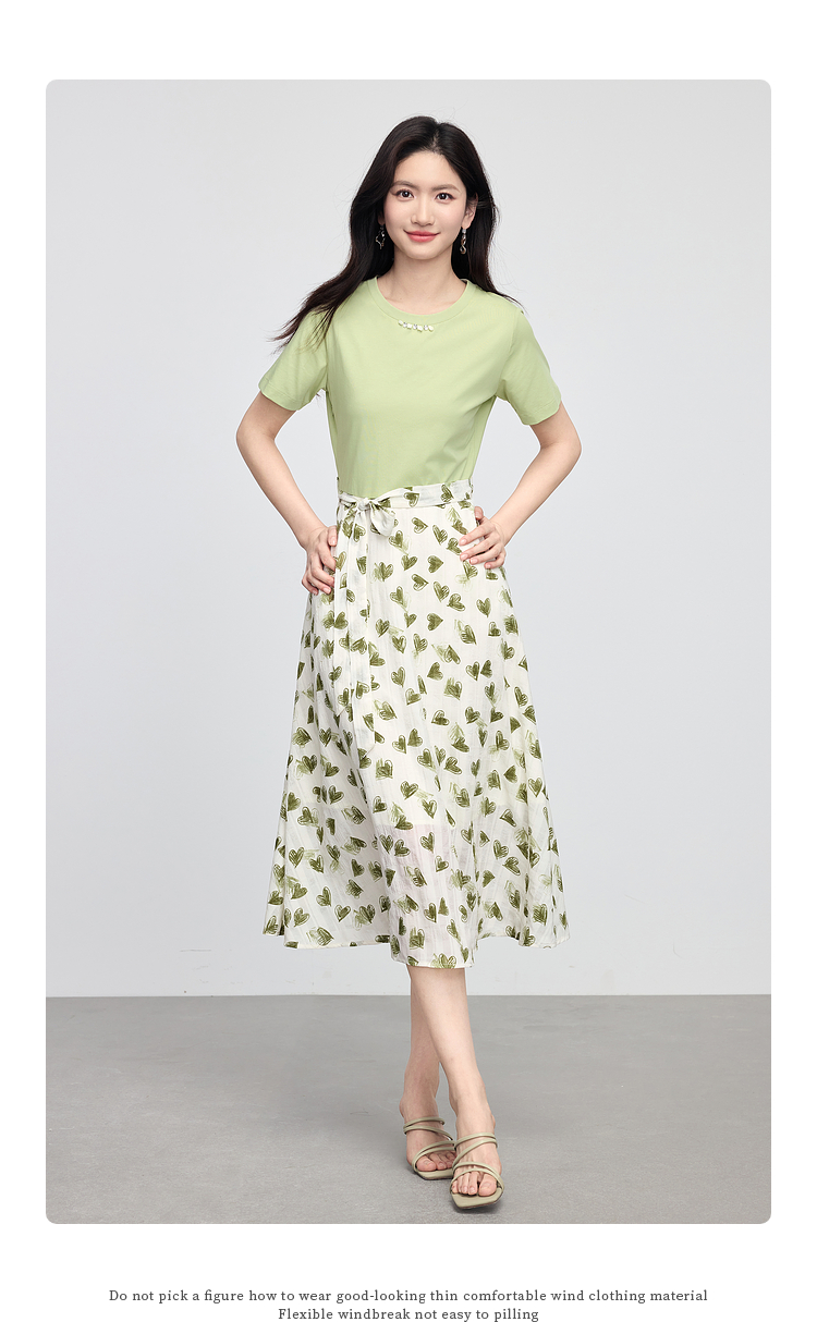 熙世界短袖T恤拼接碎花连衣裙女假两件收腰显瘦裙子2025夏季新款
