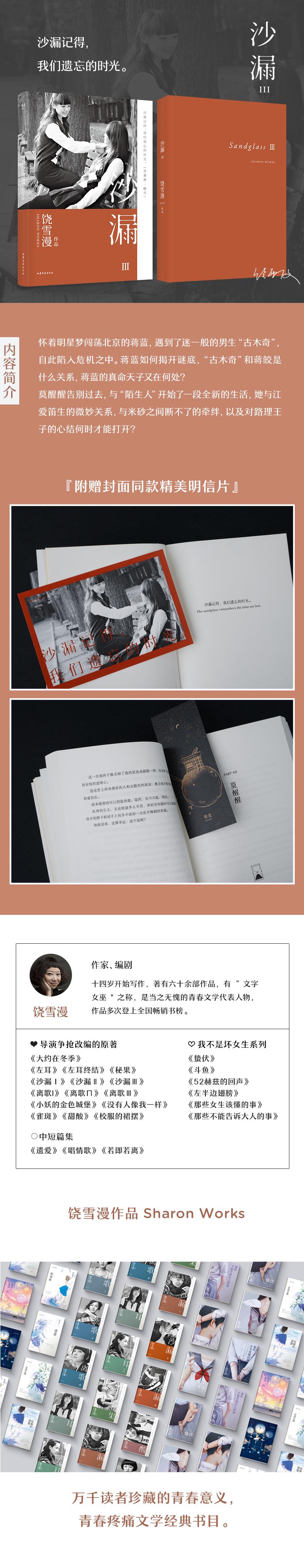 饶雪漫是青春文学的代表作家之一,近十年来的作品都是口口相传的佳作。“青春疼痛”更是她的代表作系列,在读者中拥有好口碑,也成为近年来影视剧的热门IP。其中《左耳》更是收获5亿票房并入围金马奖。《沙漏》是比《左耳》更加美好的故事,因为这两个女孩子的友情里有种一往无前的自我牺牲,恨不得燃烧自己给对方取暖。《沙漏》三部曲写尽了女孩成长过程中的疼痛与美好,每一个女孩都能从中寻找到自已的欢笑和泪水、美丽与哀愁。 出版至今销量已达百万,是万千读者珍藏的青春记忆。 2019年修订版。