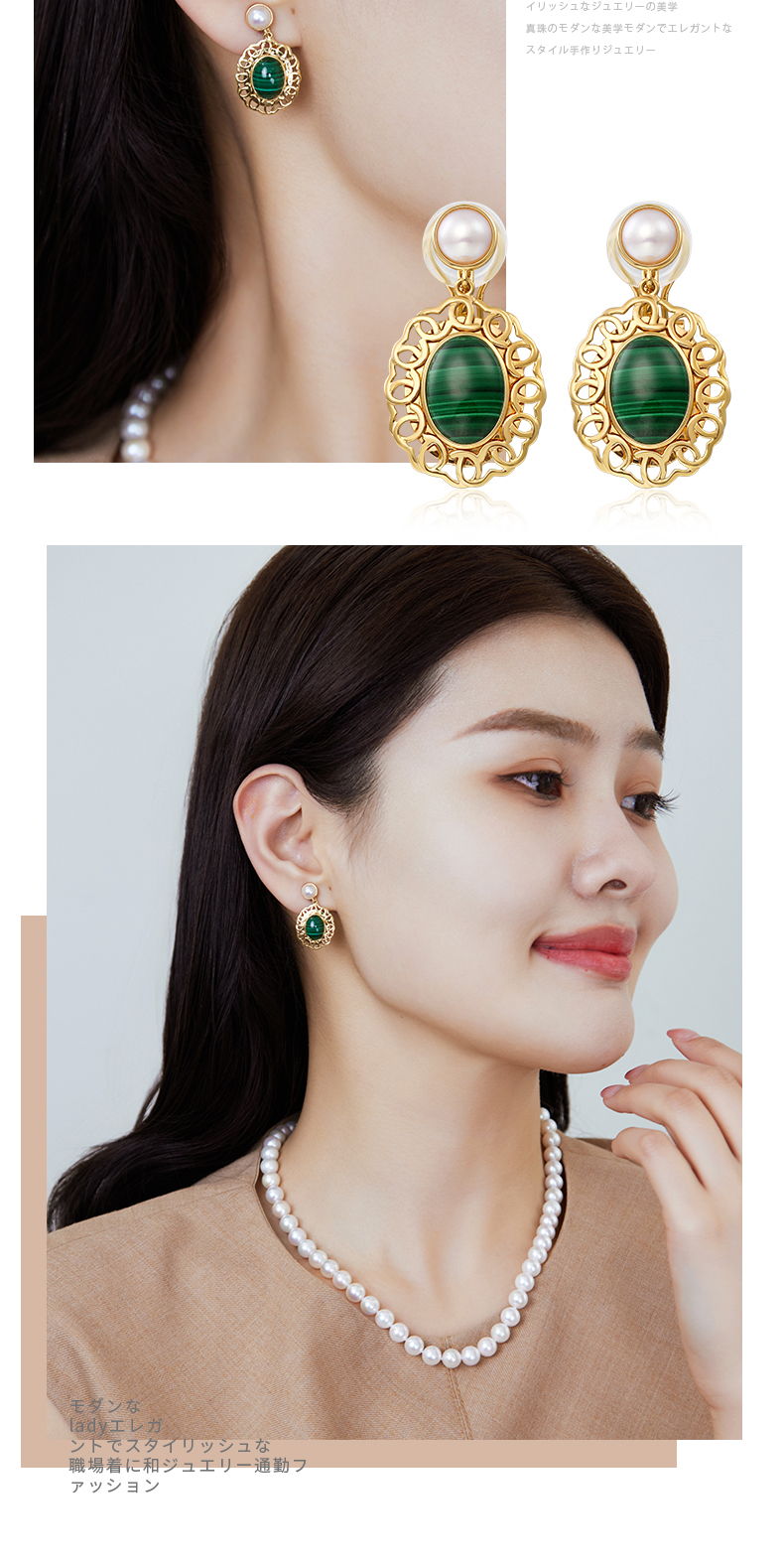 【天猫同款】悦甄 法桐耳夹18k金孔雀石Akoya珍珠耳夹