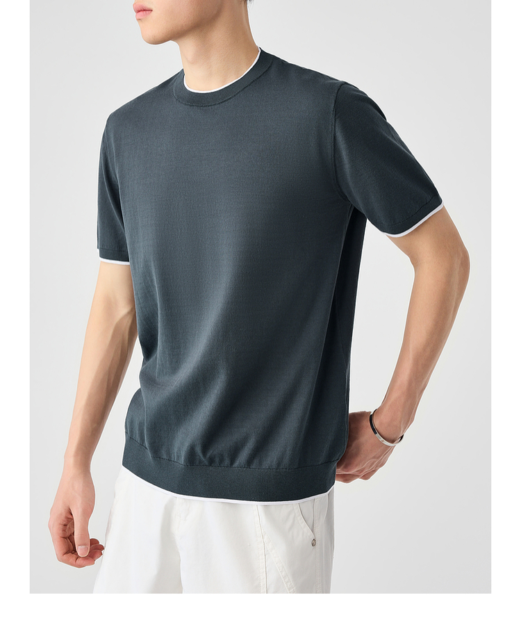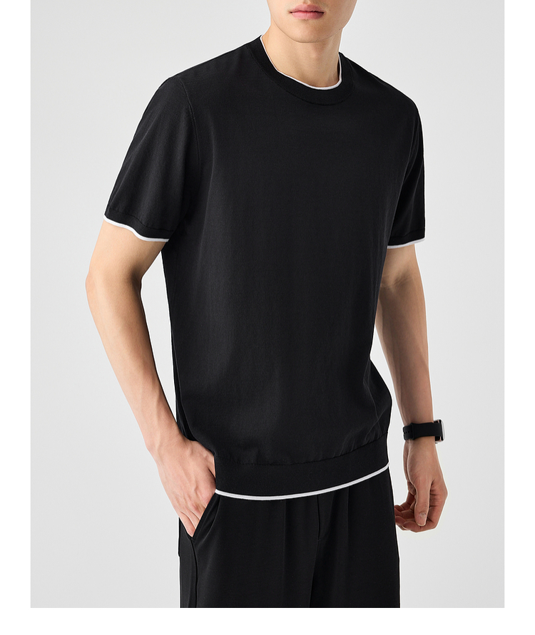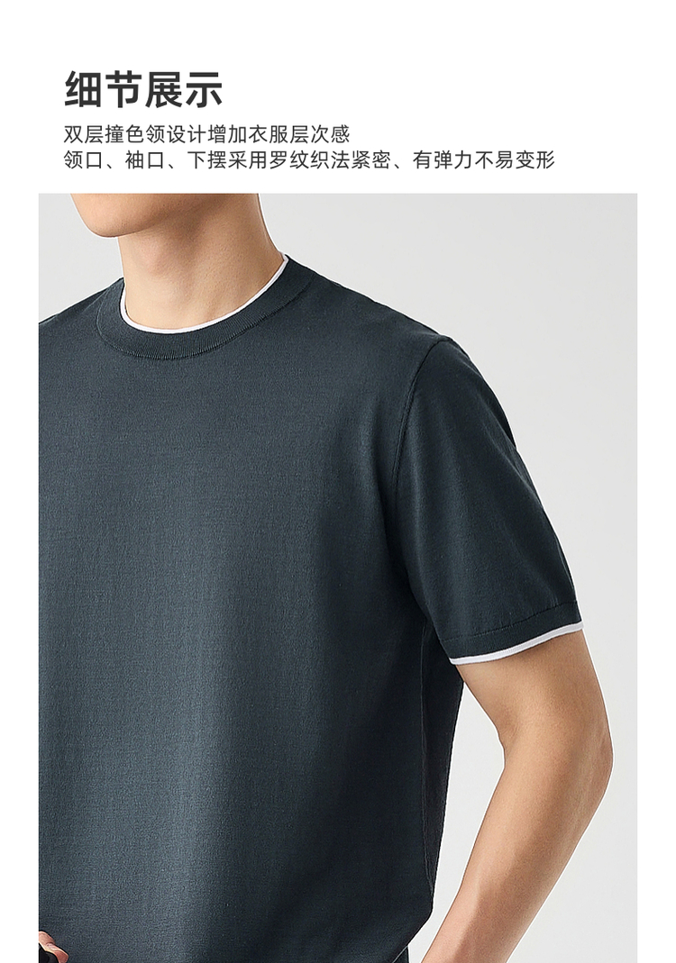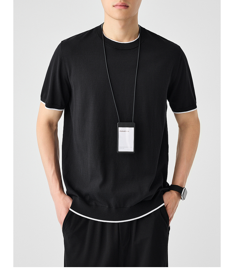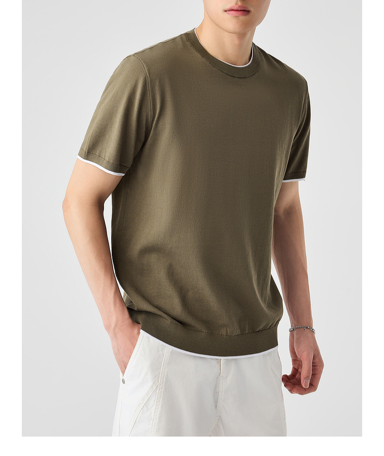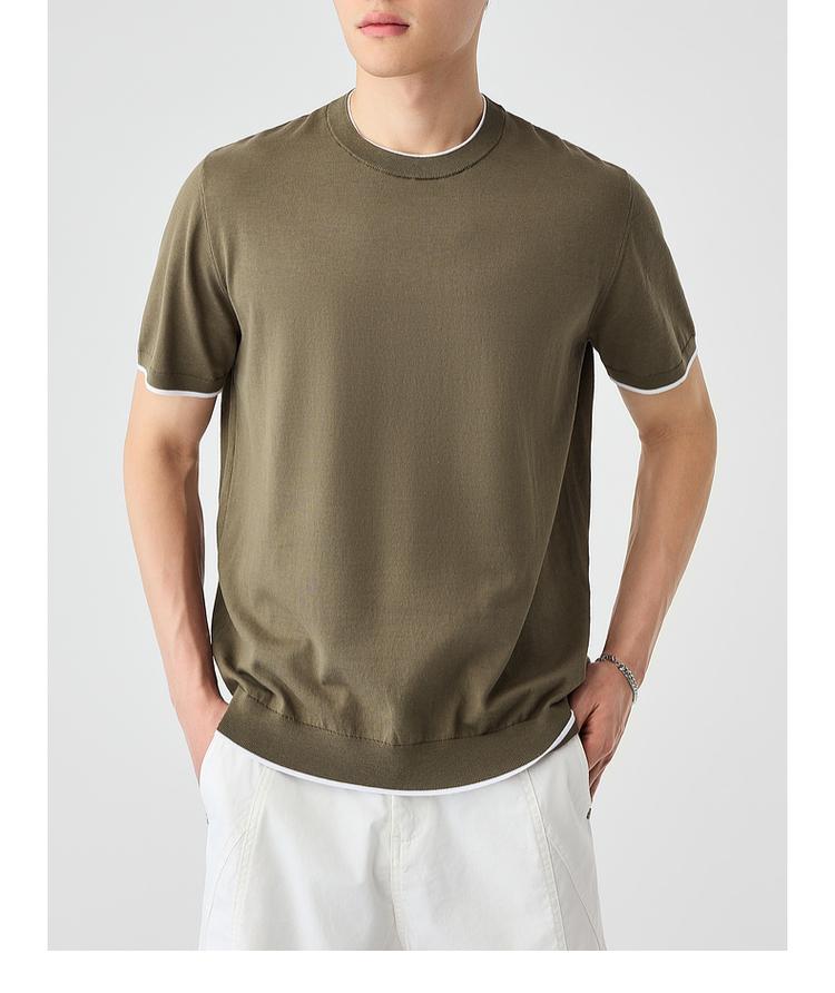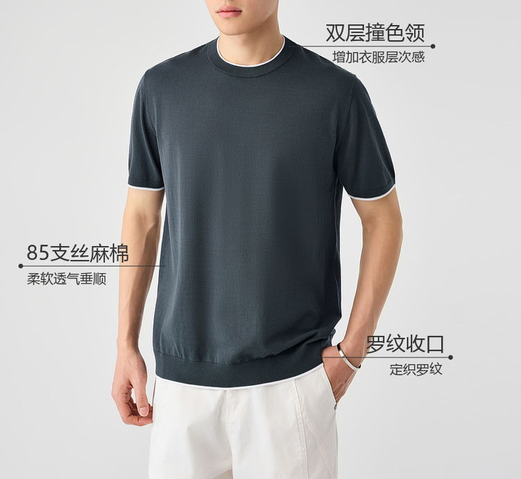 墨麦客双层撞色领假两件针织短袖T恤男2025年夏季直筒基础上衣男