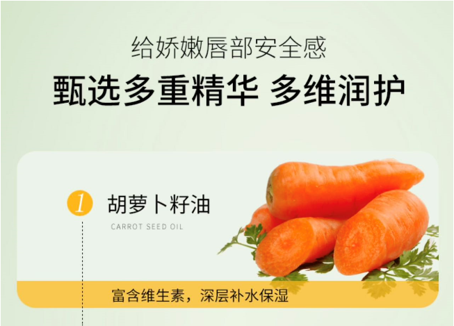 食用级天然成分,胡萝卜籽油会在光,温度和酸碱的环境中发生色泽变化,因每个人体温、血液循环速度,唇肌PH值不同,营造出独特的个人唇部色彩,千人千色!