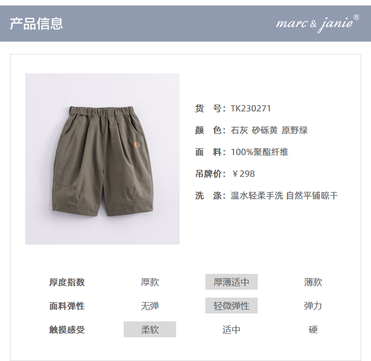 marcjanie马克珍妮新款夏装 男童户外风速干打褶五分裤230271
