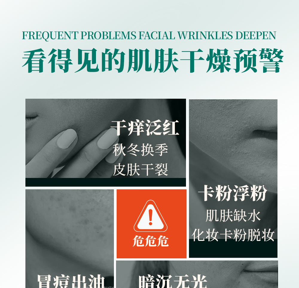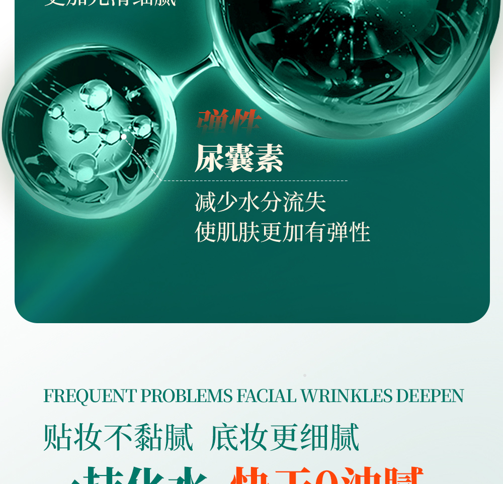 适用人群:肌肤干燥、起皮、粗糙、细纹明显、细纹加深、化妆卡粉浮粉等人群