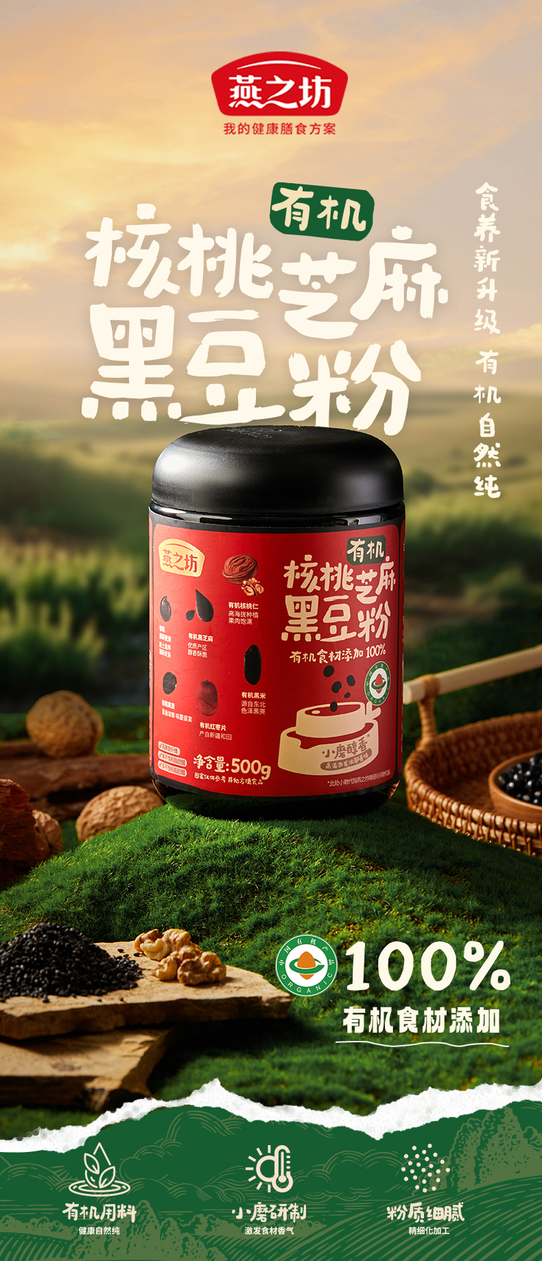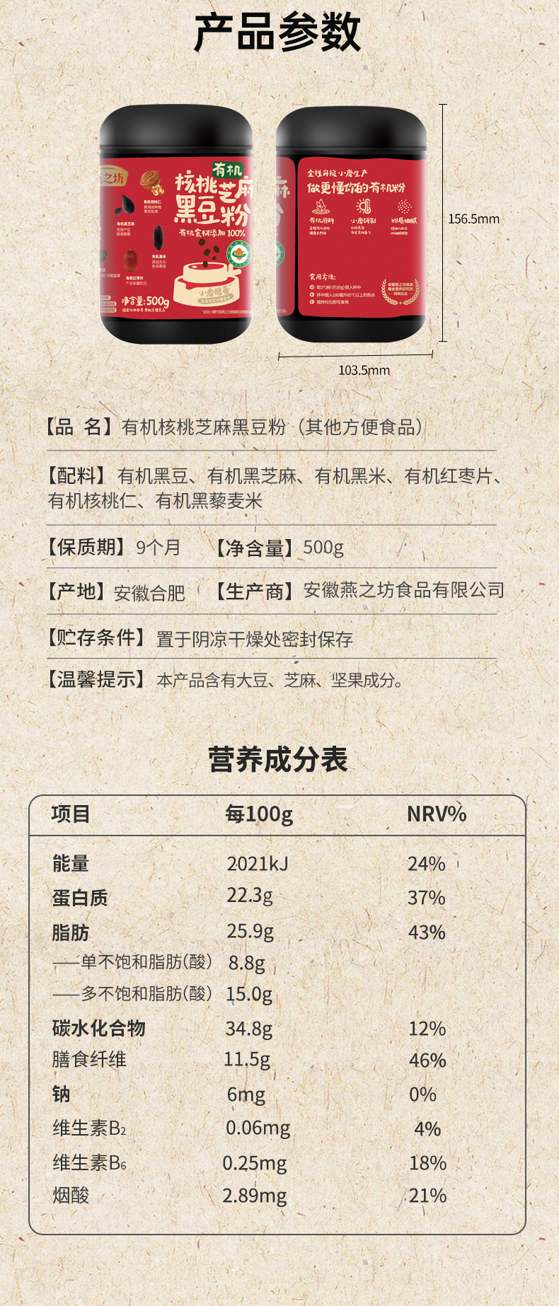 【凤品优选】燕之坊有机核桃芝麻黑豆粉500g 黑芝麻糊五谷物粉营养早餐即食速食代餐粉
