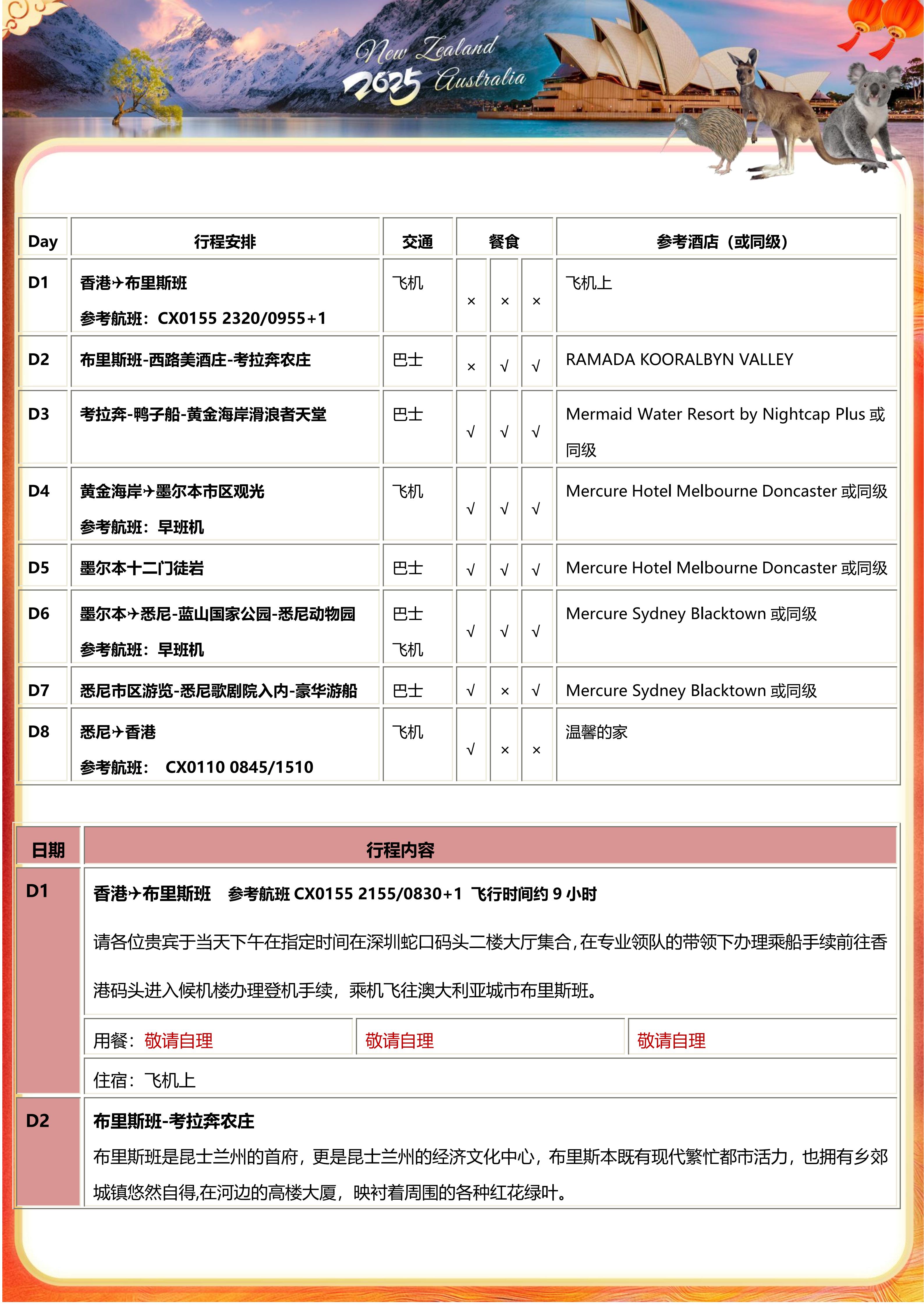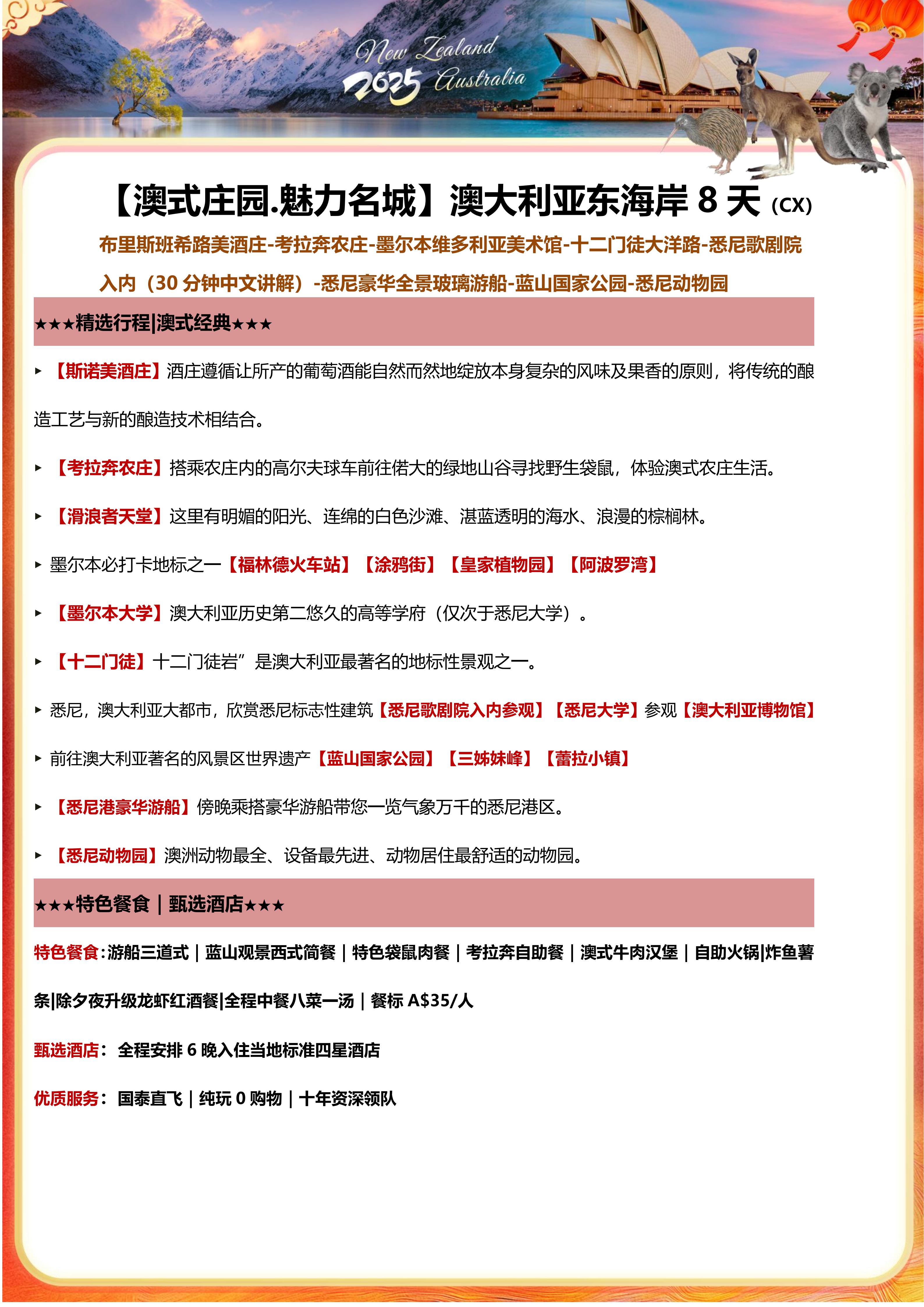 【春节不请假】<澳大利亚东海岸8天>布里斯班希路美酒庄-考拉奔农庄-墨尔本维多利亚美术馆-十二门徒大洋路-悉尼歌剧院入内(30 分钟中文讲解)-悉尼豪华全景玻璃游船-蓝山国家公园-悉尼动物园