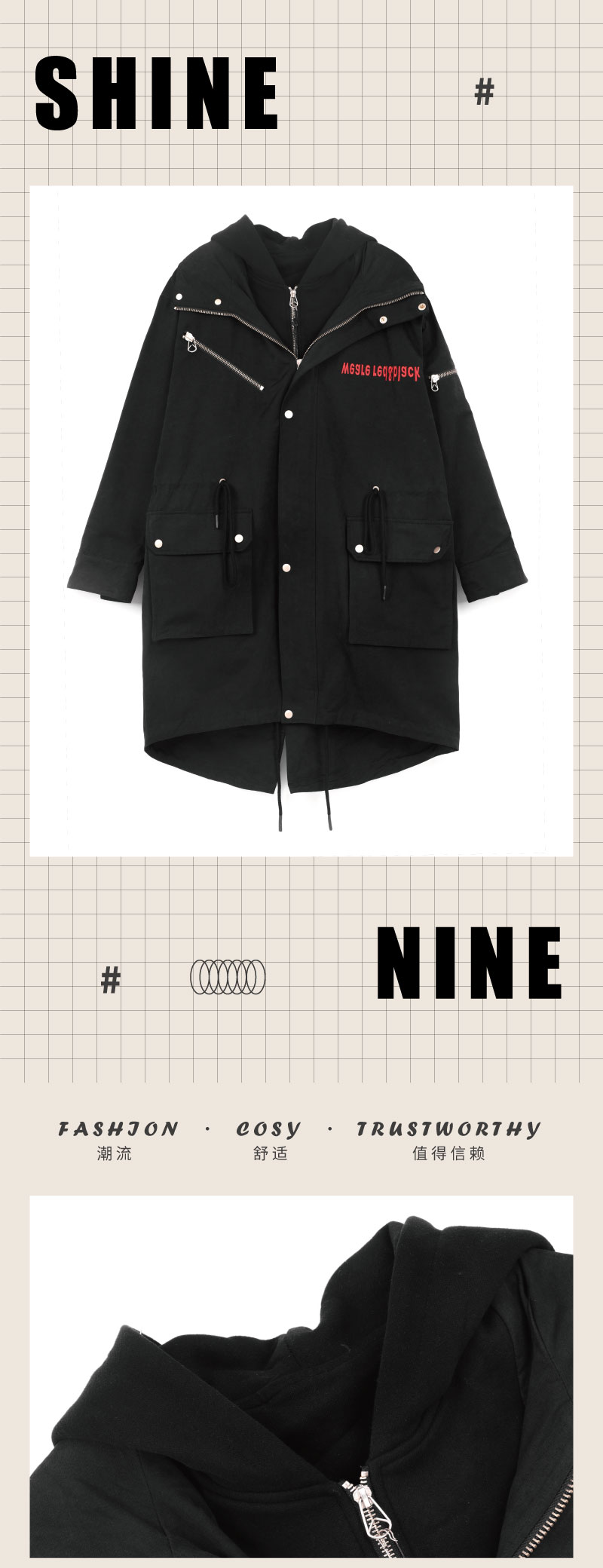 P93167577字母印花拉链装饰长款休闲帽衫风衣