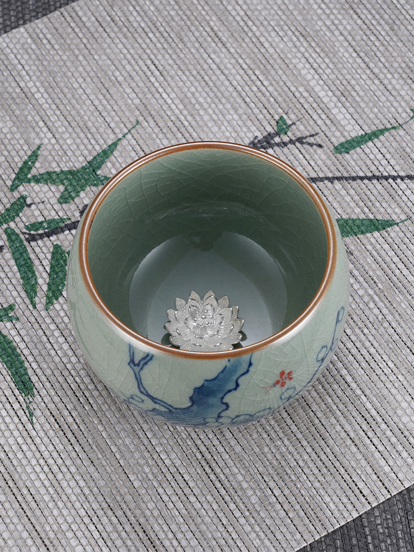 茶杯取意“花中四君子”之梅,青花墨韵绘就疏影,杯内暗嵌莲纹,寄寓梅开五福、莲连如意。