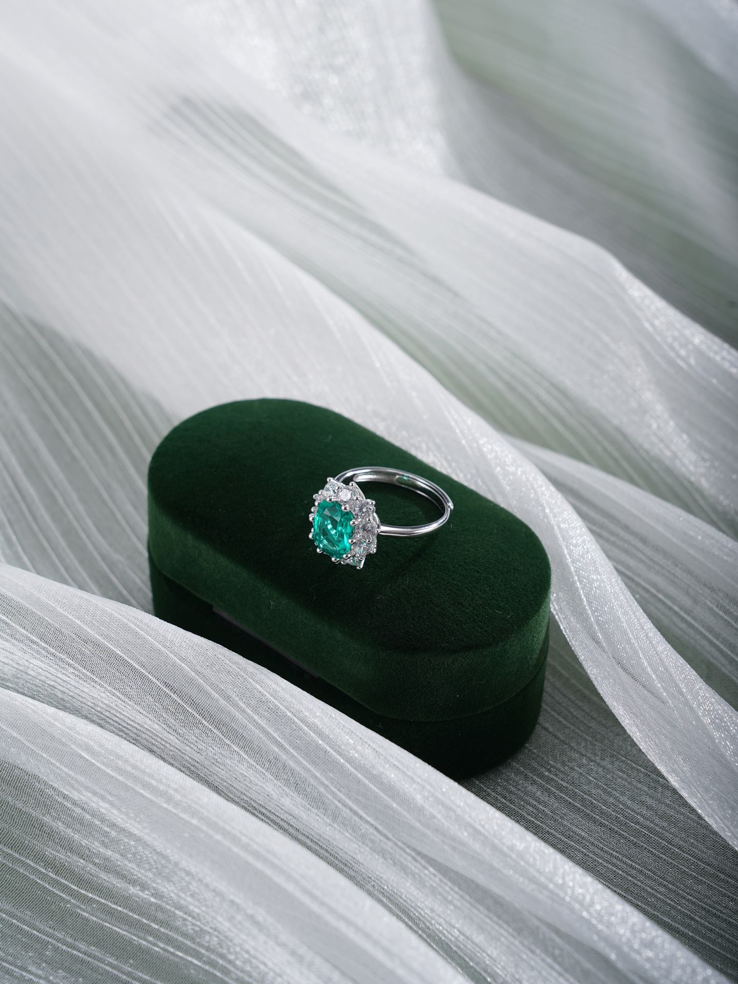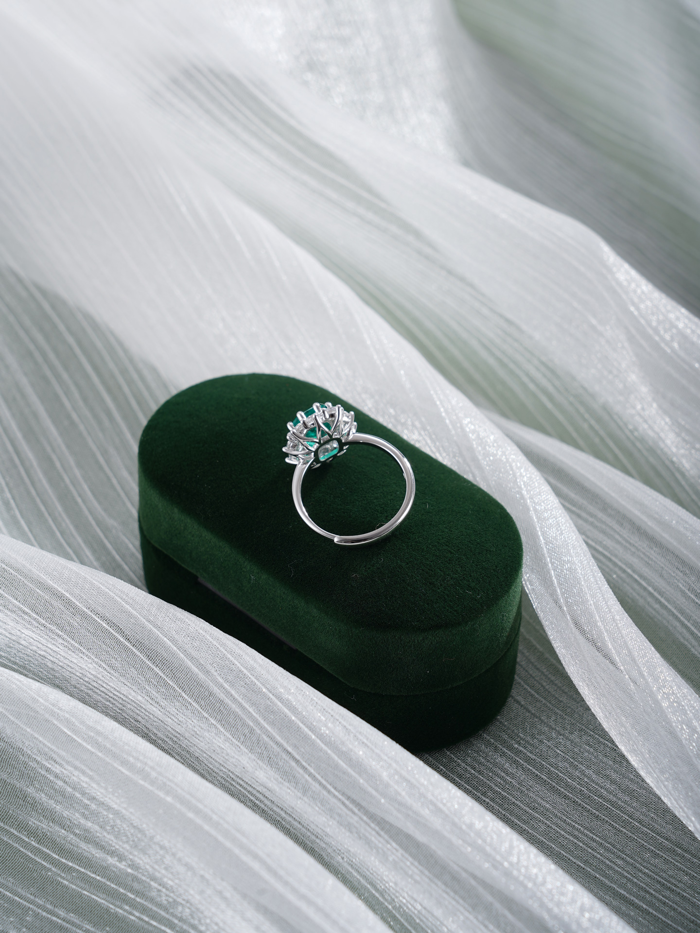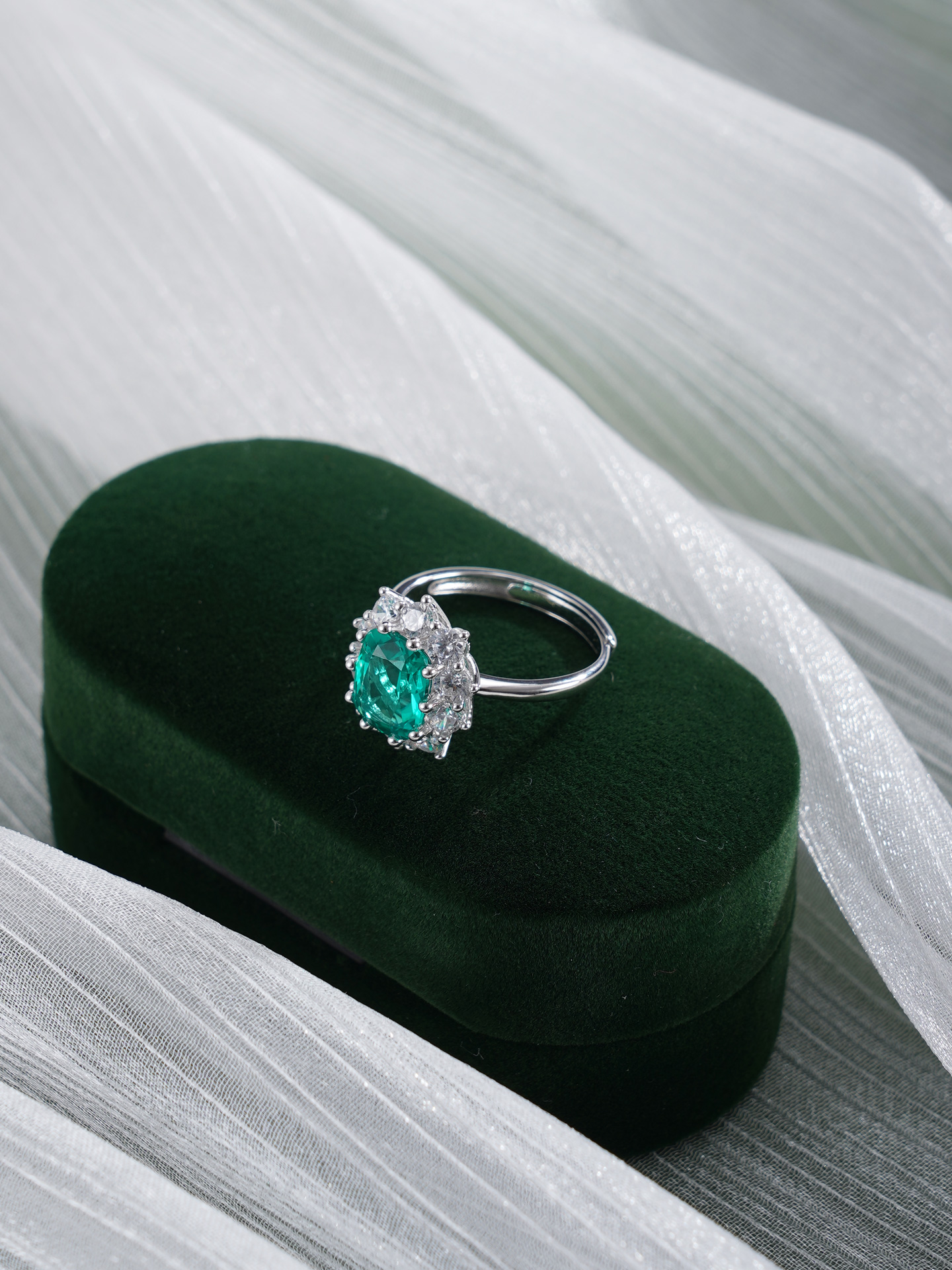 【寓意】:采用S925纯银为戒托,以锆石勾勒花瓣柔弧,祖母绿镶嵌,如晴空下涟漪凝成的花影,象征生命在时光中绚烂生长,前程似锦。