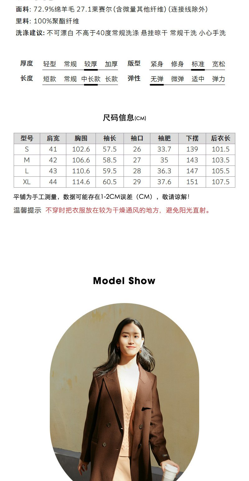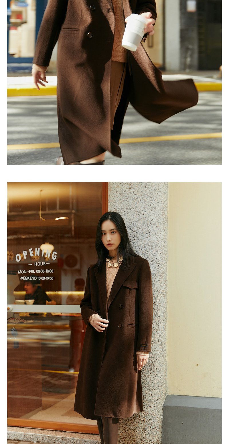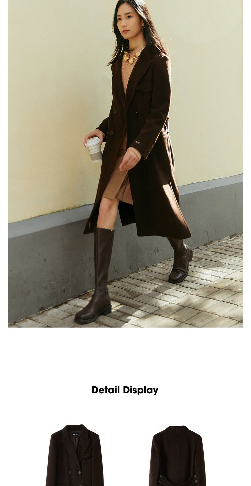 NEELLY纳俪冬季翻驳领双面呢大衣女双排扣可脱卸腰带中长款外套N21113N01206