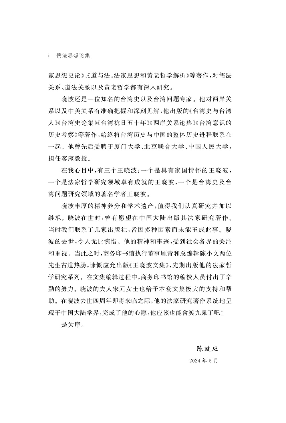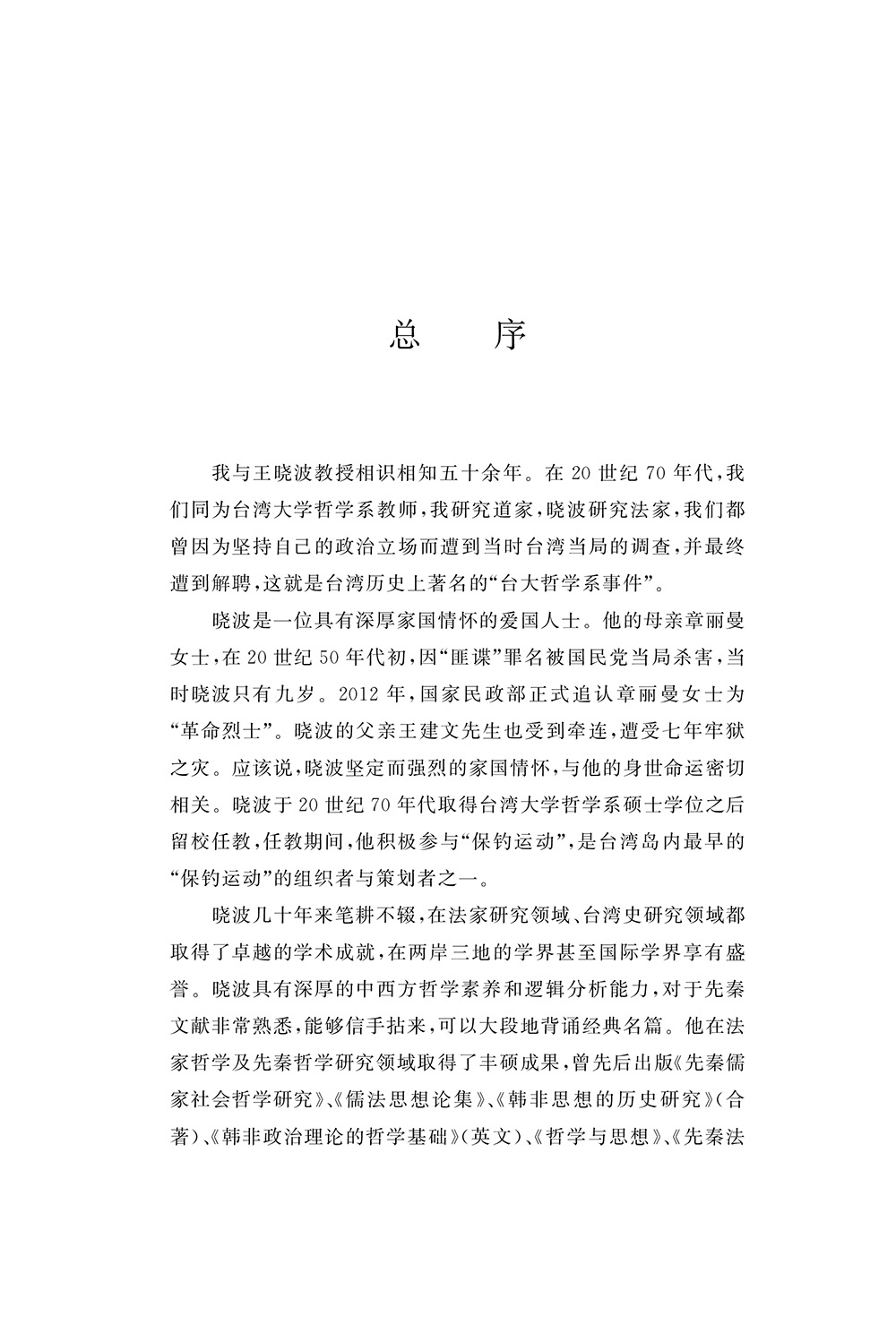 王晓波(1943—2020),台湾著名学者,历任台湾大学哲学系教授,世新大学共同科教授兼主任,台湾文化大学哲学系教授等,主要研究方向为中国哲学与台湾历史。曾任台湾史研究会理事长、《海峡评论》月刊创办人、中国先秦史学会法家研究会首任会长等职。