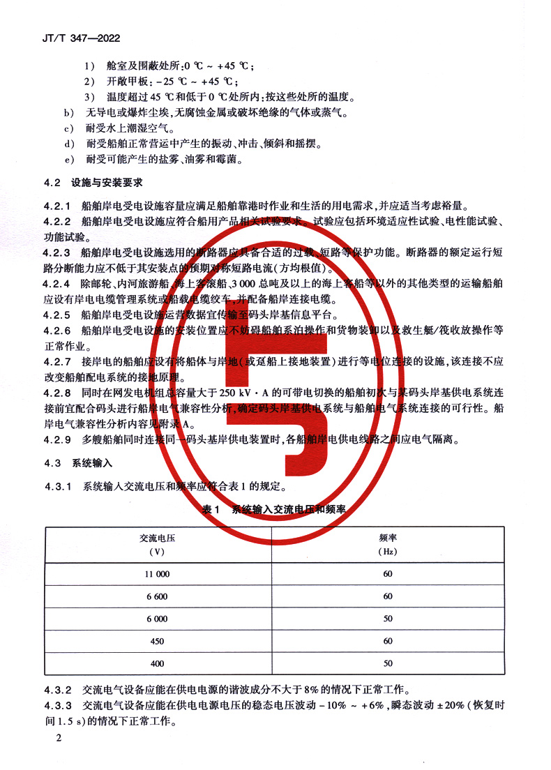 钢质船舶岸电受电设施技术要求(JT/T 347-2022)