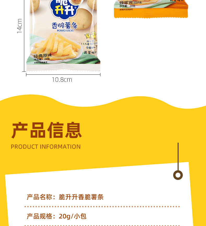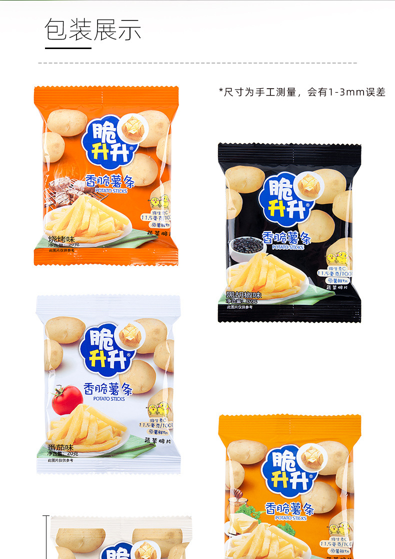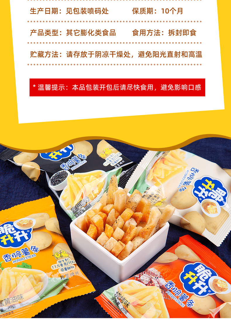 下单须知:脆升升薯条本身非真空包装,个别包装会比较扁,不影响食用,介意的亲慎拍哦,拍下则表示默认同意此说明,请悉知。