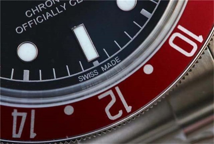 ZF厂帝舵格林尼治GMT红蓝可乐圈复刻表的表圈的设计非常个性化,属于我们常说的“可乐圈口”它的表圈是由阳极氧化铝制成的。从圆圈处可以看出,制表师非常细心,棱角分明,抛光效果很好。红色和蓝色的颜色与正品几乎没有区别。红色是低调的“酒红”,“蓝色”偏“黑”而且深沉,整个外圈采用哑光处理,两种颜色的拼接过于自然。“红蓝圈口”视觉和质感与其他手表形成鲜明对比,非常深沉低调。完美还原“红蓝圈”亦是ZF这款复刻手表的灵魂亮点。