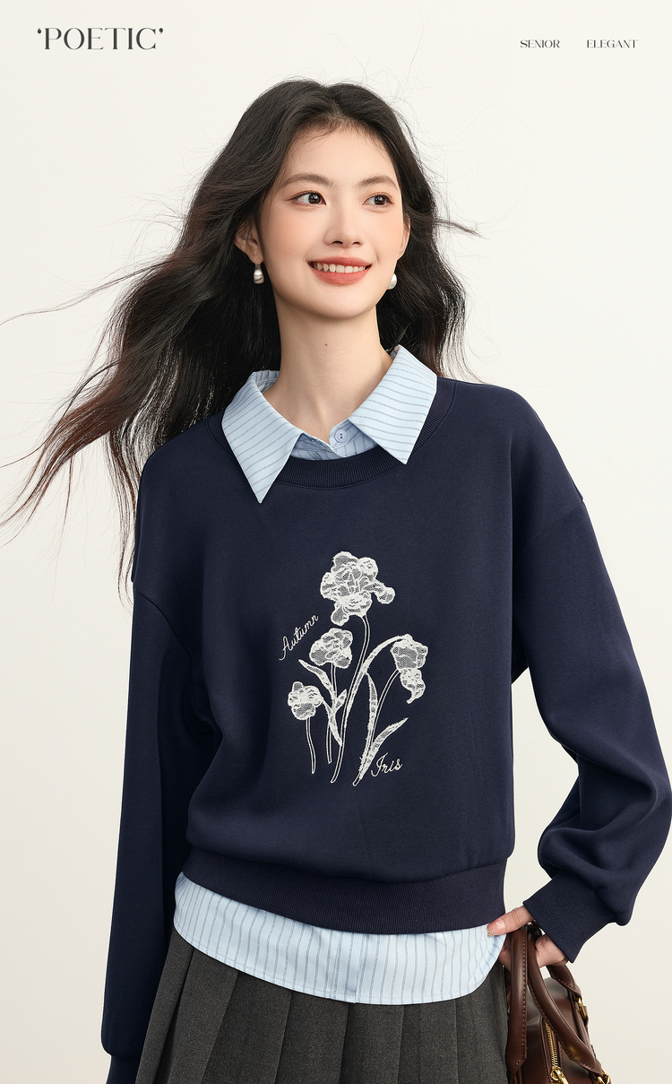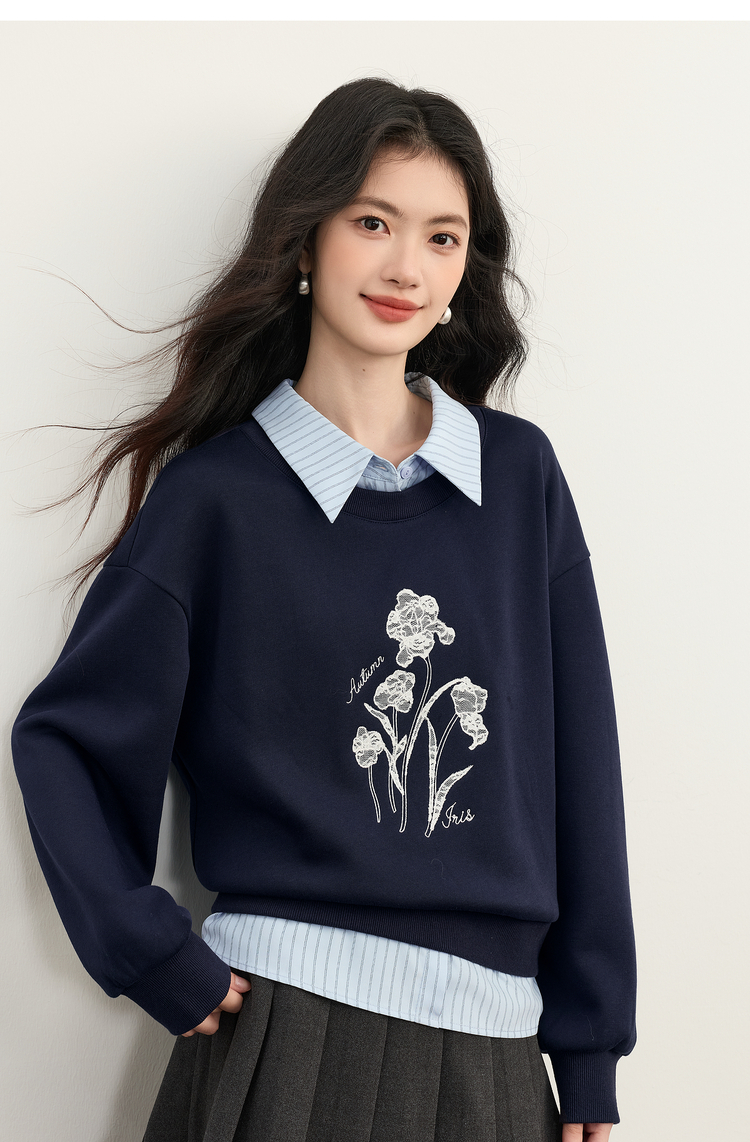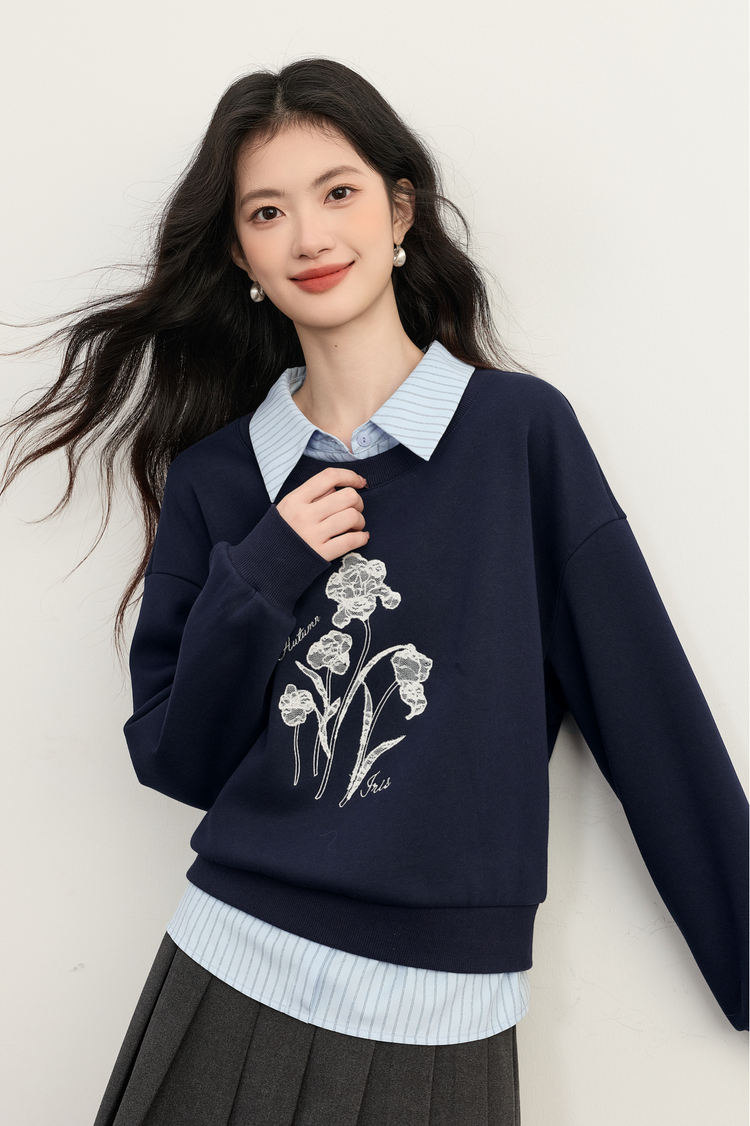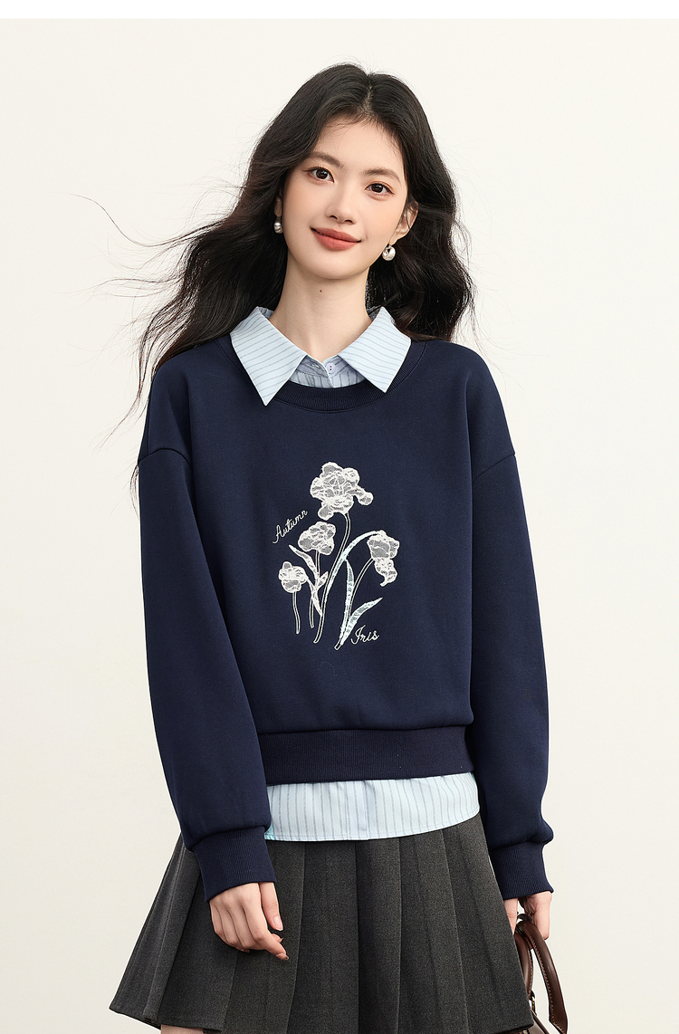【12/03新品】熙世界鸢尾花刺绣磨绒卫衣女秋冬设计感假两件条纹衬衫领拼接上衣
