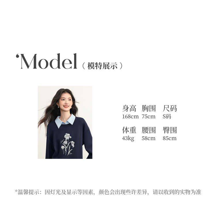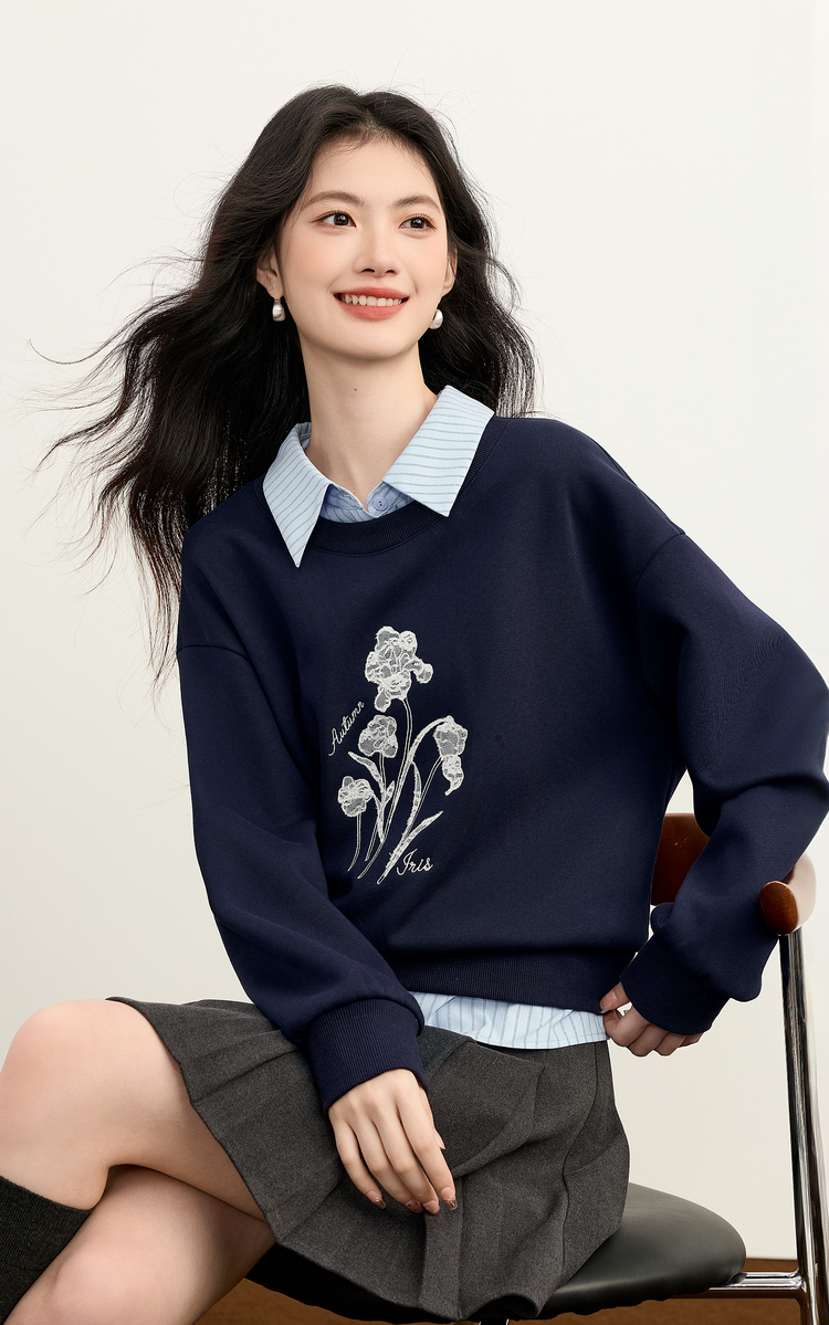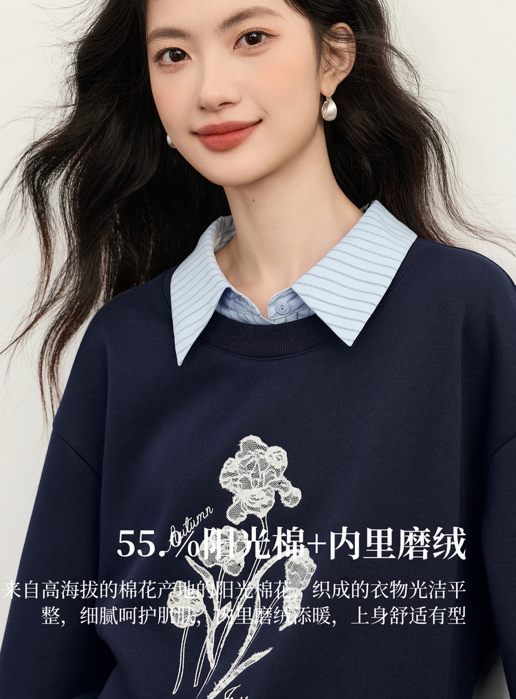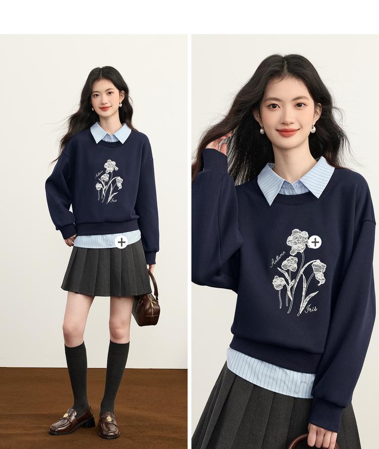 【12/03新品】熙世界鸢尾花刺绣磨绒卫衣女秋冬设计感假两件条纹衬衫领拼接上衣