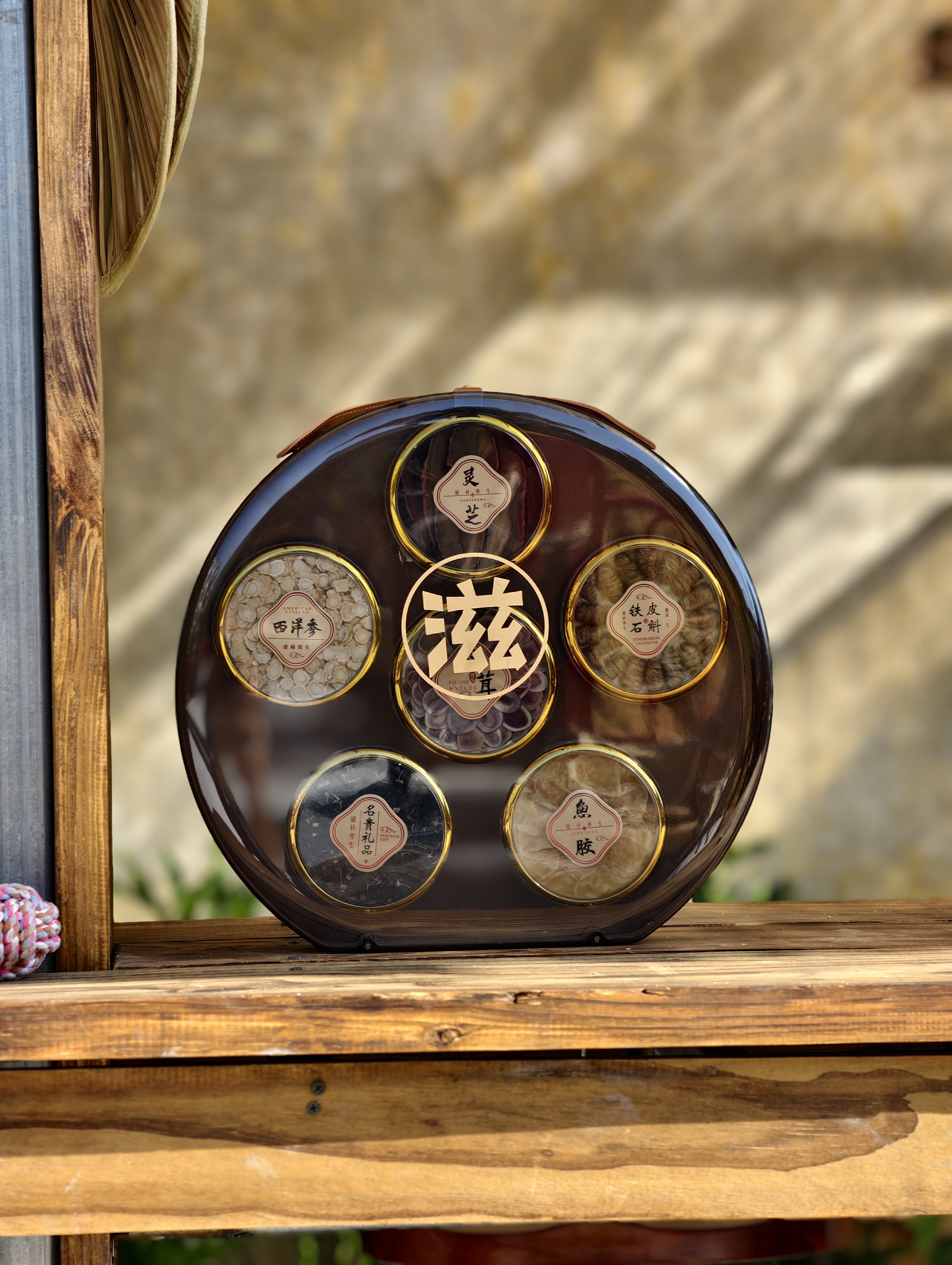 【礼盒内含】:鹿茸10克、灵芝片40克、石斛40克、黑枸杞50克、鱼胶20克, 西洋参20克