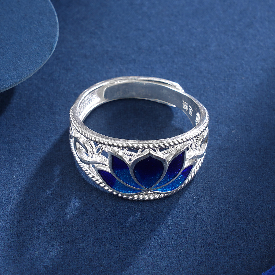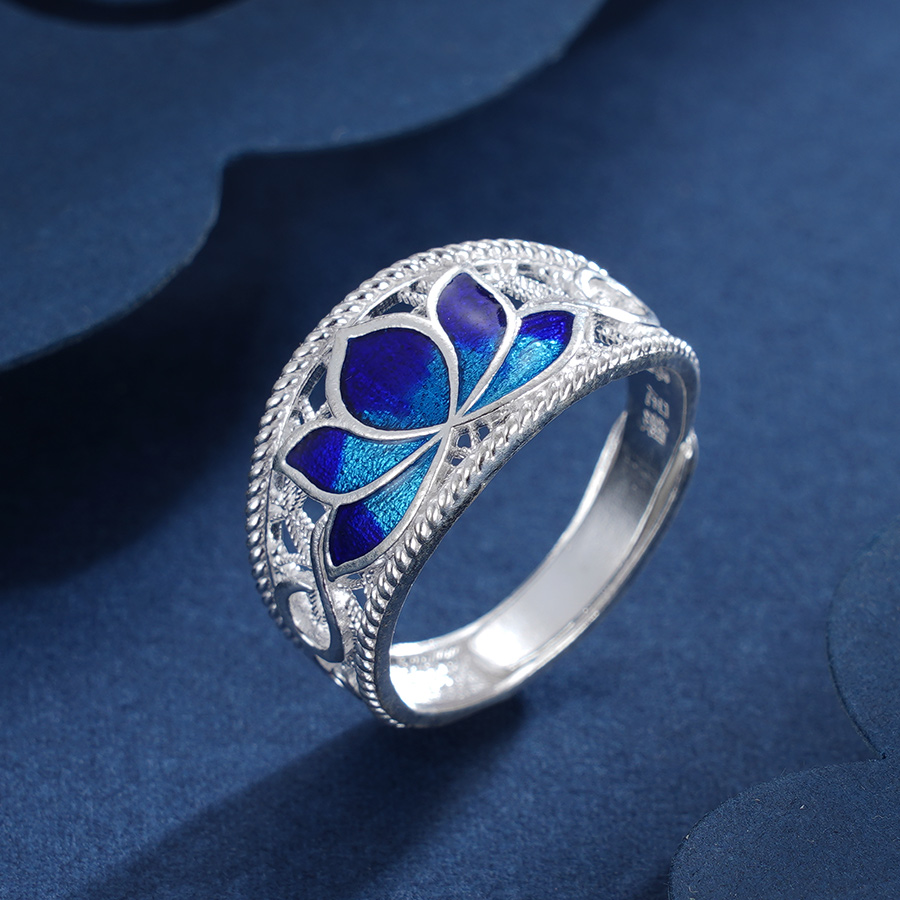 【寓意】:作品以莲花为灵感设计,采用花丝工艺打造。景泰蓝点染,生机盎然。整体清润温婉,意境深远,寓意鲜花漫天,幸福常伴。