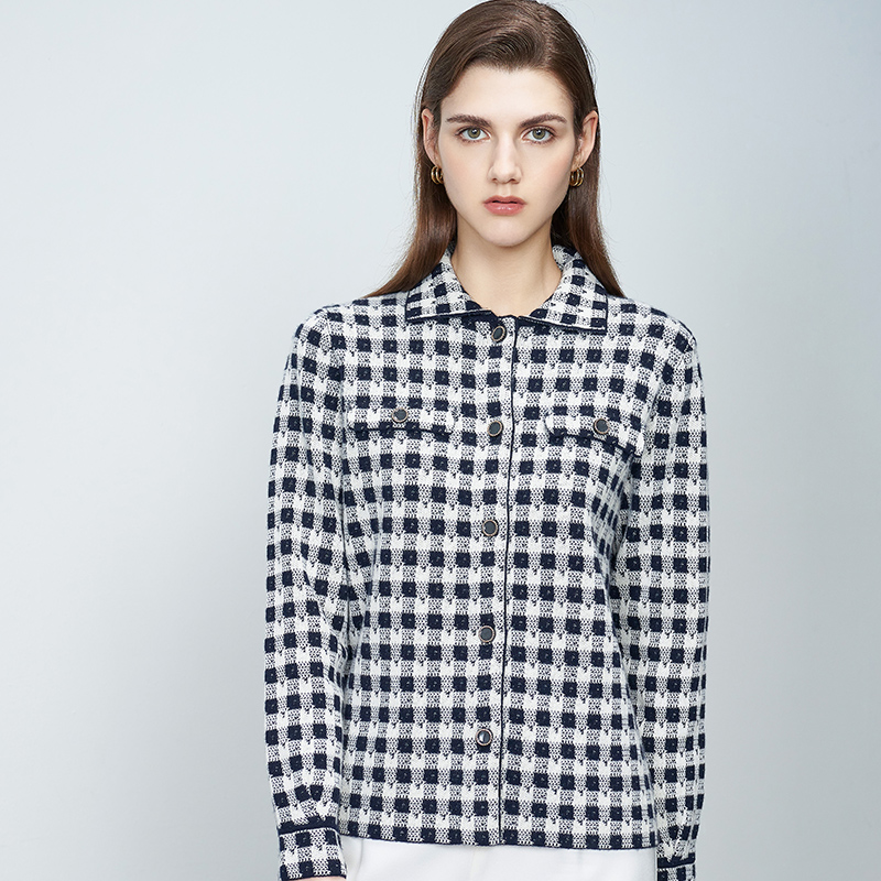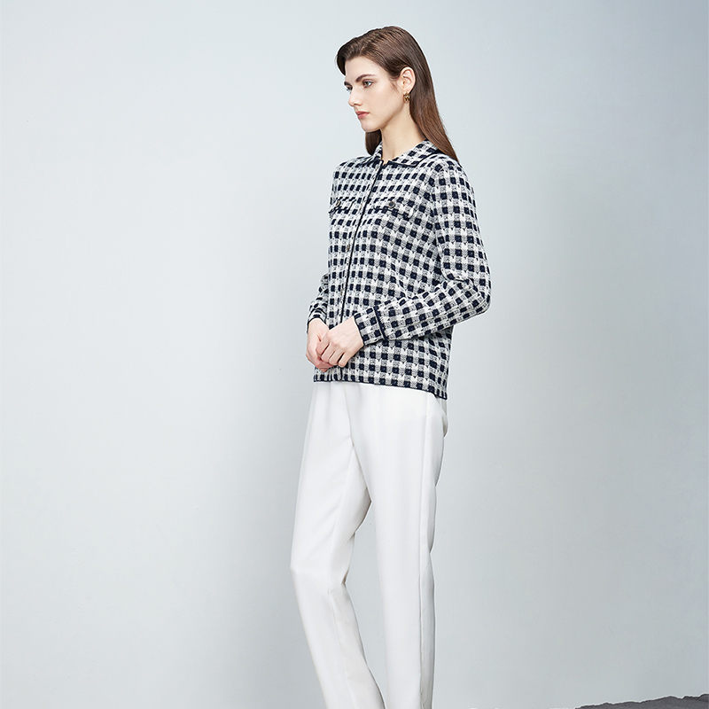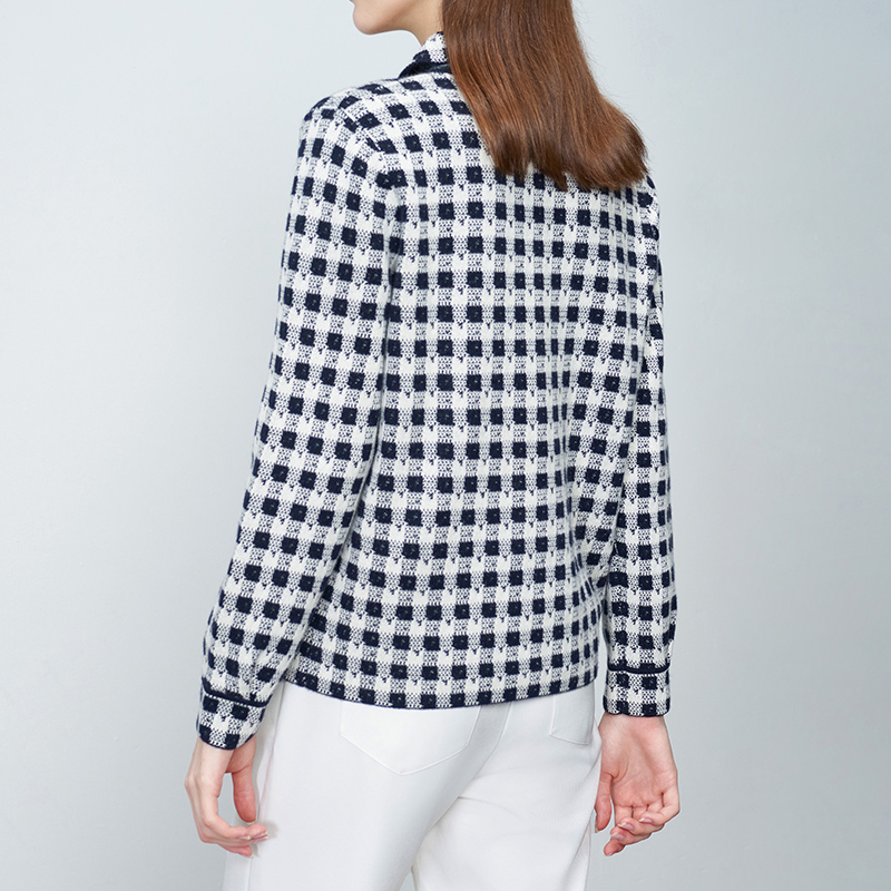 【100%山羊绒外套】羊绒世家22年秋冬新品女士翻领长袖外套经典黑白格子针织外套
