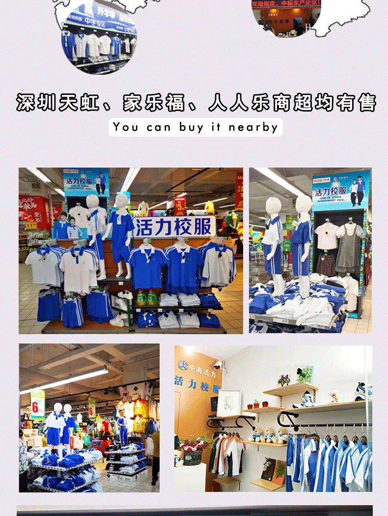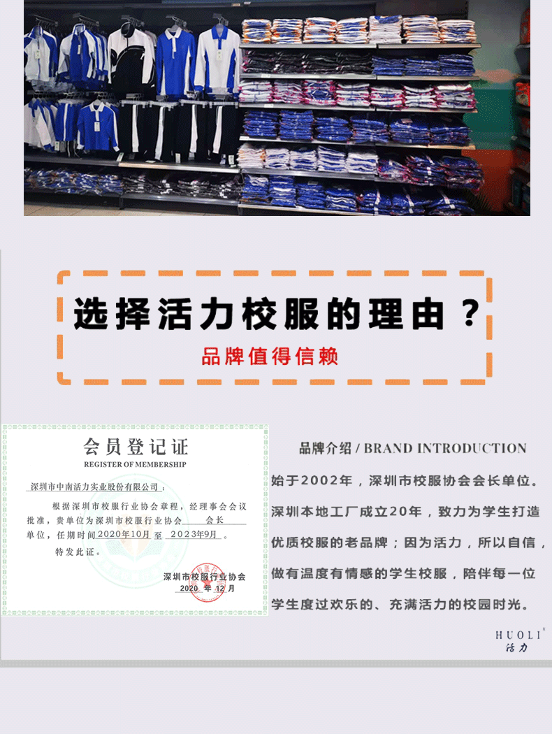 活力校服由深圳市中南活力实业股份有限公司创建的品牌,深圳二十一年老品牌,教育局中标企业;主营深圳校服、广州校服、东莞校服、佛山校服、肇庆校服、江苏校服、鞋袜、学生床上用品等学生课桌椅一站式教育领域产品