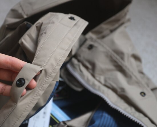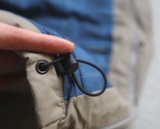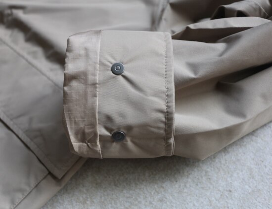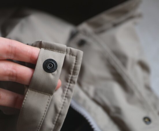 袖口 有两个按扣 但围度挺大的 卡不住手腕 底边一圈有弹力抽绳 可收紧