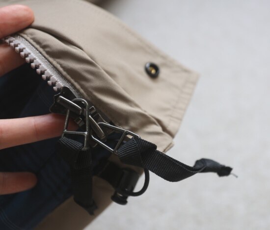 因为 在前襟两侧 还隐藏了拉链口袋 兜衬也是铜氨丝斜纹布