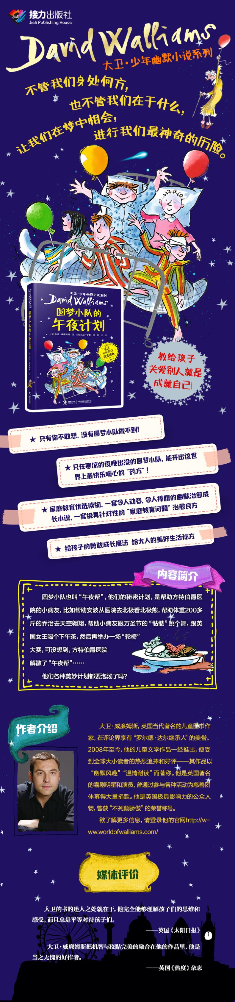 1.只有你不敢想,没有圆梦小队做不到!只在寒凉的夜晚出没的圆梦小队,能开出这世界上*快乐暖心的“药方”!2. 荣获英国孩子的“奥斯卡”图书大奖——红房子图书奖,往届获奖者包括昆廷·布莱克,罗尔德·达尔和J.K.罗琳等红遍全球的畅销童书作家3. 家庭教育优选读物,一套令人动容、令人捧腹的幽默治愈成长小说,一套极具针对性的“家庭教育问题”治愈良方4. 给孩子的勇敢成长魔法 给大人的美好生活秘方5. 英国家庭亲子阅读*读物,畅销欧美的儿童心灵成长小说,中国著名儿童文学作家曹文轩鼎力推荐6. 英国当代炙手可热的儿童文学作家、罗尔德·达尔的*继承人——大卫·威廉姆斯创作7. 英国著名插画大师、“*绘者银画笔刷奖”“德国儿童图书奖”“英国聪明豆图书银奖”得主——托尼·罗斯创作插画