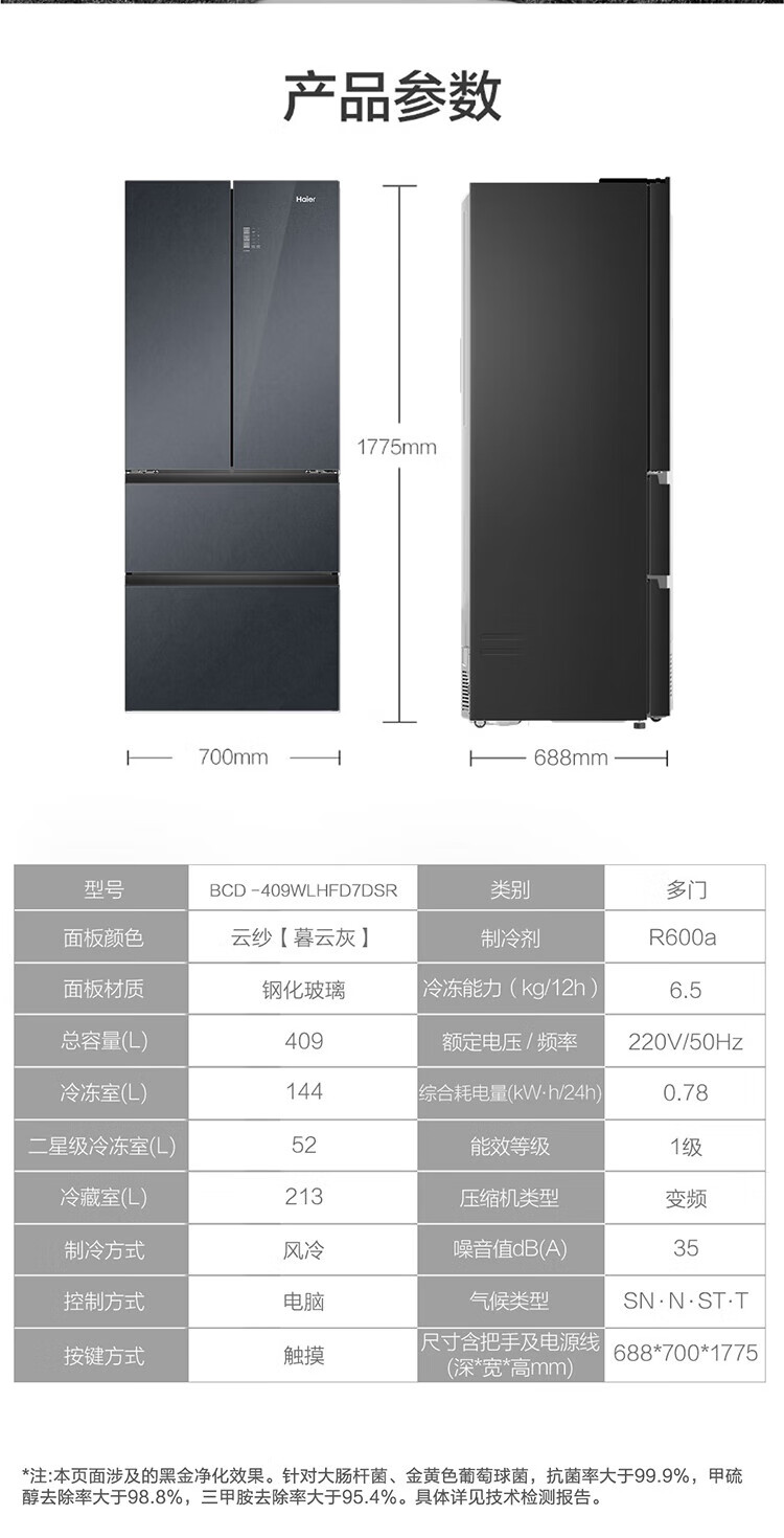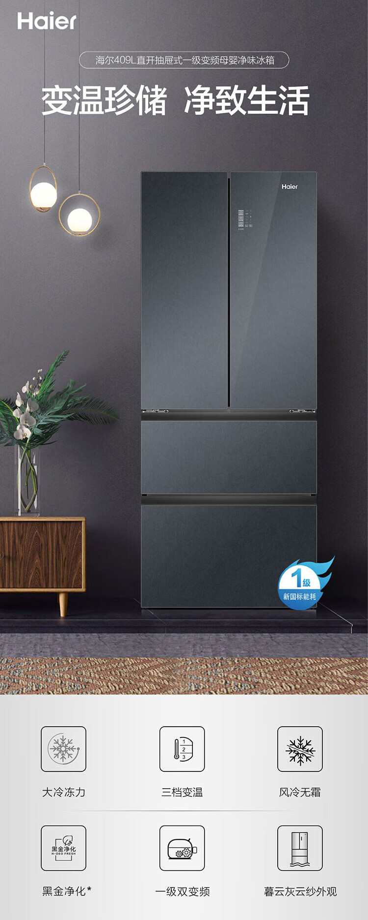 海尔(Haier)409升法式多门风冷无霜一级能效双变频大容量超薄嵌入净味除菌三档变温母婴钢化玻璃面板家用冰箱