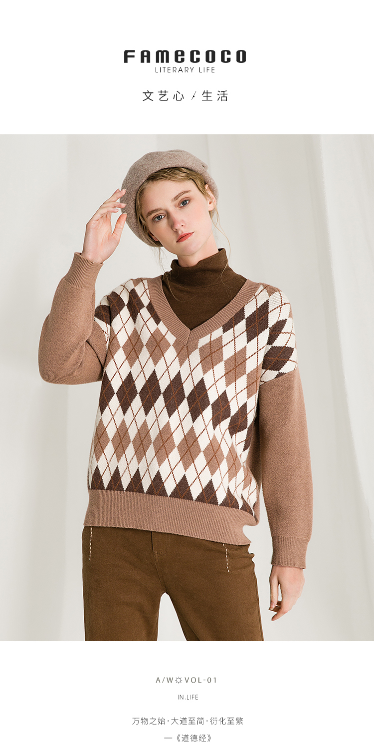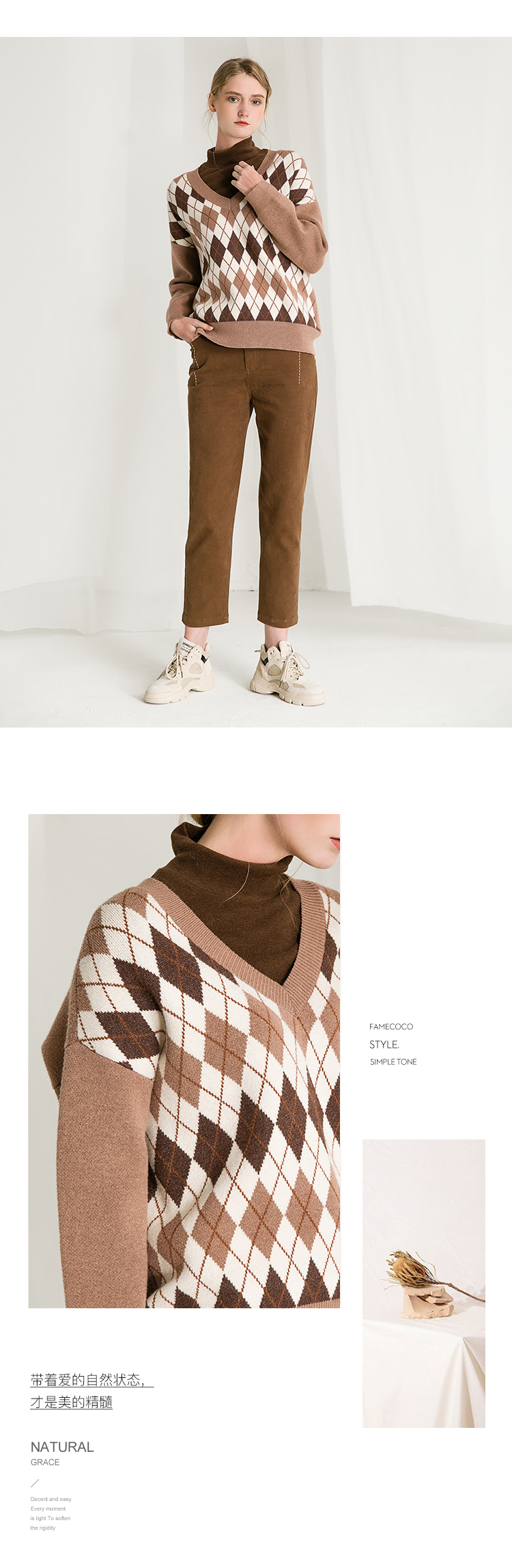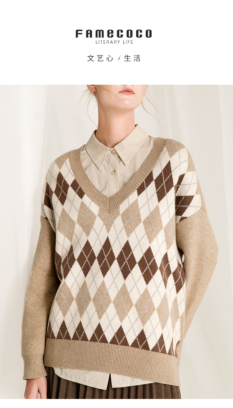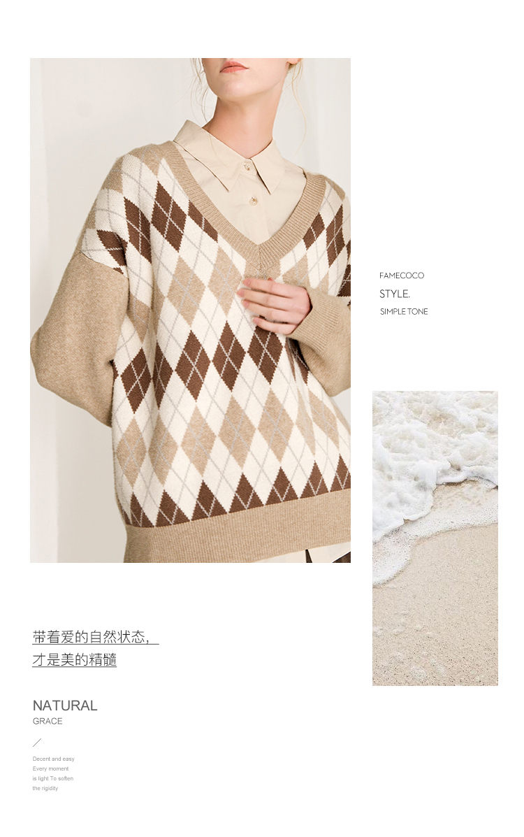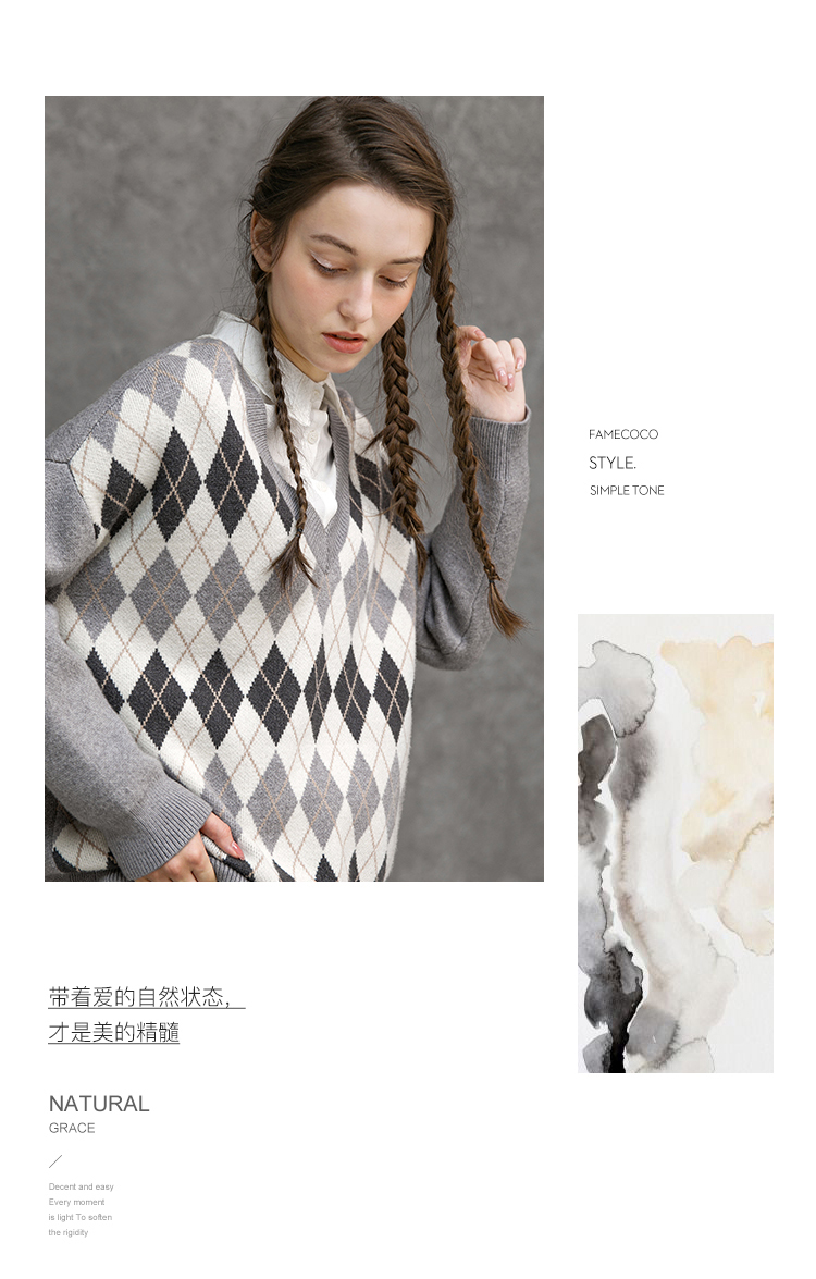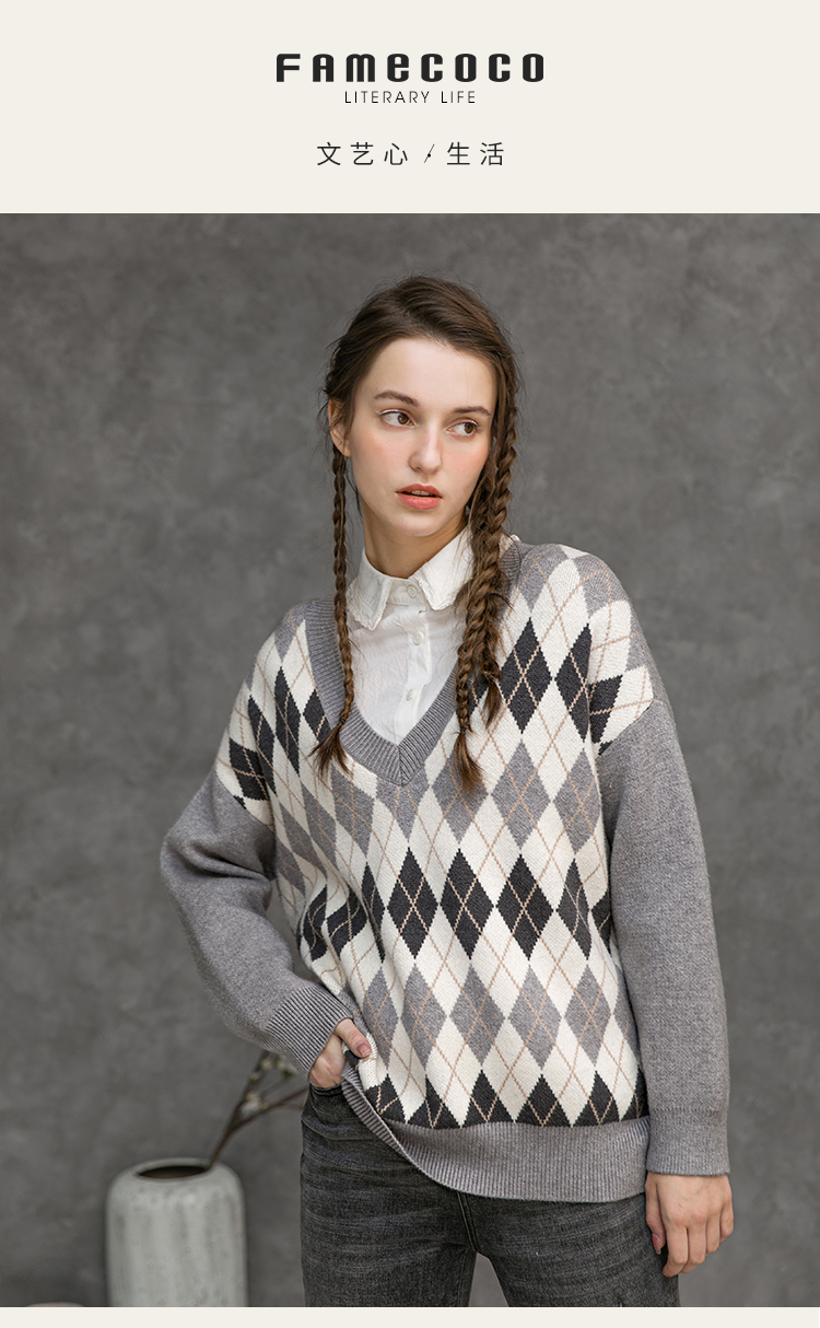 Famecoco范可儿毛衣女菱形方块冬季宽松灰色针织衫F218DD002