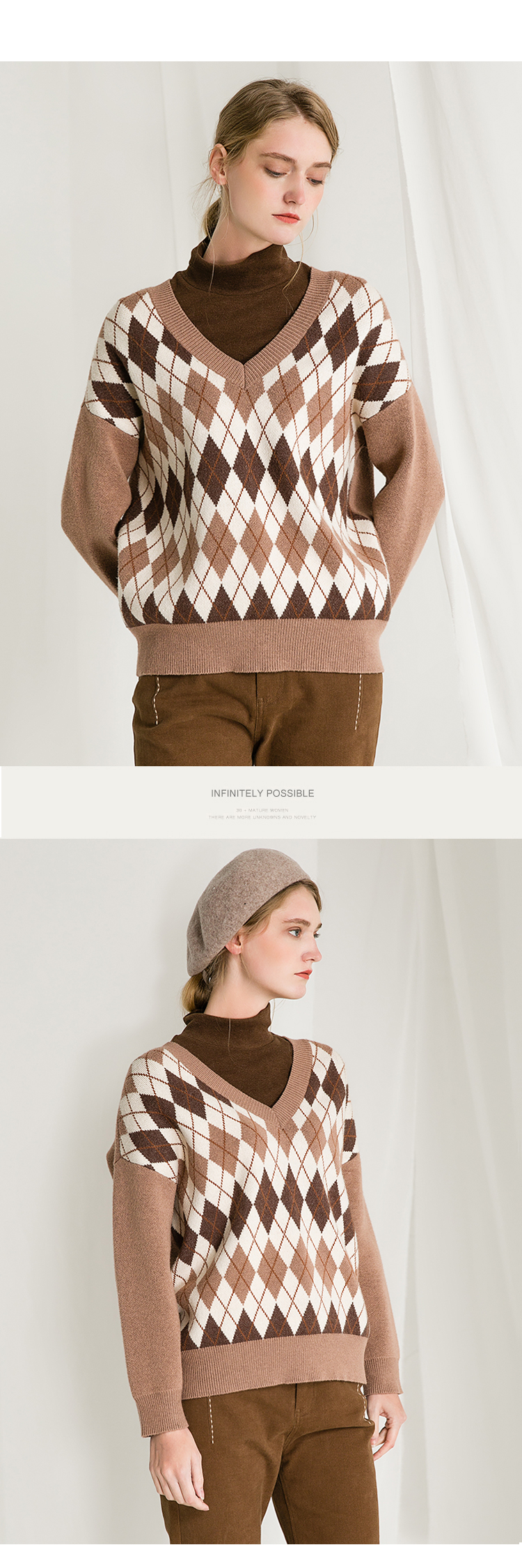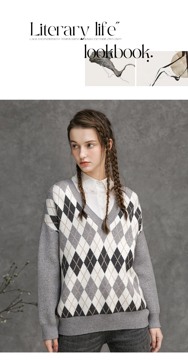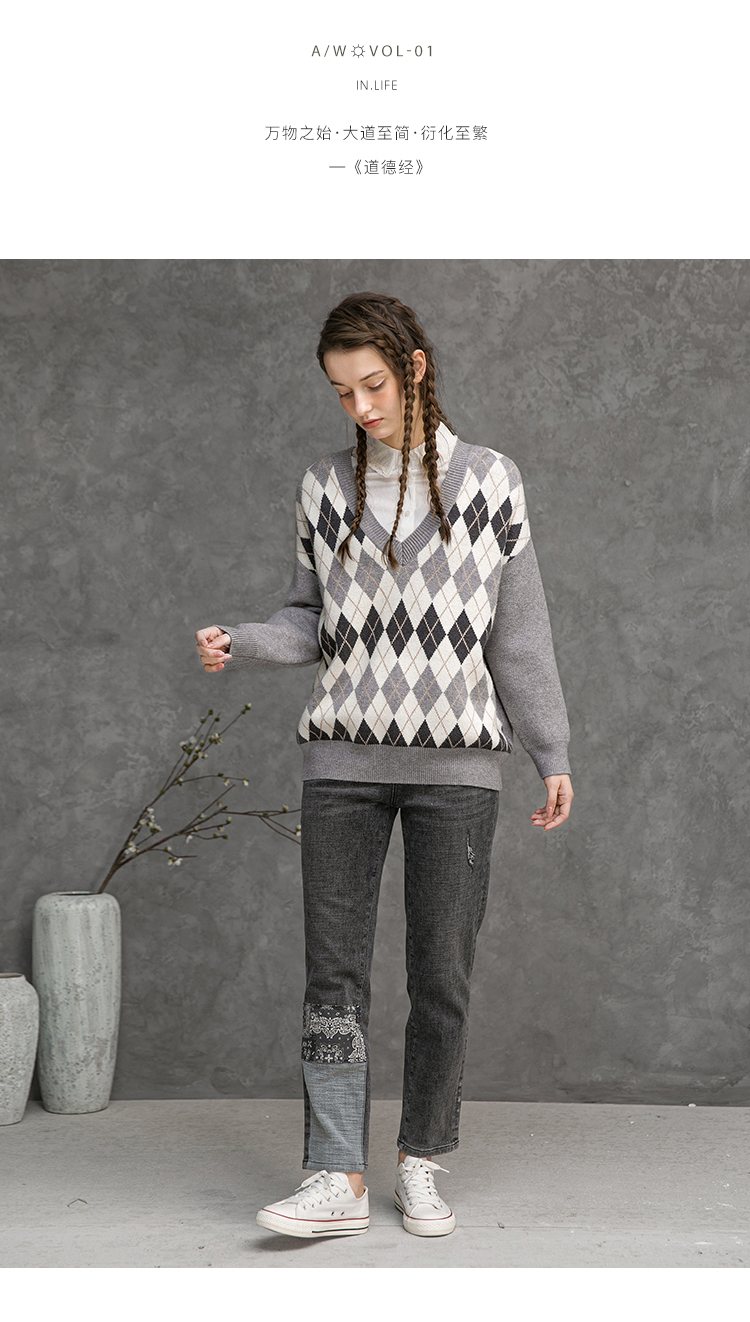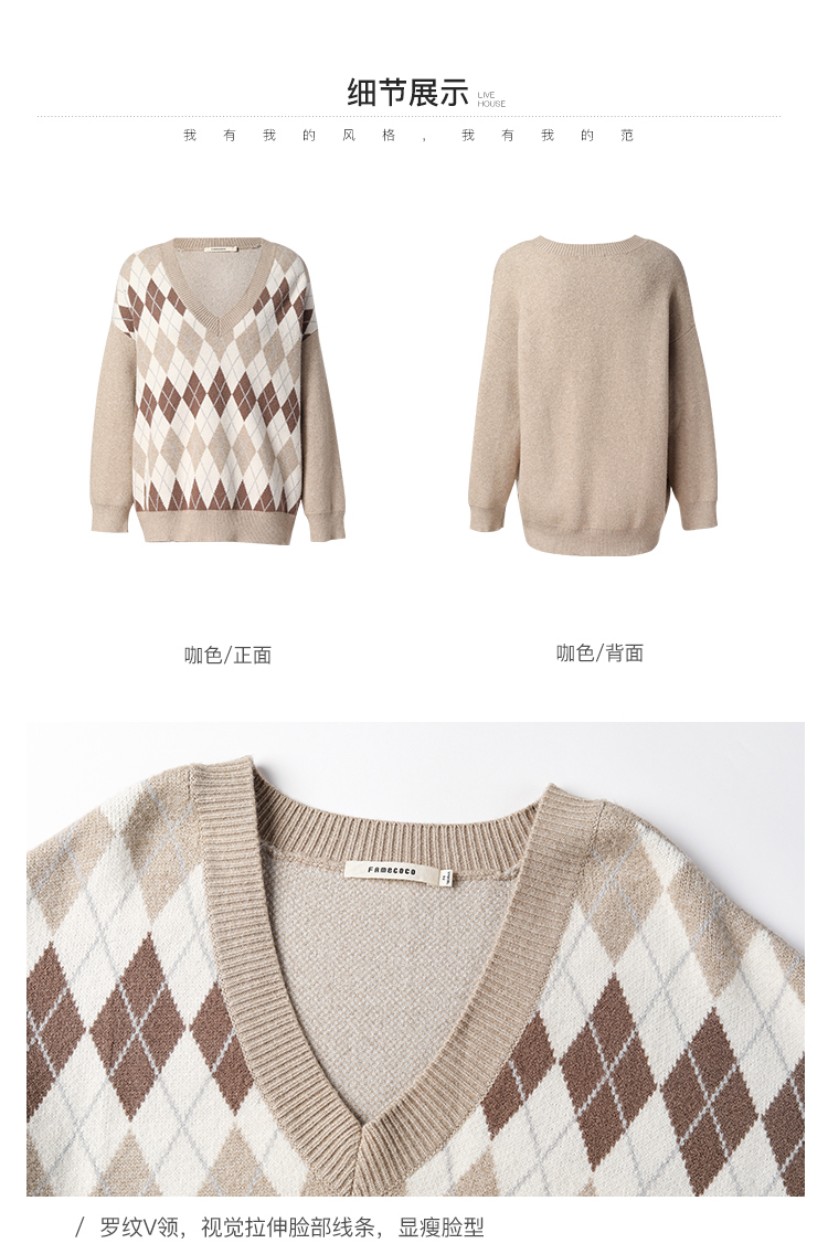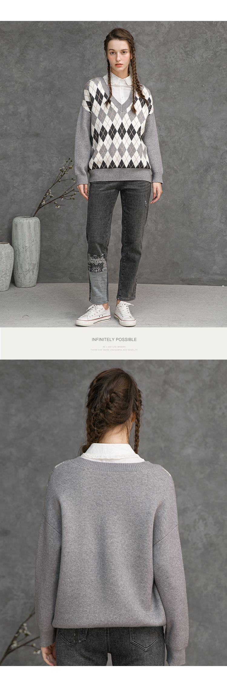 Famecoco范可儿毛衣女菱形方块冬季宽松灰色针织衫F218DD002