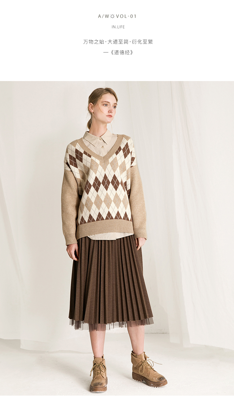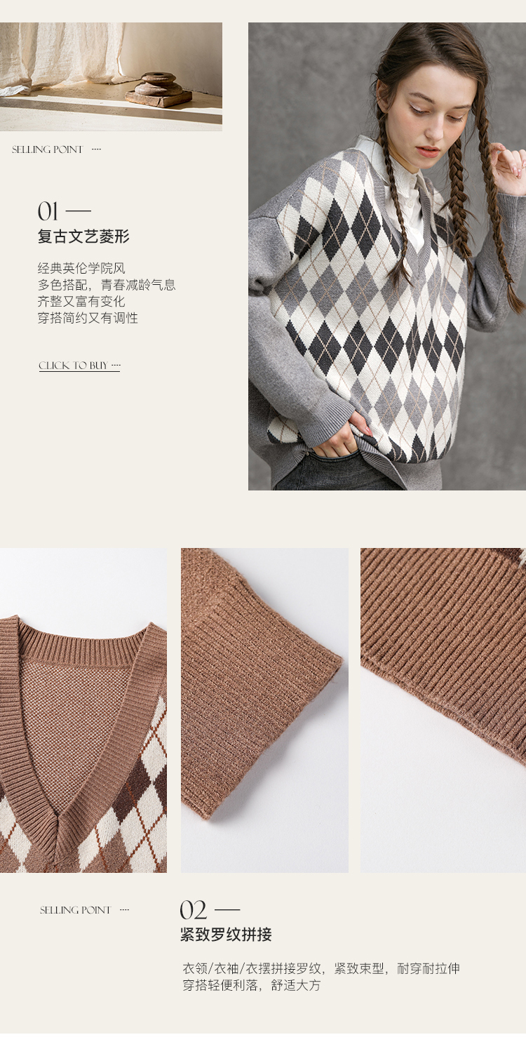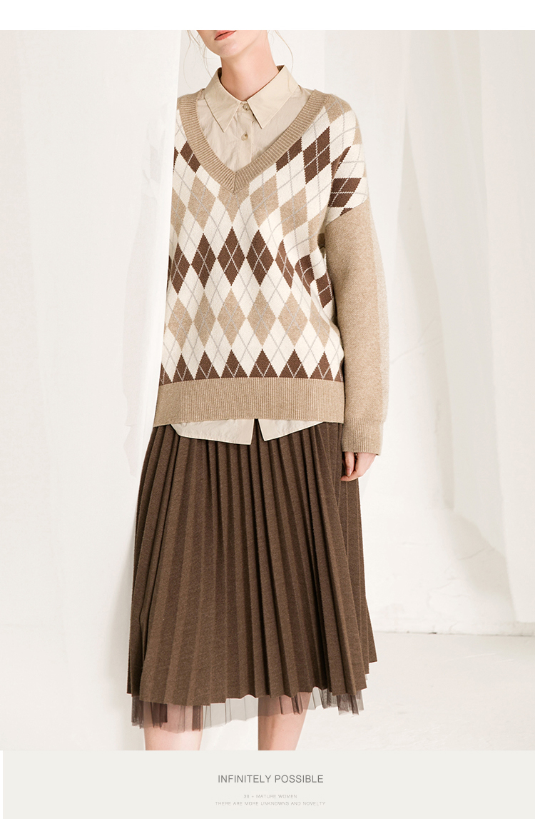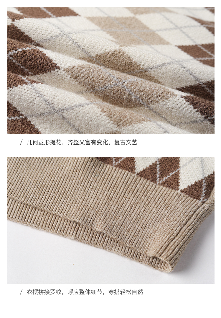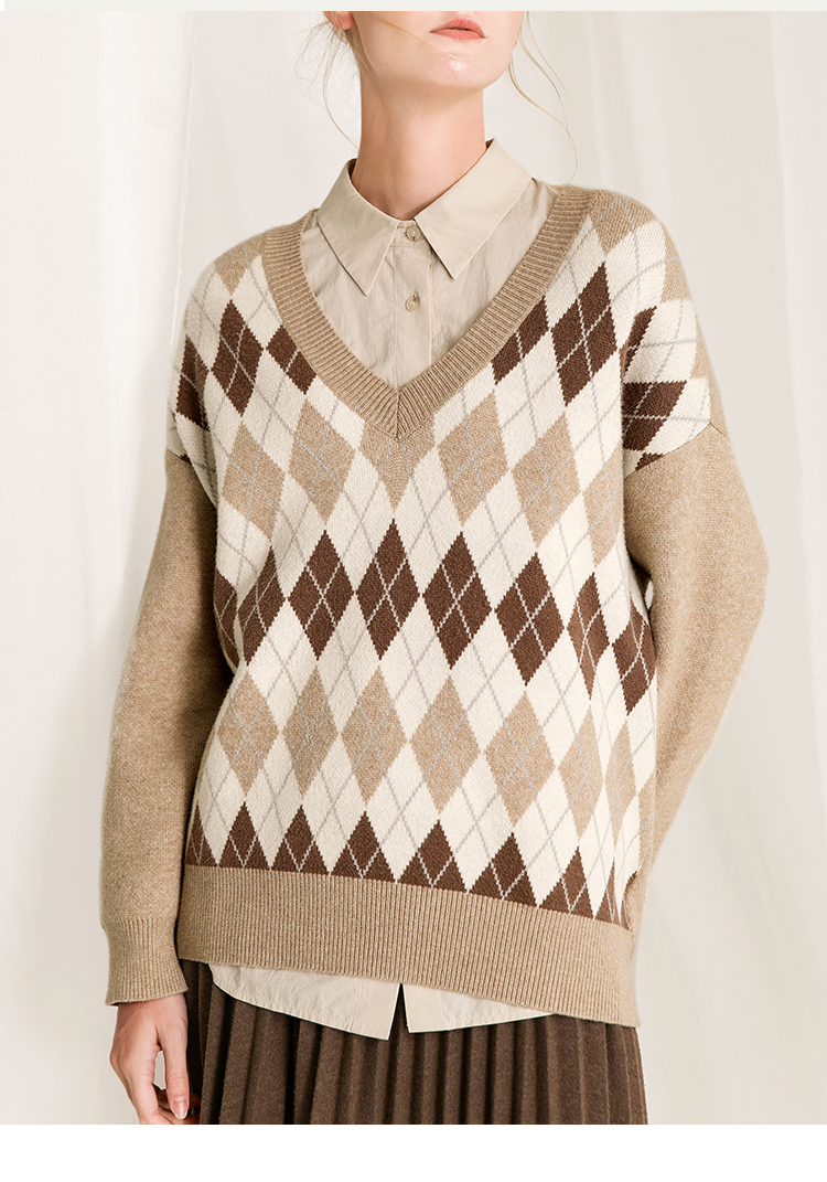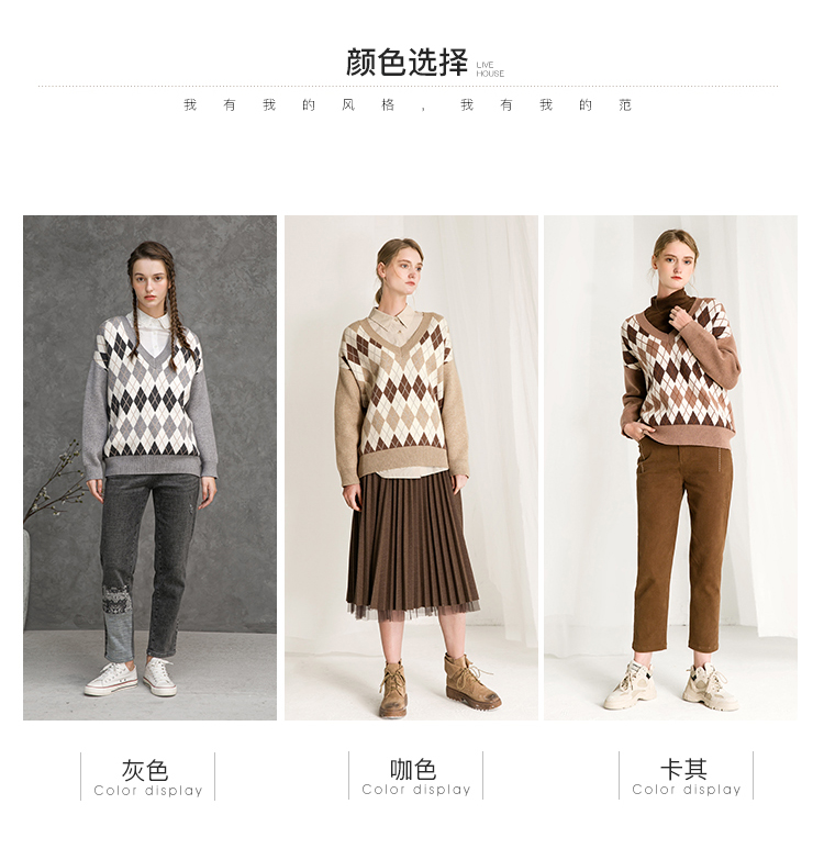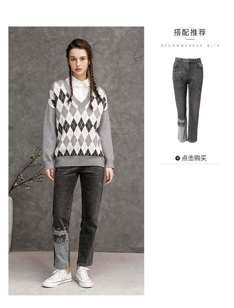Famecoco范可儿毛衣女菱形方块冬季宽松灰色针织衫F218DD002