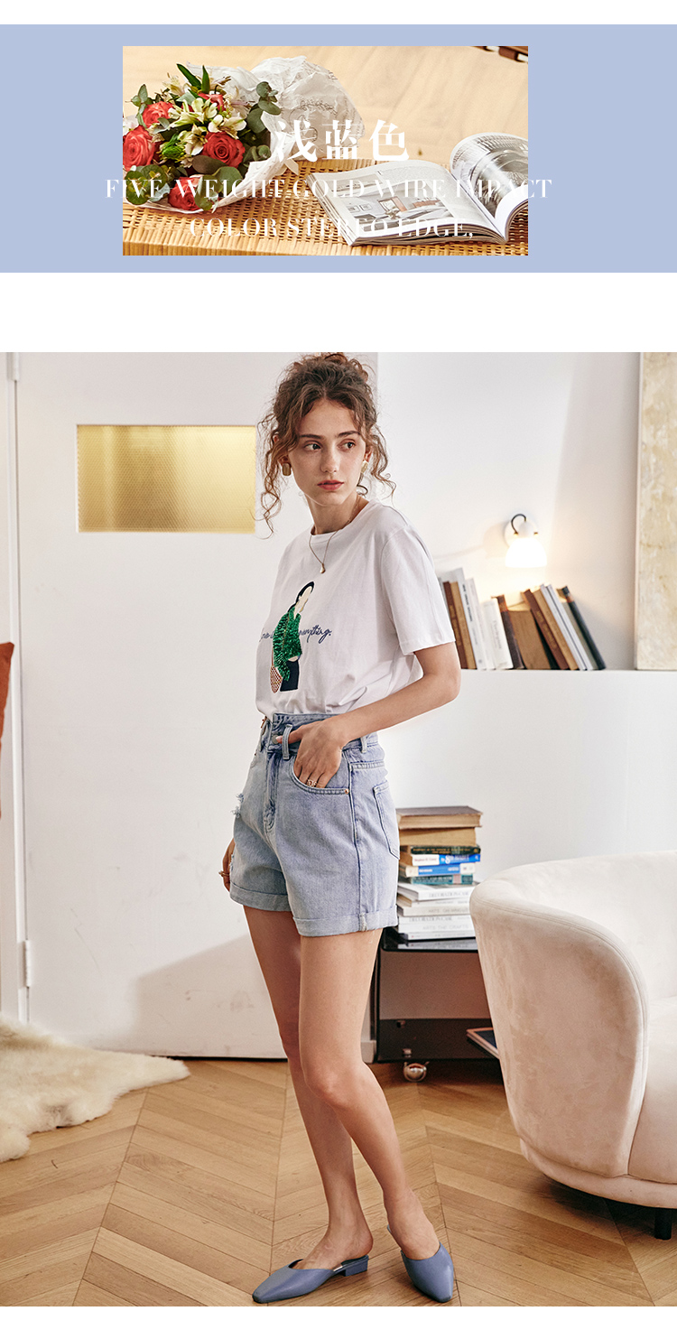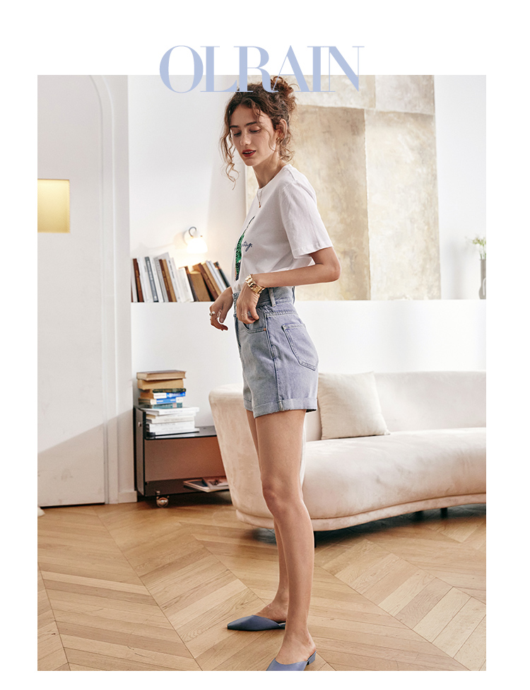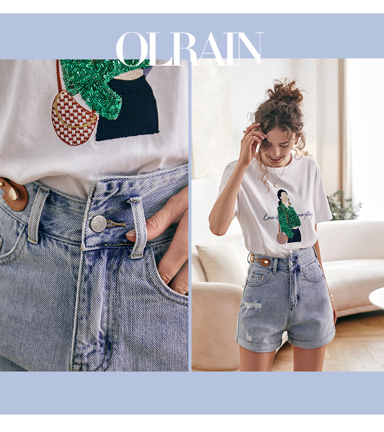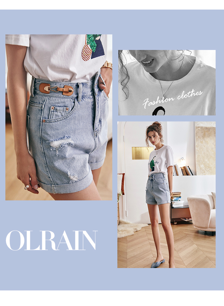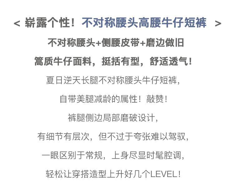欧芮儿浅蓝色牛仔裤女2021新款夏高腰显瘦不对称磨边薄款直筒短裤