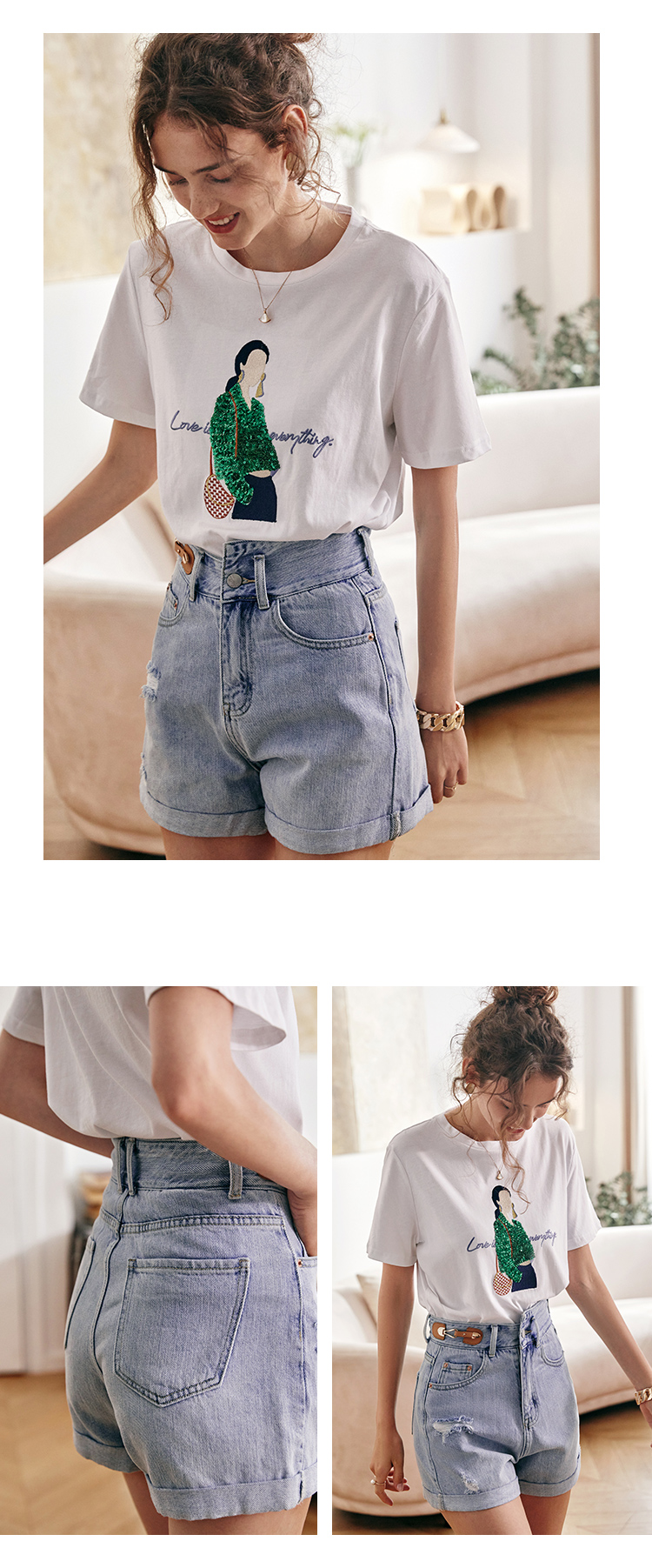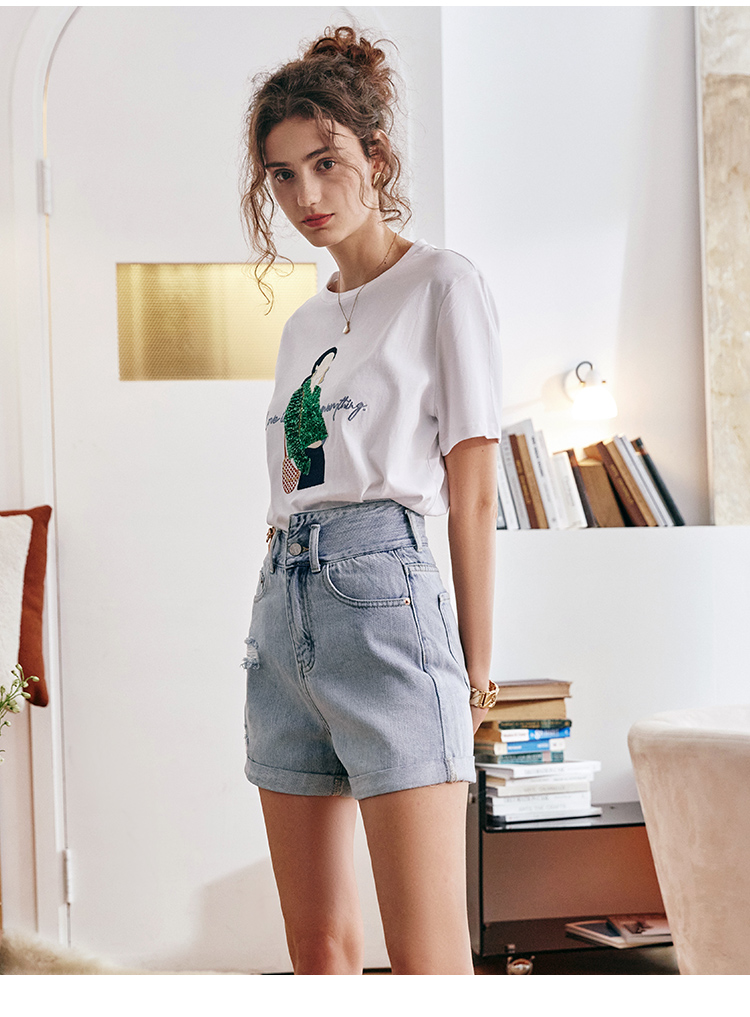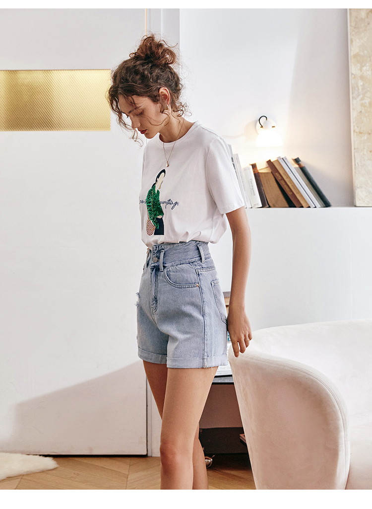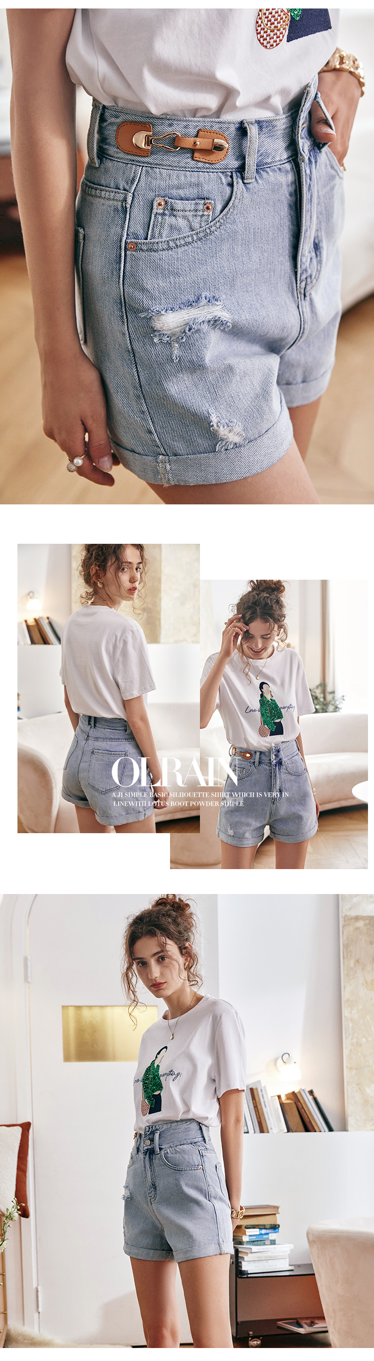 欧芮儿浅蓝色牛仔裤女2021新款夏高腰显瘦不对称磨边薄款直筒短裤