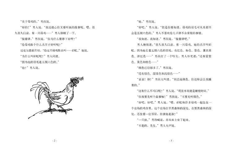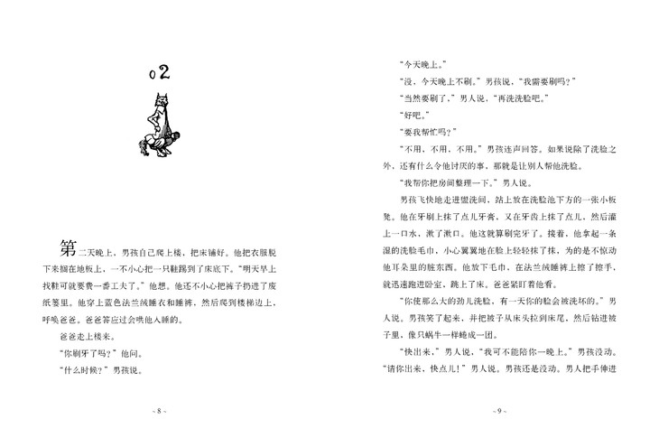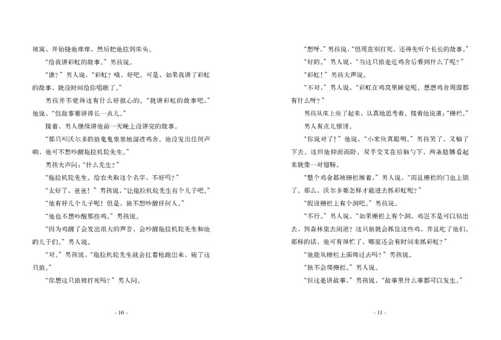 这是一本被埋没的儿童文学经典。睡前故事是大部分家庭搭建“亲子关系”的一段重要时光,一般以父母为孩子朗读故事为主要展开形式。而这本“睡前故事”,它的特色鲜明,独具一格,为家庭提供了一个开展“睡前故事”时光的范例。全文以父子对话的形式呈现,父亲不但讲得生动、有趣、新鲜,而且还能不断满足孩子所期望的故事发展走向,充分体现出这位父亲不凡的故事讲述能力;而孩子天马行空的想象力也对故事的创作起到了积极的作用……父亲和儿子共同让故事无限制地发展下去,从睡前故事时间延伸到了周末出游,而父子之间的温暖与和谐,更使得整个故事不断地向着更加新颖、独特的方向发展……谁也无法预测故事的结局。这本书值得被每个家庭一遍又一遍朗读。