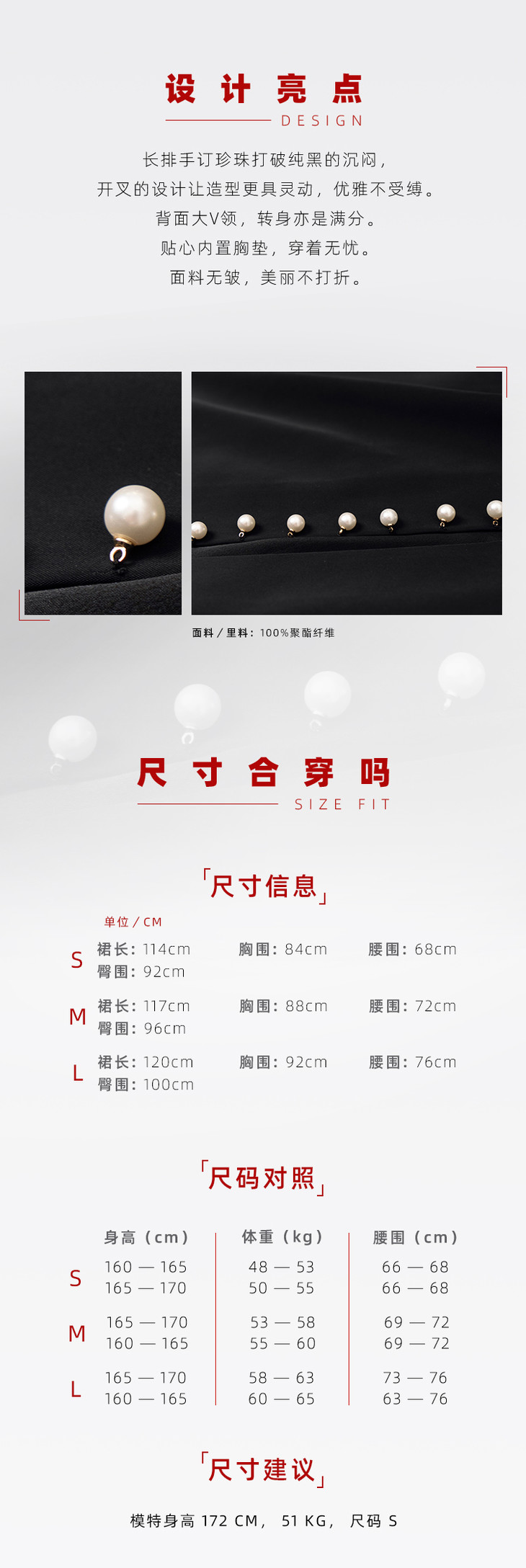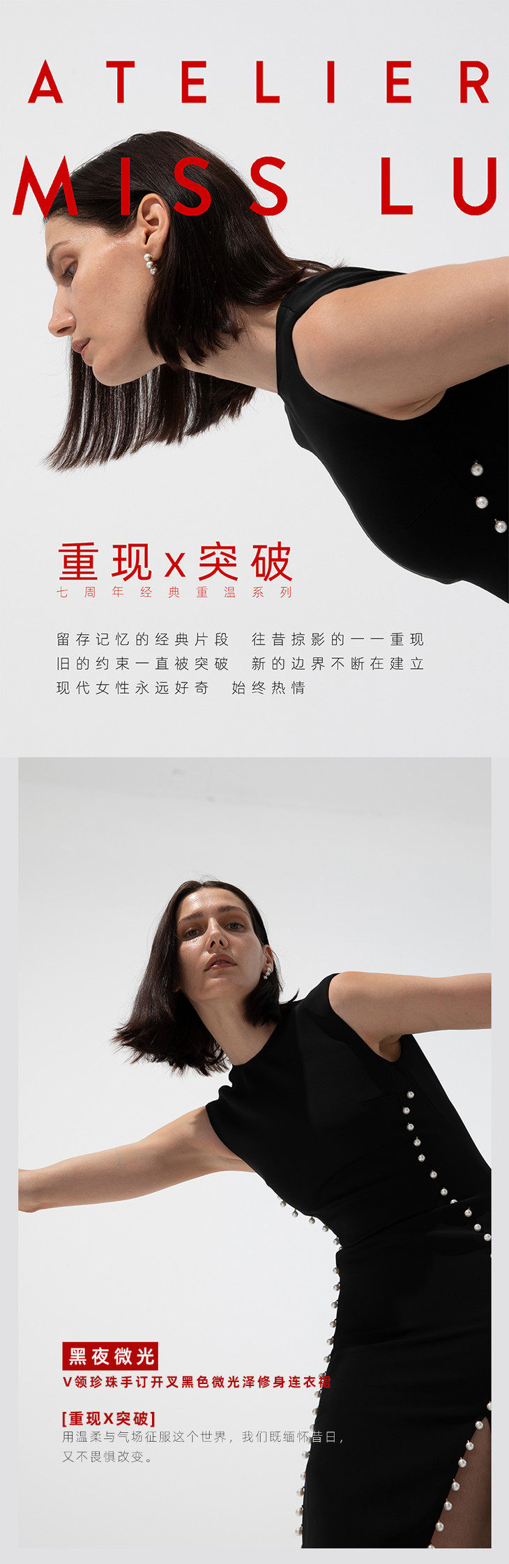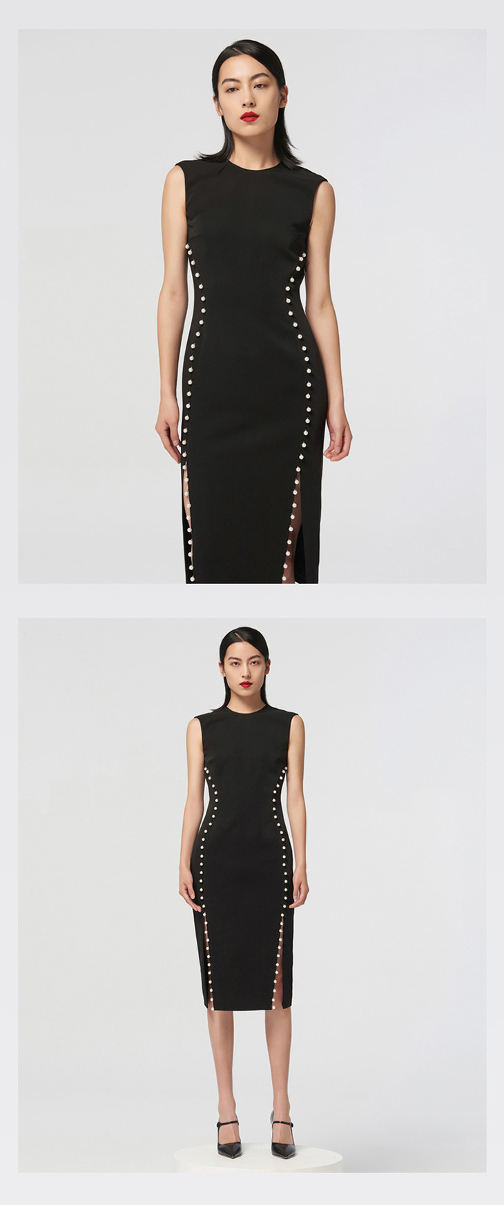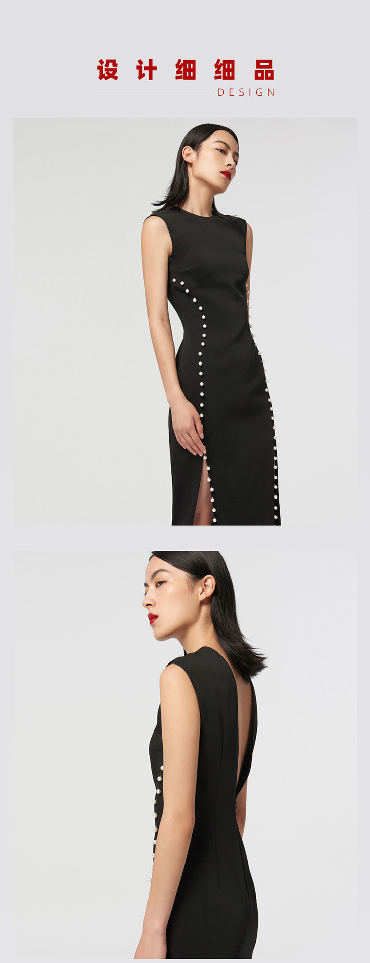 【黑夜微光】AtelierMissLu 后背V领珍珠手订开叉黑色微光泽修身连衣裙/0000674